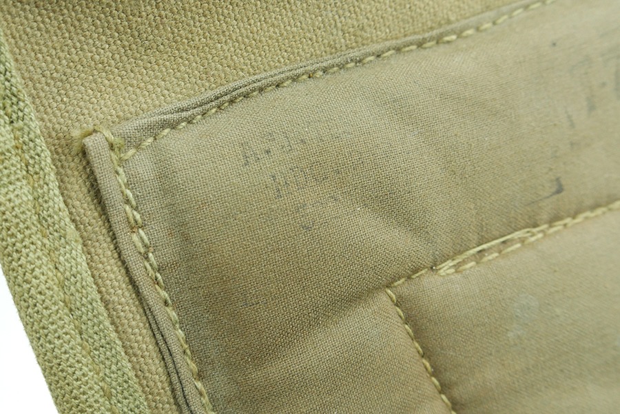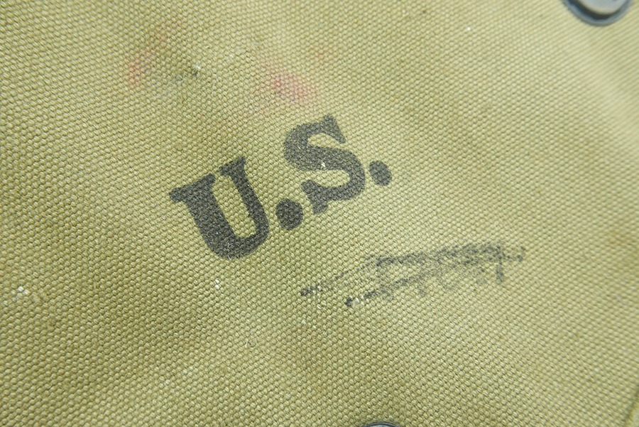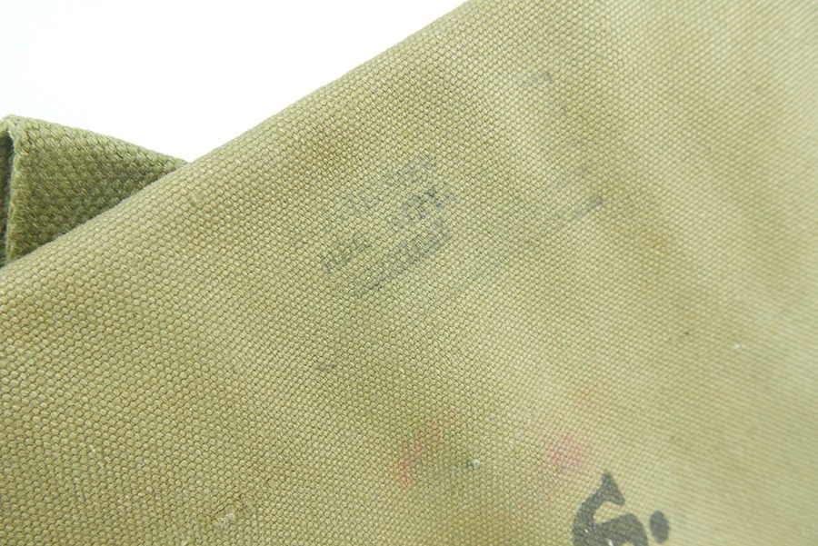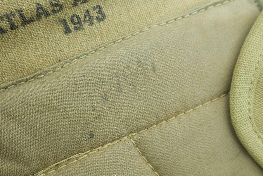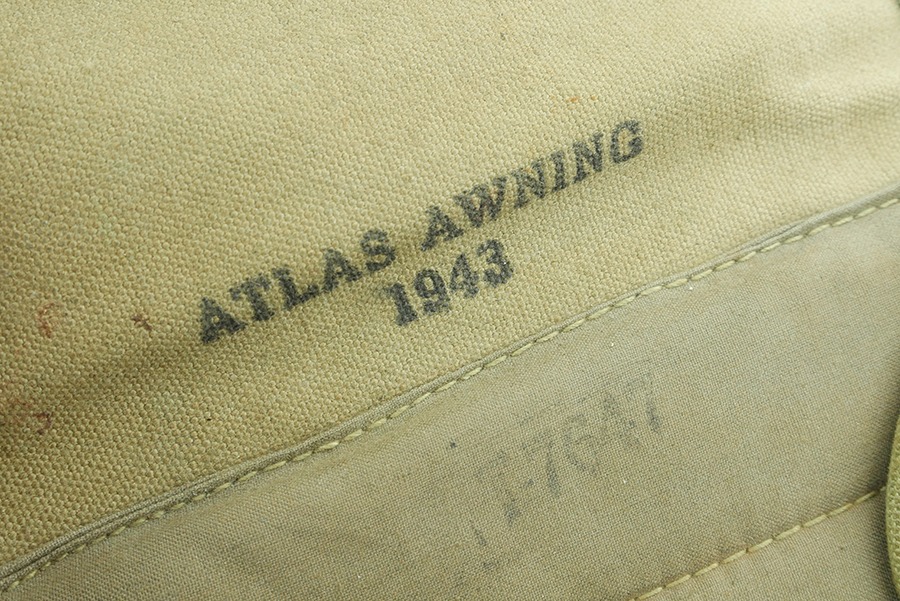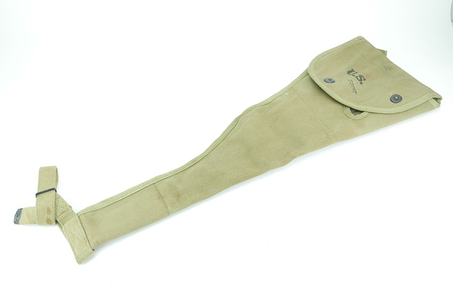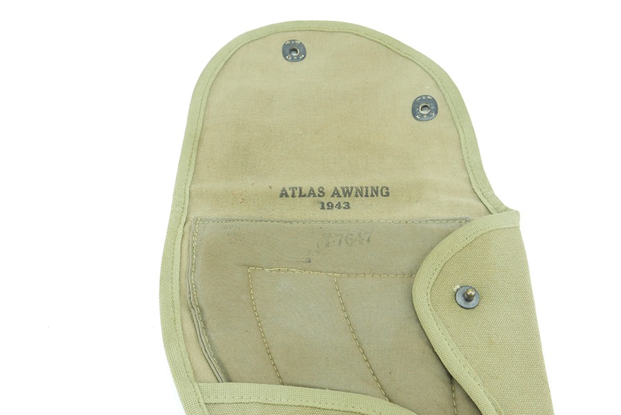 11/19/24 – This is a great example of a 1943 M1 Carbine Canvas Jump Scabbard, made by Atlas Awning. These bags were created for airborne troops to keep their M1 Carbine rifles safe and intact during a jump. This scabbard is made of thick durable canvas, the canvas does have some stains but is in overall great condition. The stamps on this scabbard are still very strong and easily legible. The stitching on this scabbard remains strong and intact.
