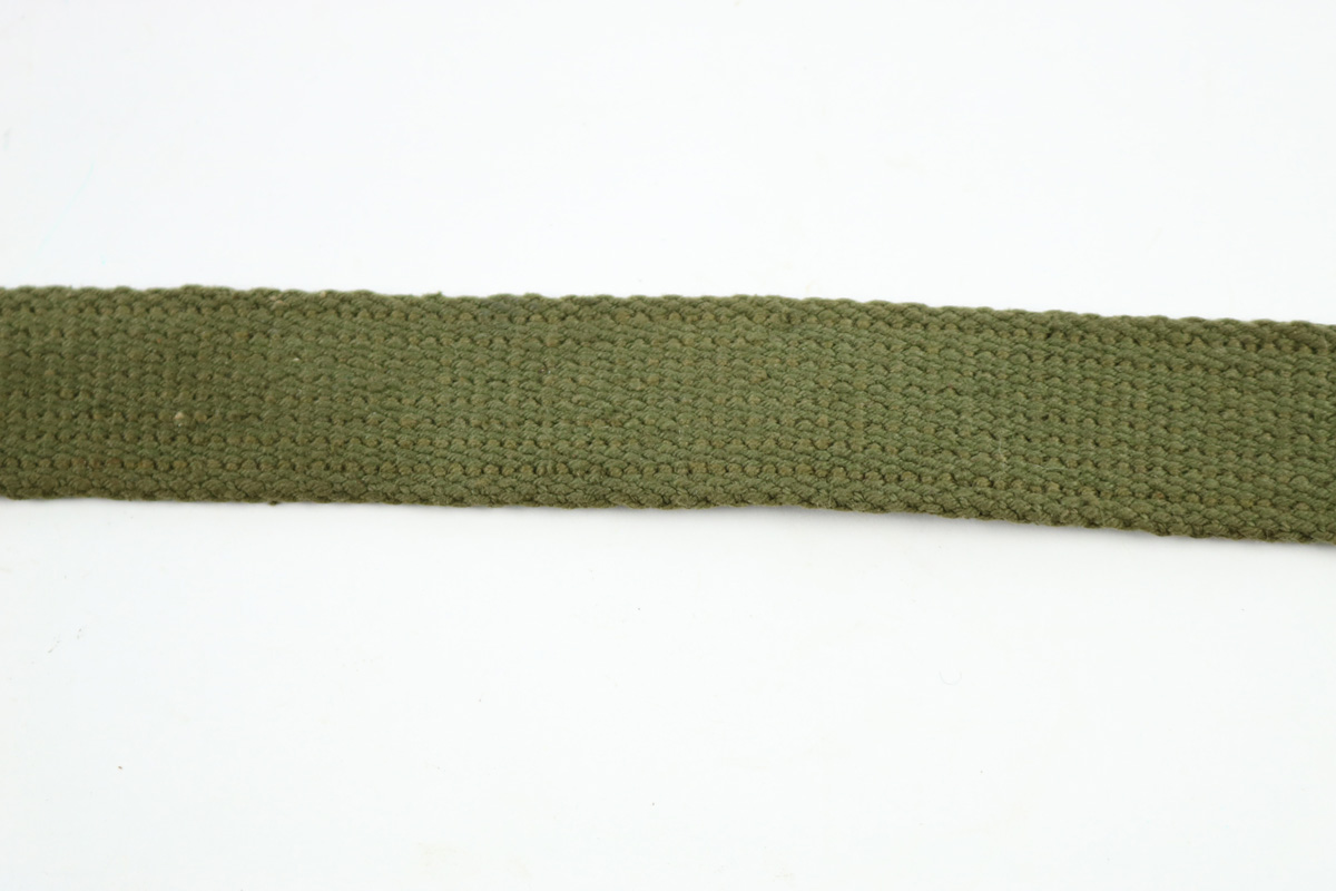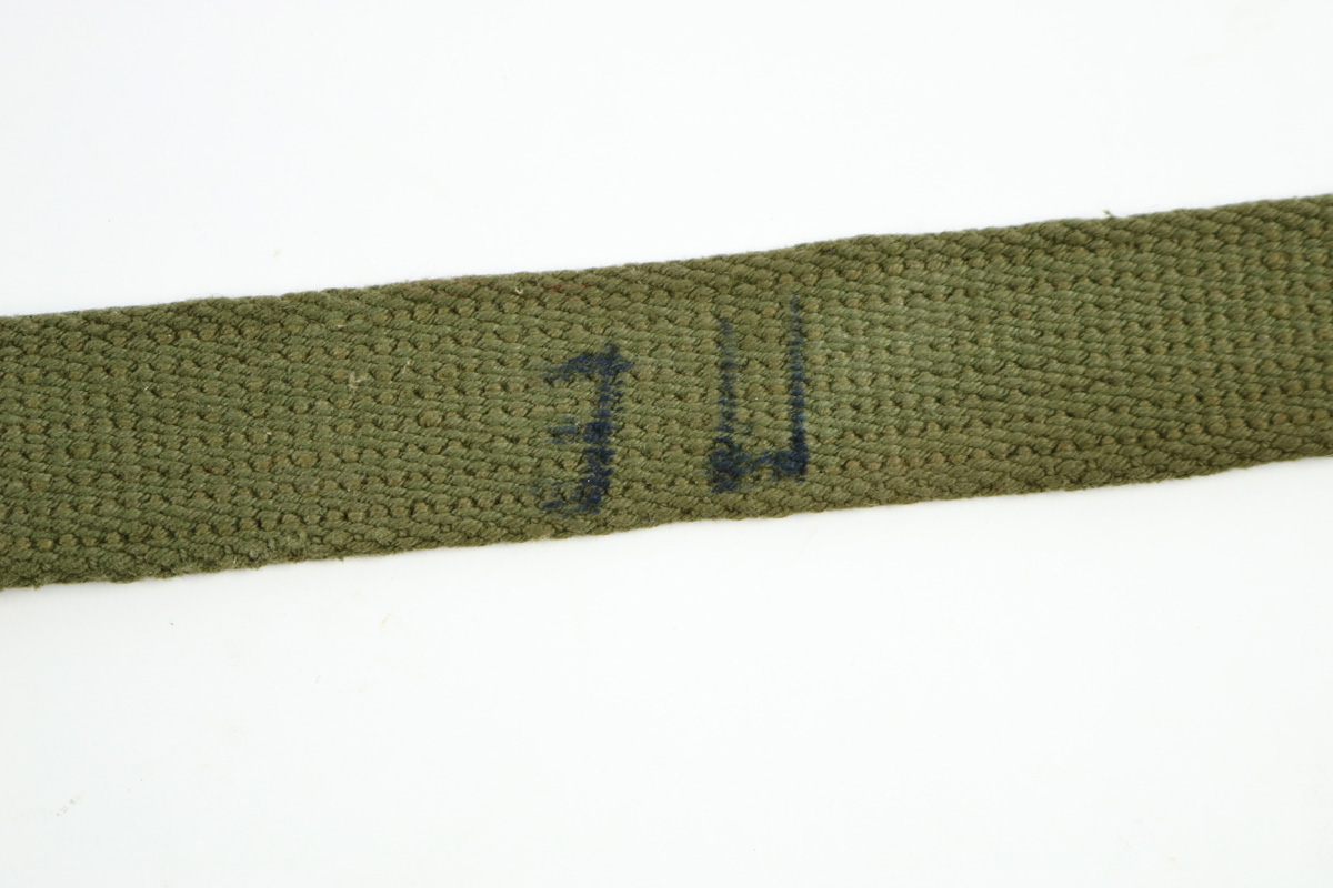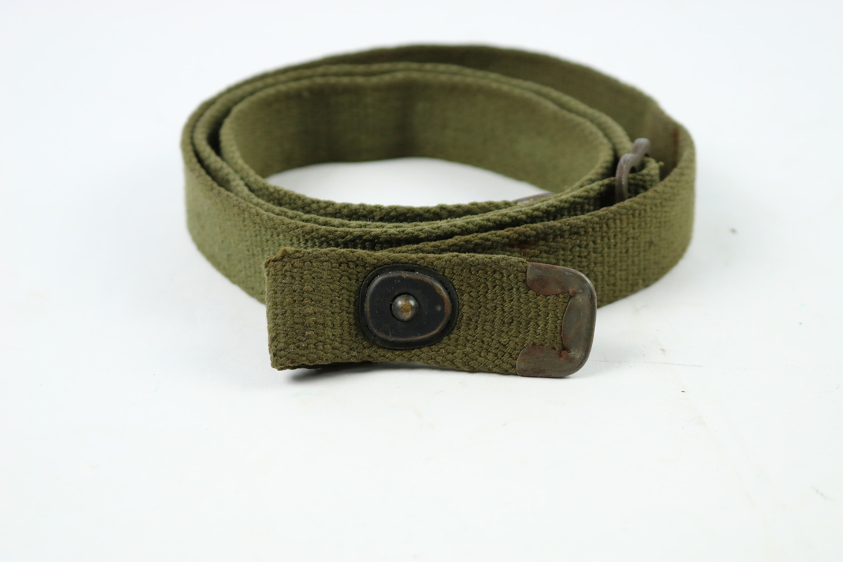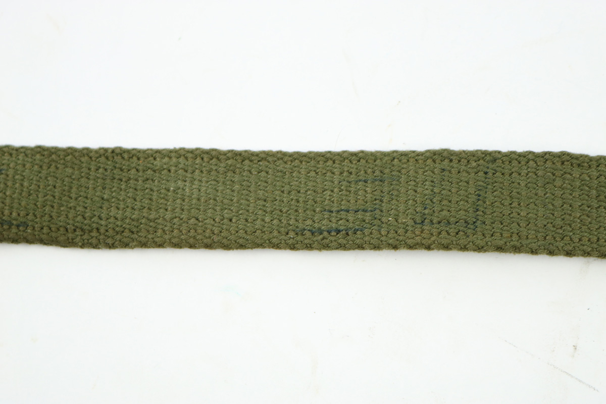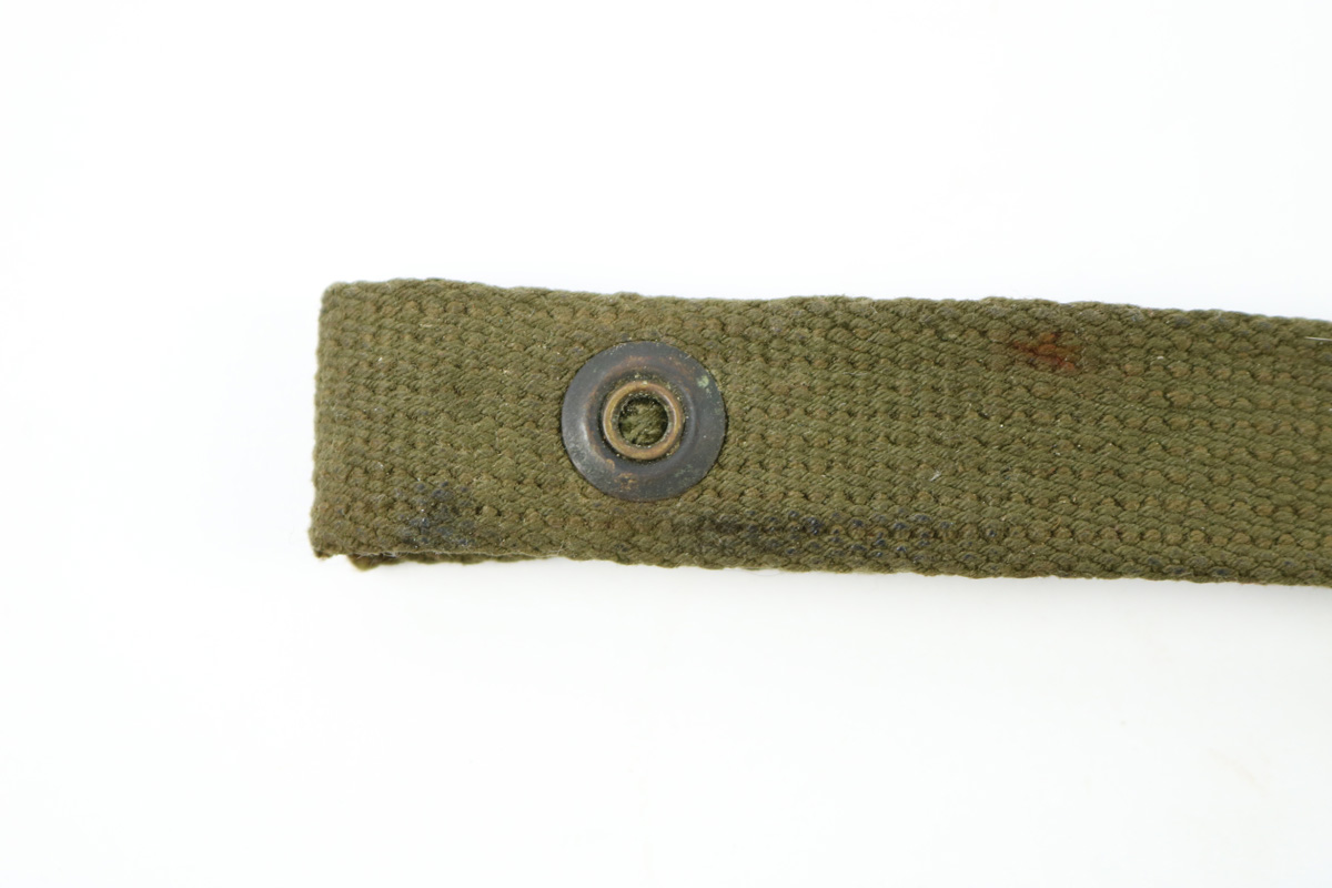10/2/18 – This is an original WW2 era production M1 carbine rifle strap. The strap has is guaranteed original and has correct “C” end clamps. The canvas has minimal fraying and is strong. There are some rust stains in places as well as serial numbers written on the canvas (interior side). The strap overall is in very good condition.