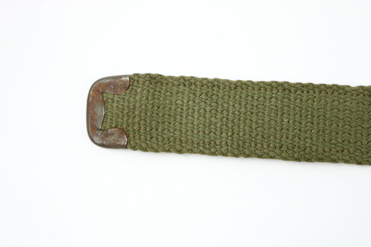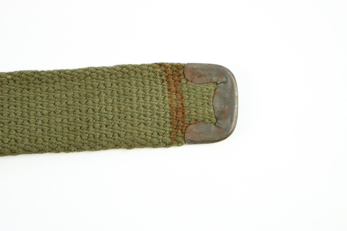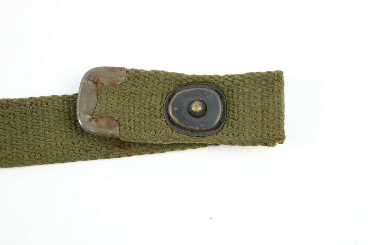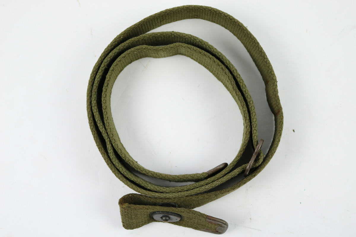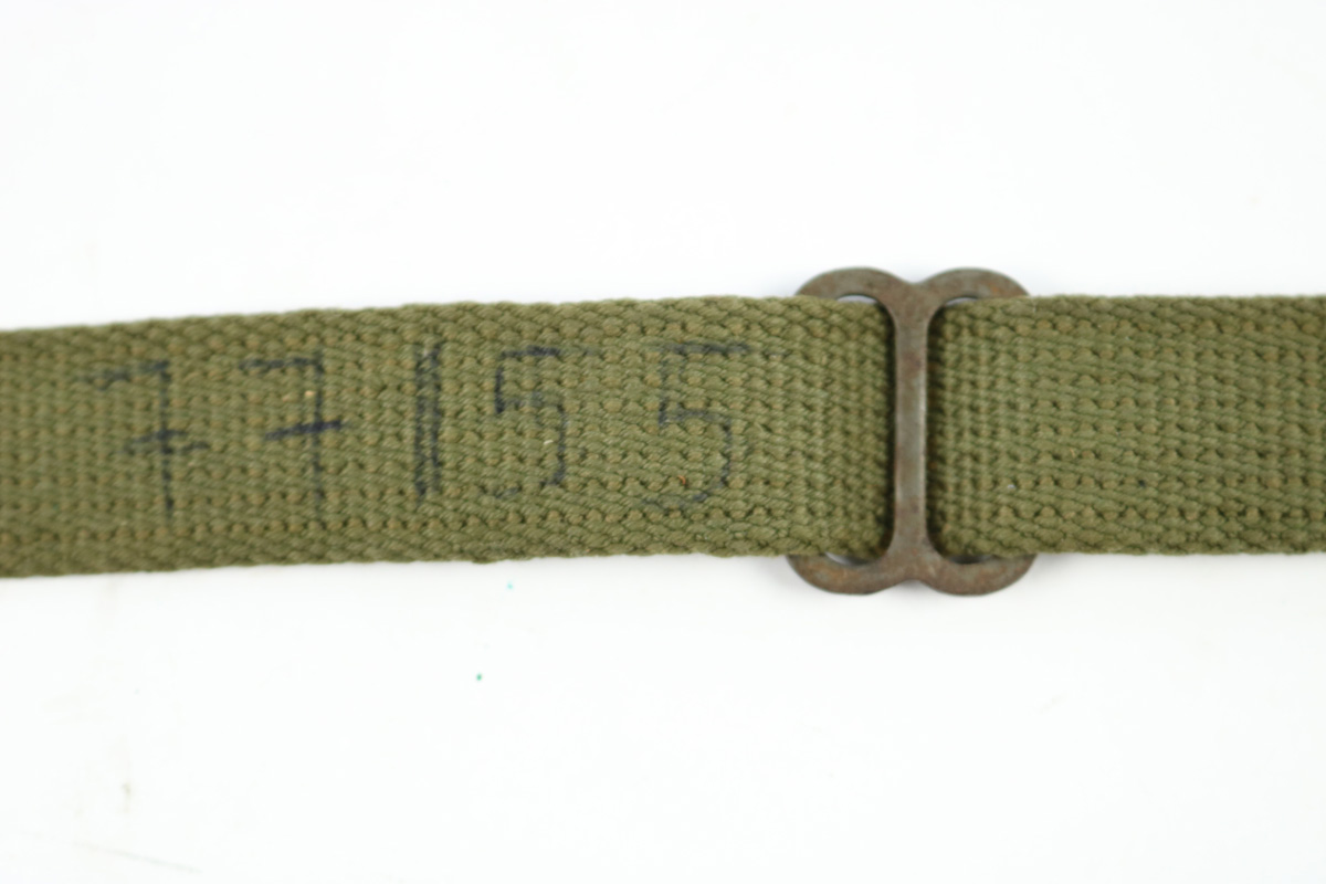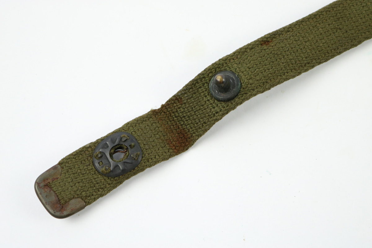 10/2/18 – This is an original WW2 era production M1 carbine rifle strap. The strap has is guaranteed original and has correct “C” end clamps. The canvas has minimal fraying and is strong. There are some rust stains in places as well as serial numbers written on the canvas (interior side). The strap overall is in very good condition.