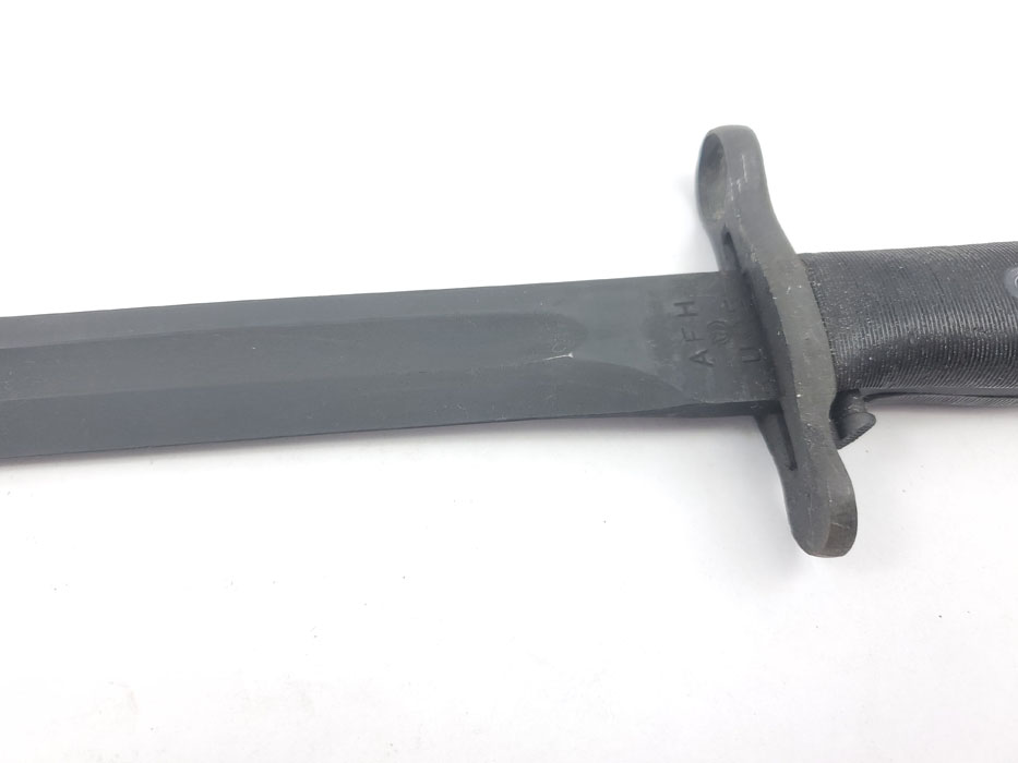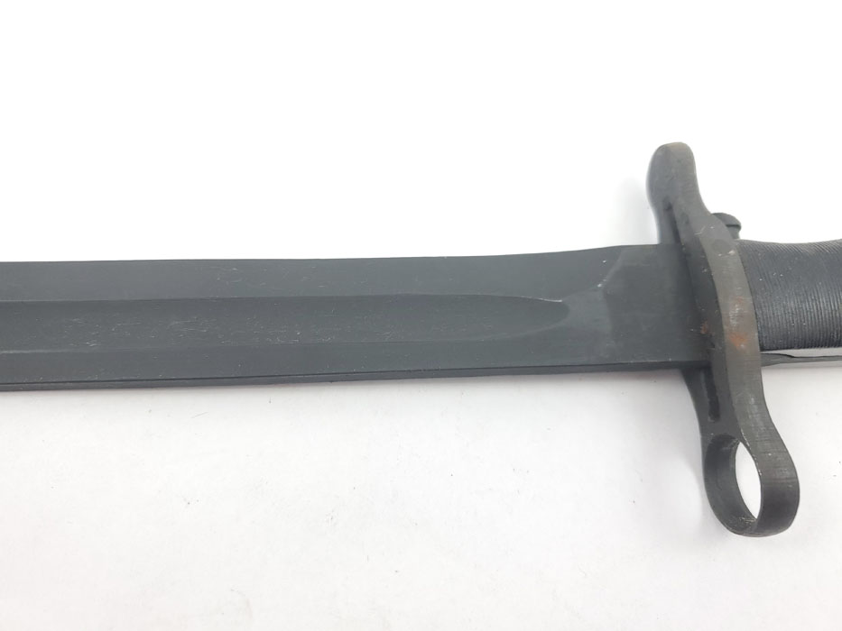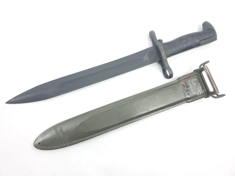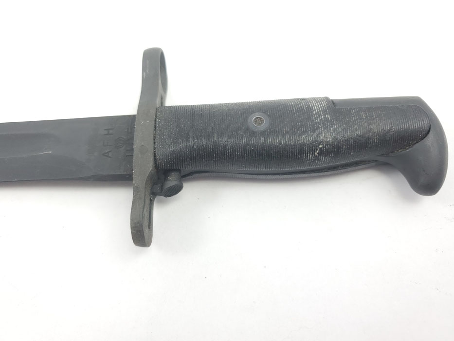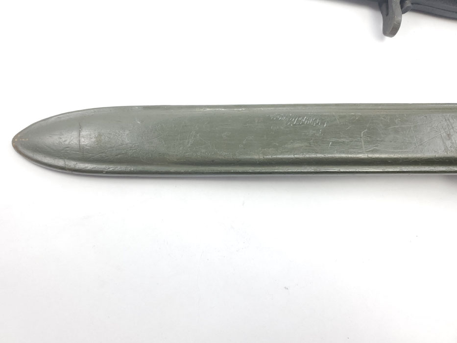 4/7/20 – This is an original M1 Garand bayonet from WW2. The bayonet has been cut, as most were by arsenals during the war. The blade has excellent finish and is marked with AFH, a flaming bomb, and US underneath. The handle has no issues with no cracks or chips. The scabbard appears it could have been repainted at some point, and there is some light finish loss / scuffing in a few areas.