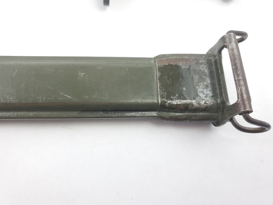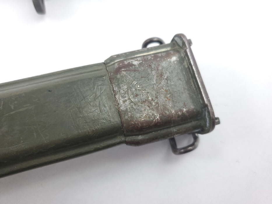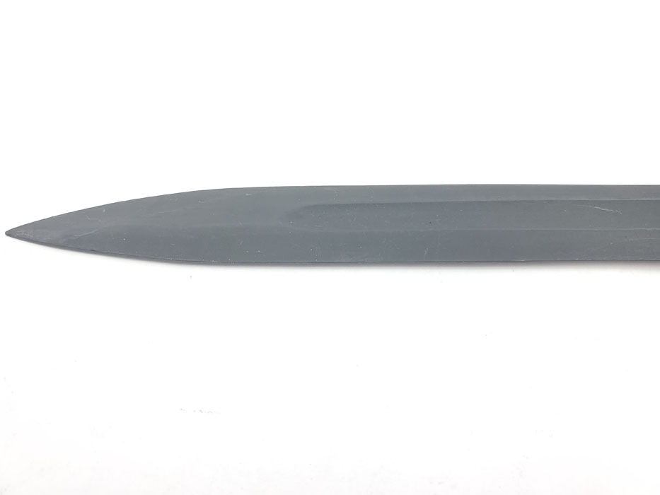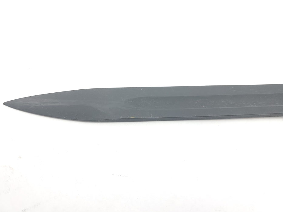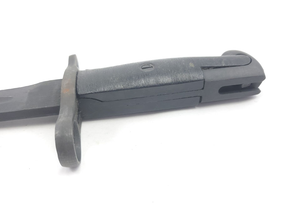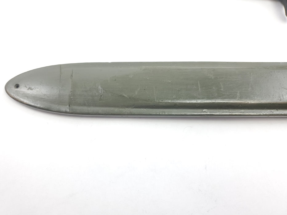 4/7/20 – This is an original M1 Garand bayonet from WW2. The bayonet has been cut, as most were by arsenals during the war. The blade has excellent finish and is marked with AFH, a flaming bomb, and US underneath. The handle has no issues with no cracks or chips. The scabbard appears it could have been repainted at some point, and there is some light finish loss / scuffing in a few areas.