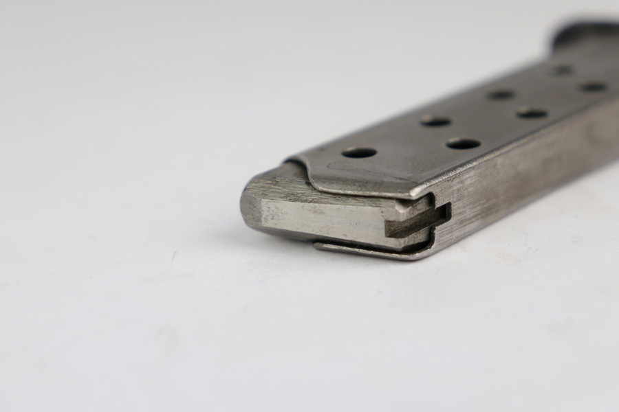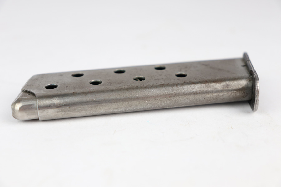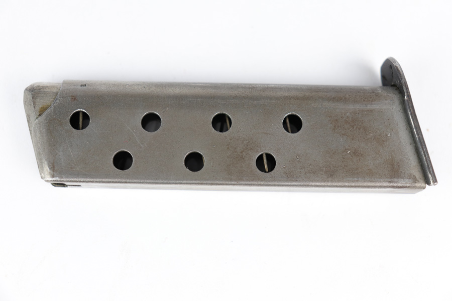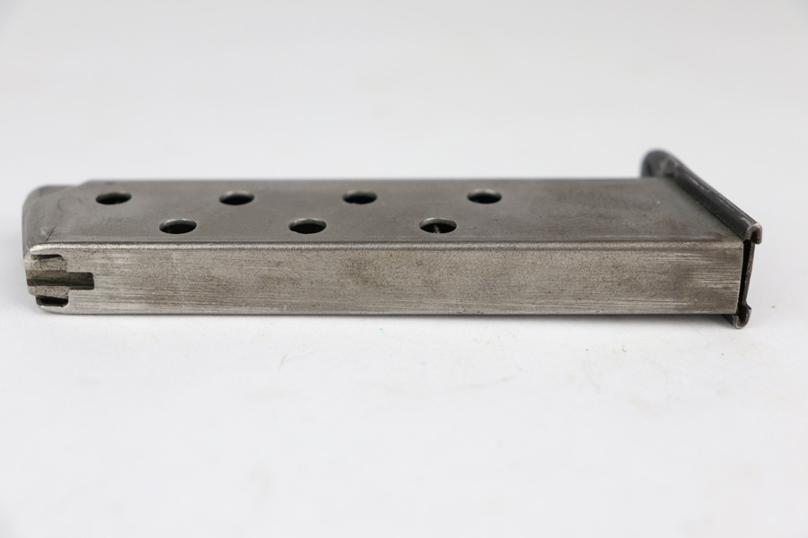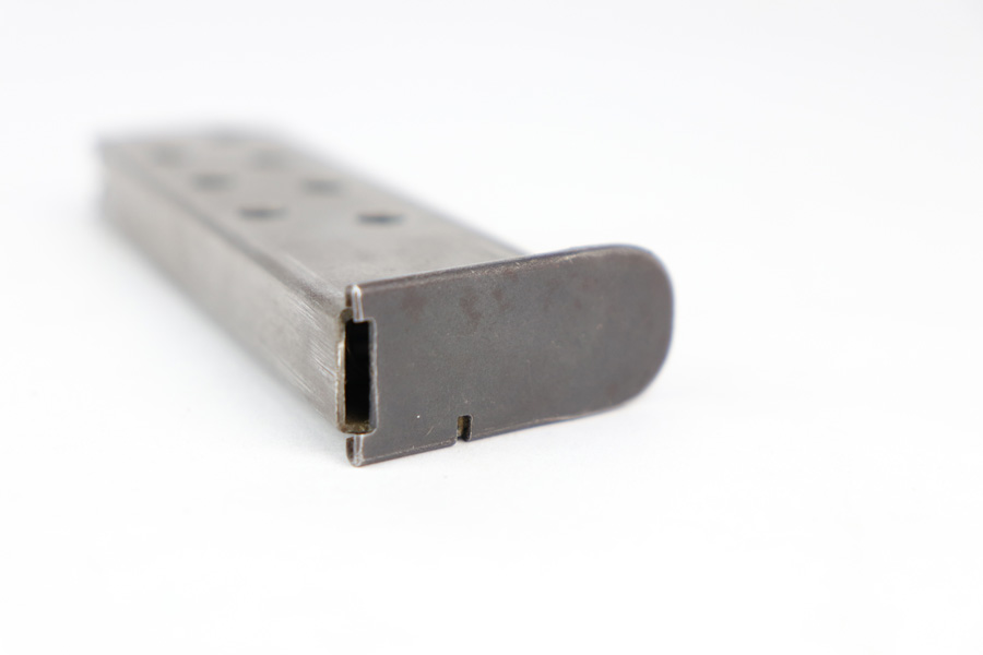 12/17/18 – This is an original Mauser HSc magazine made during WW2. The magazine is wartime / late war variation with a flat base and no markings. The frame is phosphated and has light browning patina in a few places as shown in photos. The base is blued and has light wear as well, but overall this magazine is in great shape with a fully functional spring. Guaranteed original.