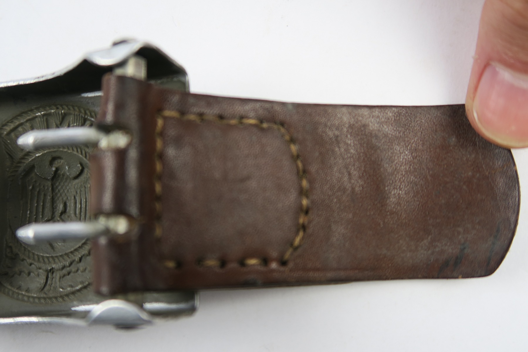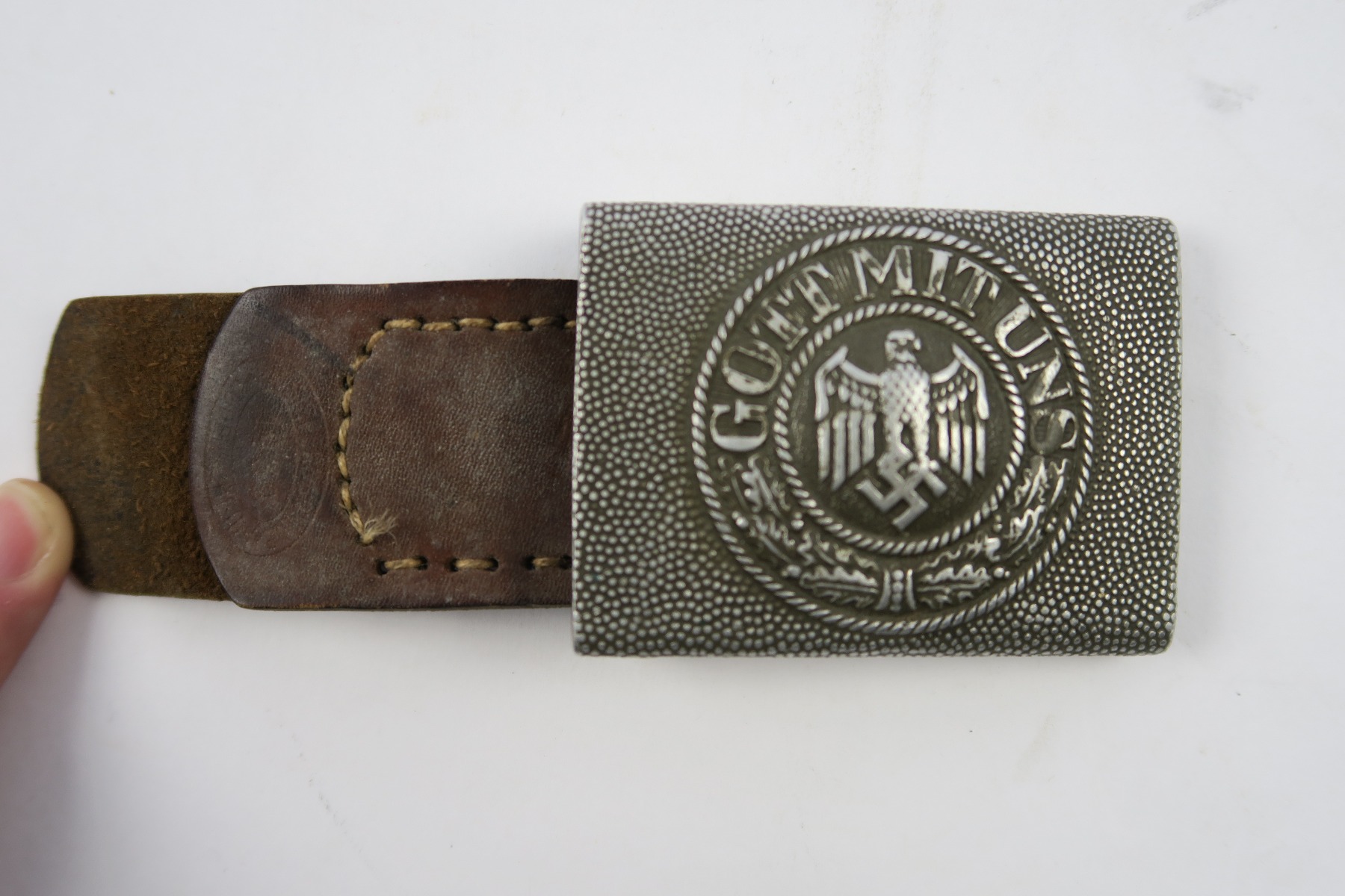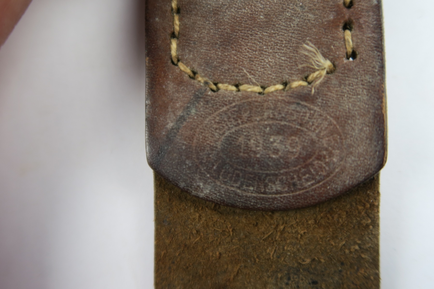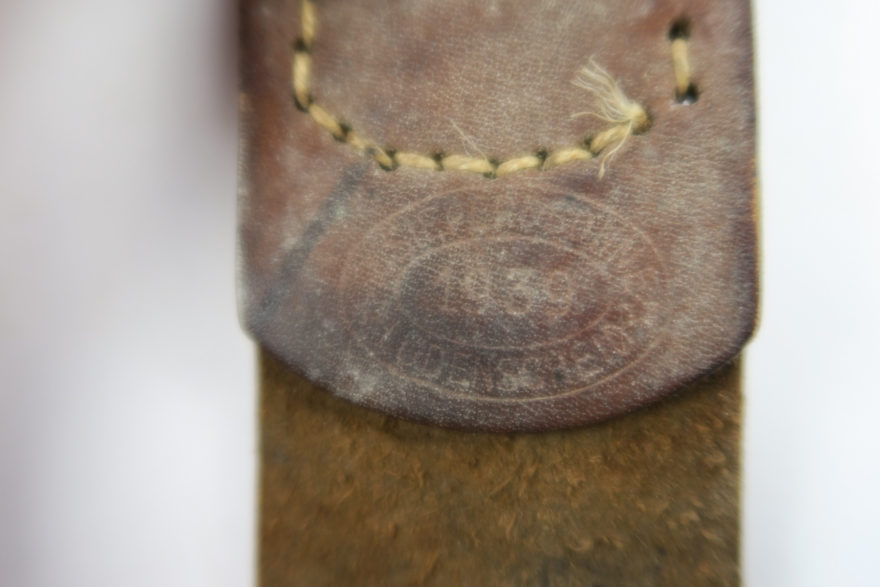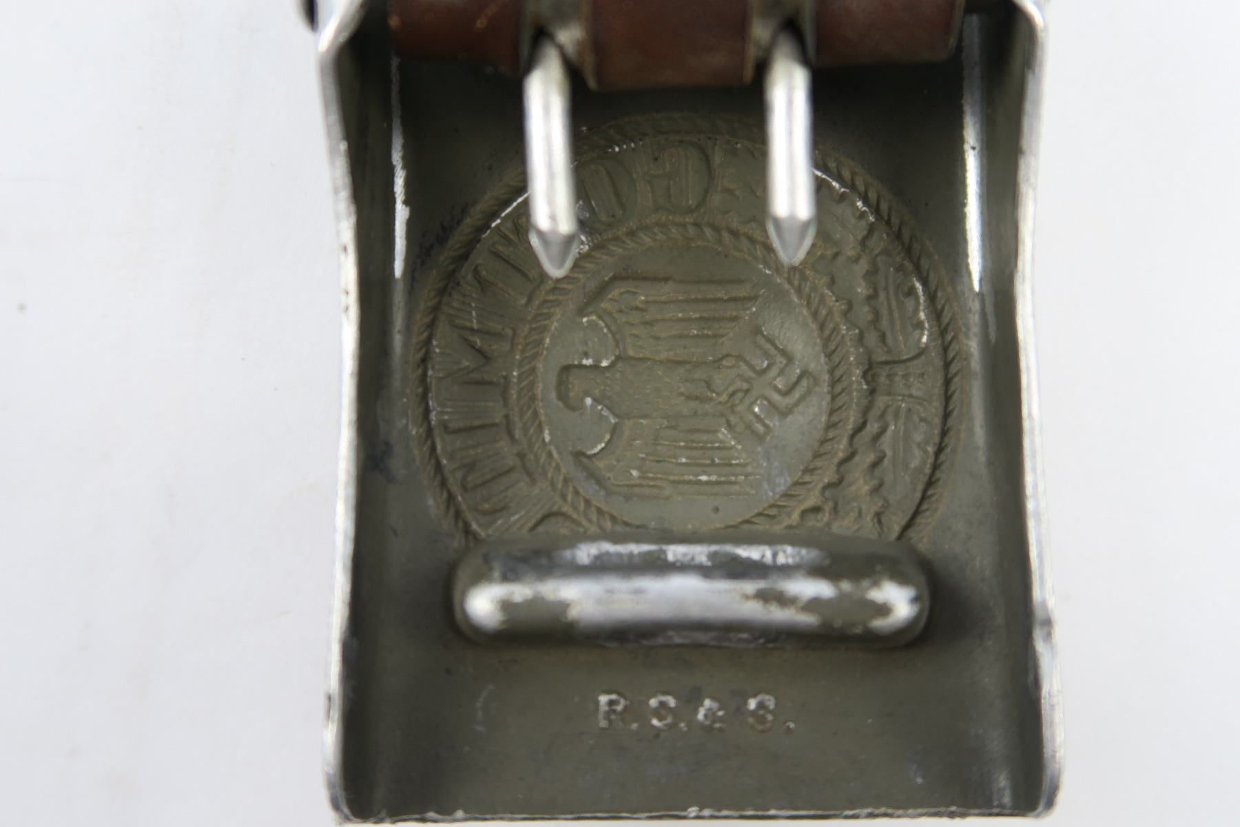 4/26/18 – This is an original military belt buckle with leather tab. The leather tab has a maker stamp and 1939 date. The buckle is “R.S.&S.” stamped. Great condition and guaranteed original and authentic!