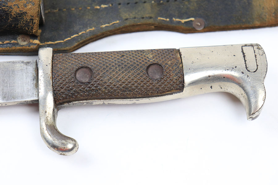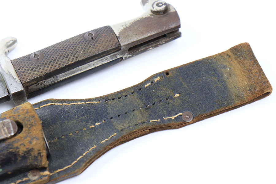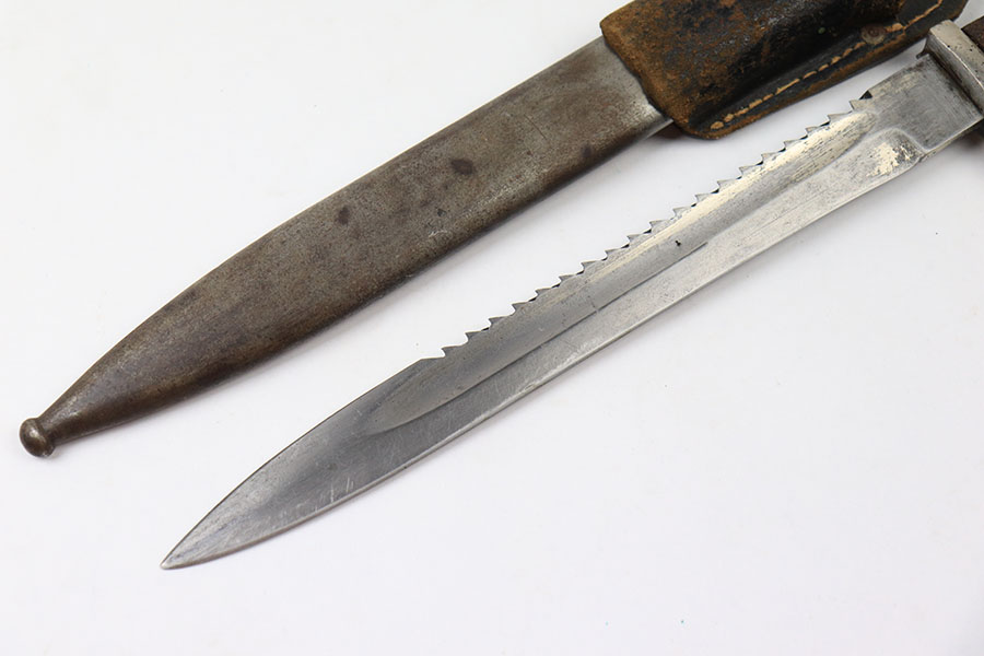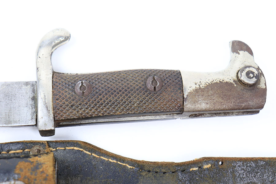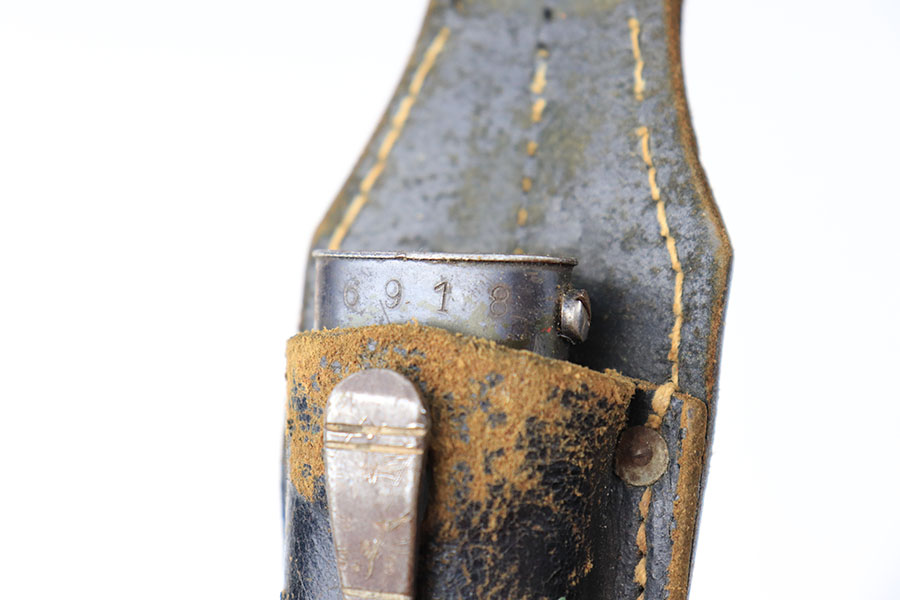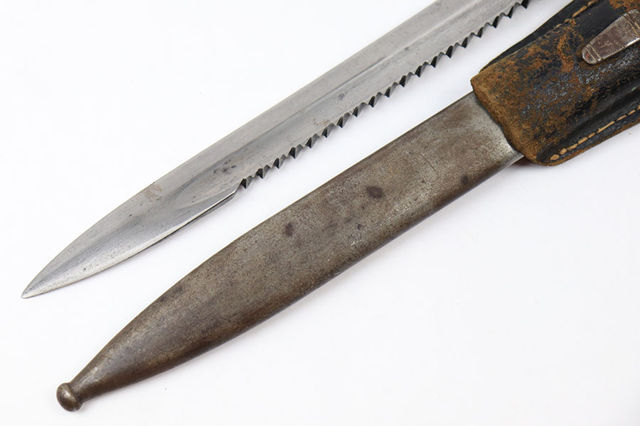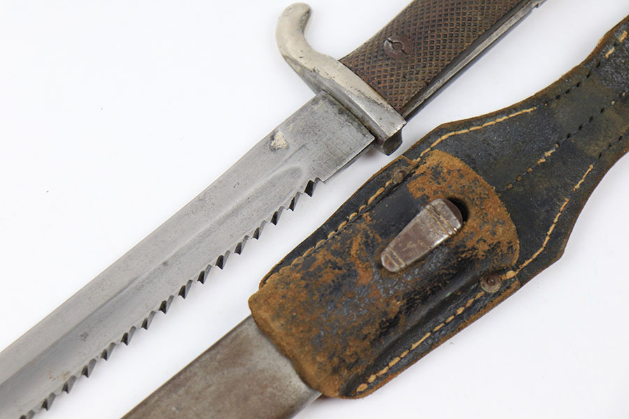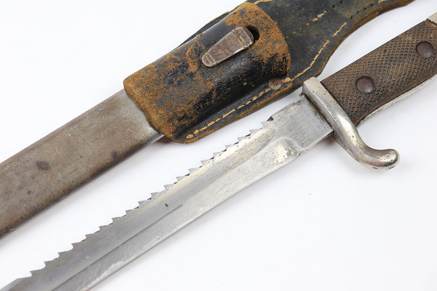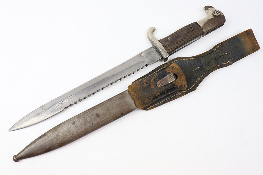 9/13/21 – This is a fairly unusual WW1 era production Sawback Bayonet that appears to be cut down and modified for use again during WW2. The bayonet comes with a K98 scabbard and black leather frog. The bayonet blade is unmarked and in great overall condition with some mild surface wear. Appears to have been factory or uniformly sharpened along the edge (likely for WW2 re-use). A fairly interesting piece of history.