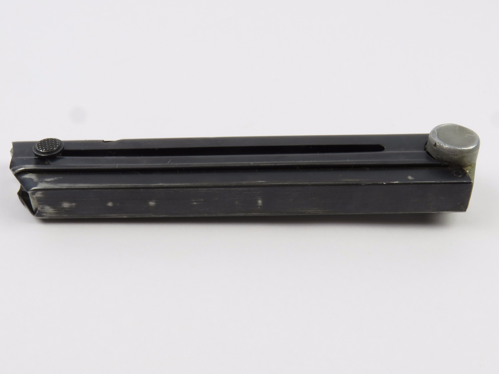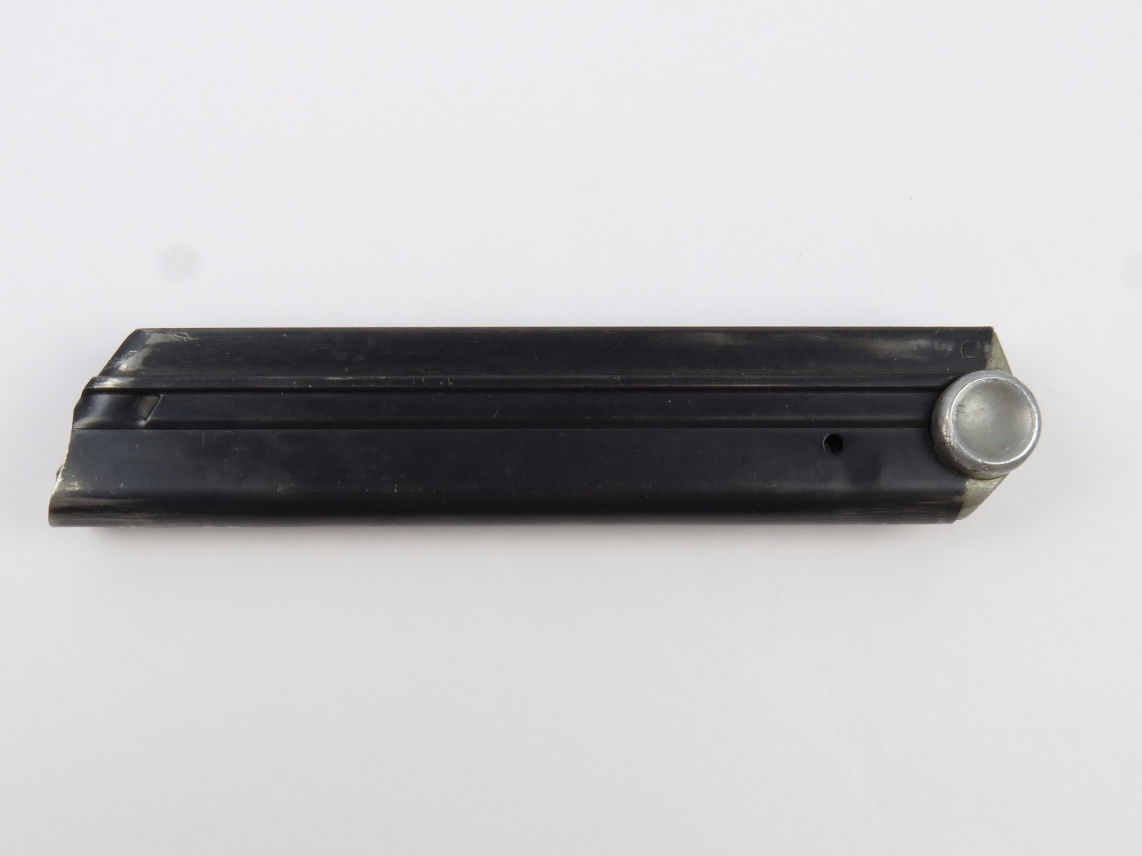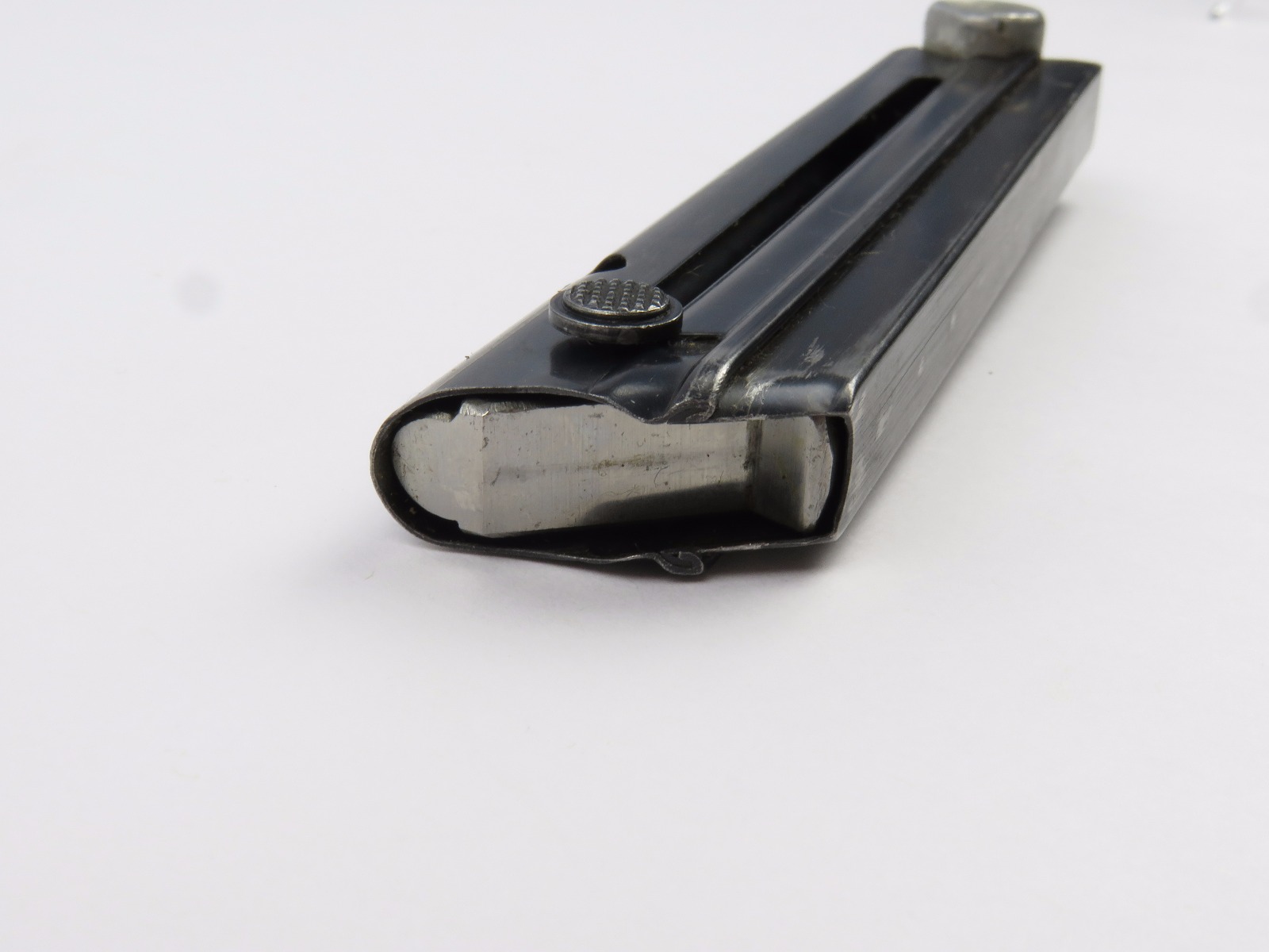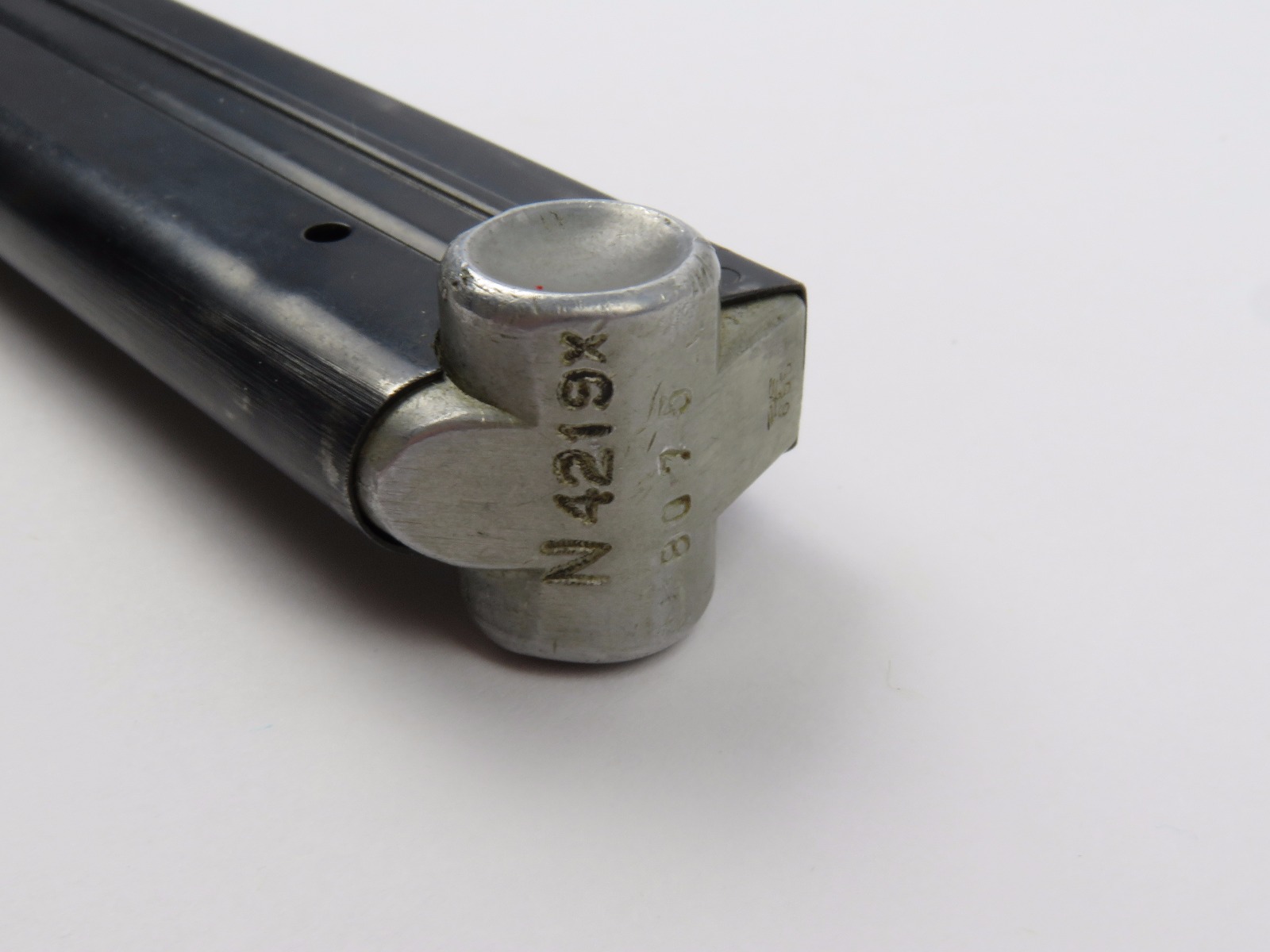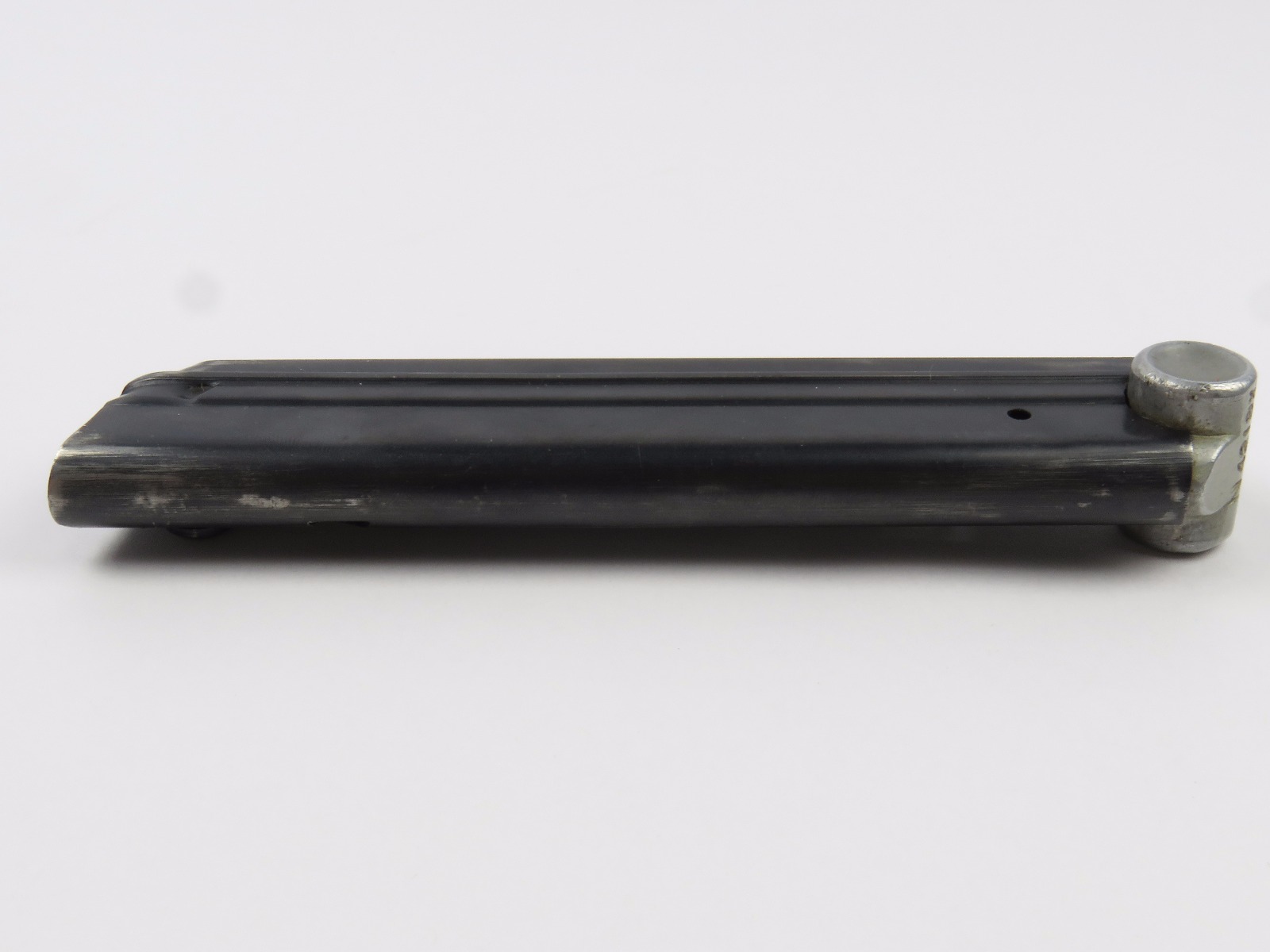 10/16/17 – This is an original WW2 era production Navy Luger magazine. The magazine is excellent and all original with a fully functional, strong spring. The base is stamped with a stick wing eagle 655 military proof stamp and a Nordsee Navy designation stamp. The magazine is also serial numbered 8075. All stamps are original and crisp. The magazine has no rust or pitting and is guaranteed original and authentic.