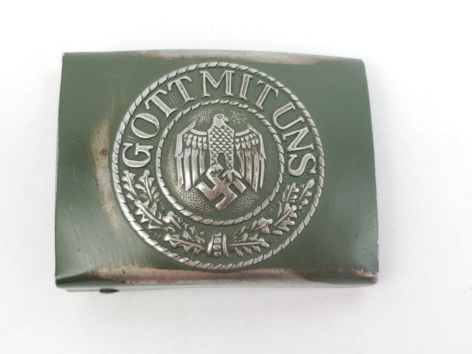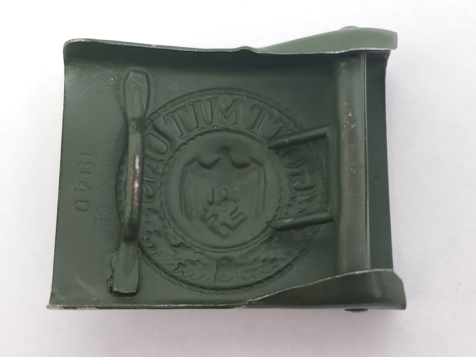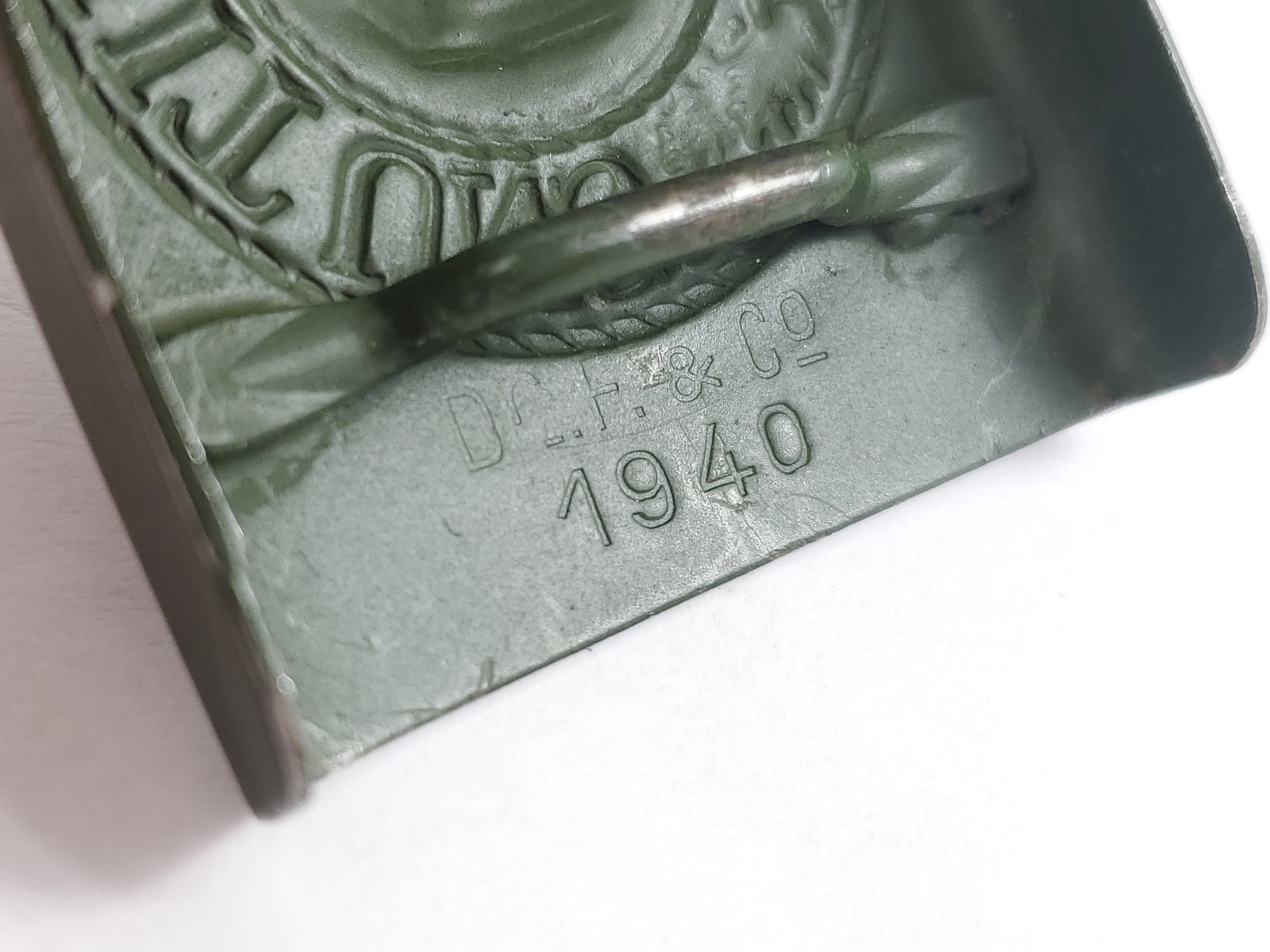 6/10/20 – This is an original WW2 nazi military belt buckle, painted olive green for combat use. The paint is still mostly in tact with some light wear and finish loss on the front of the buckle and edges. The reverse is maker stamped and dated 1940. No dents or functionality issues, overall a nice piece.