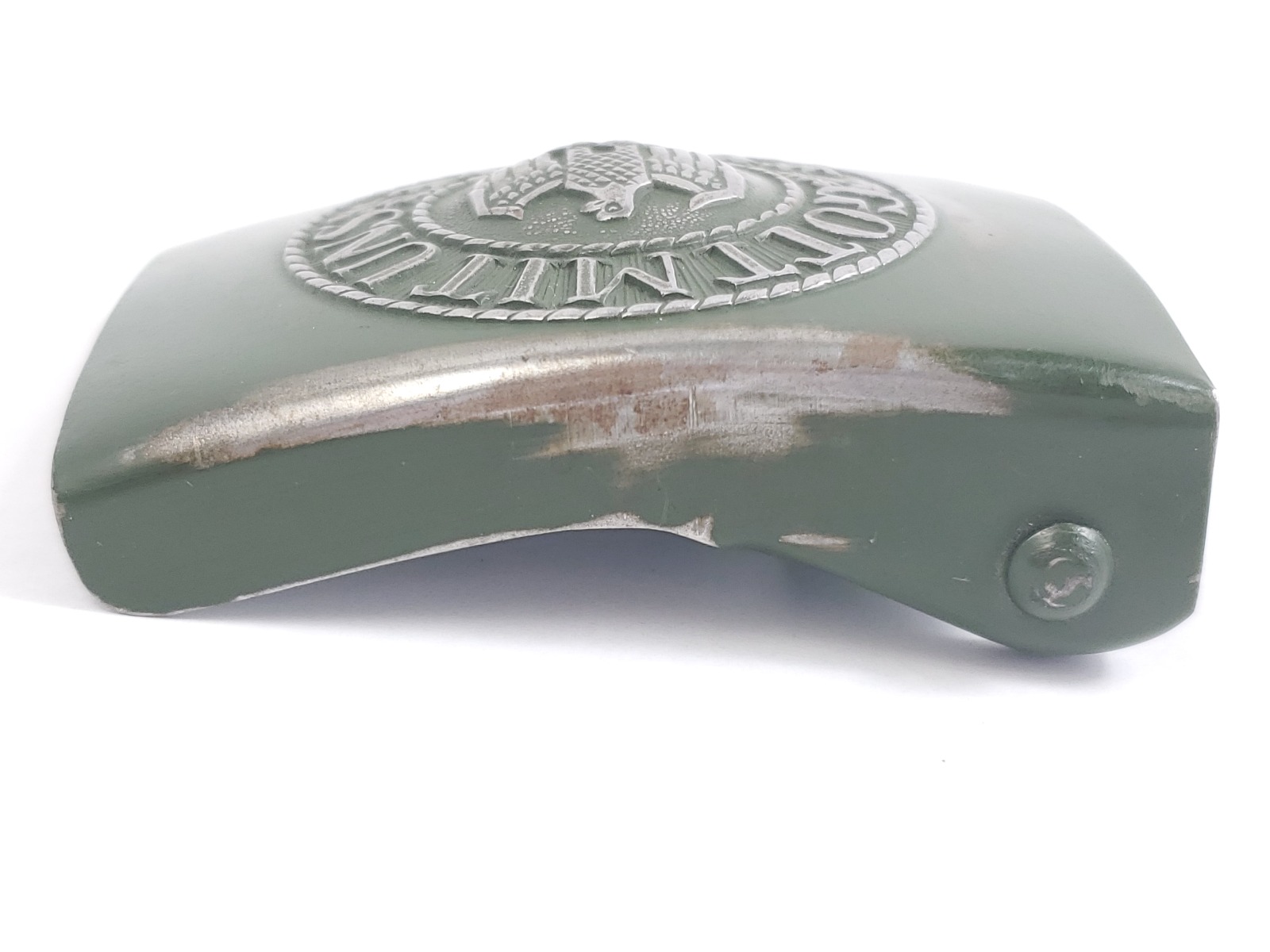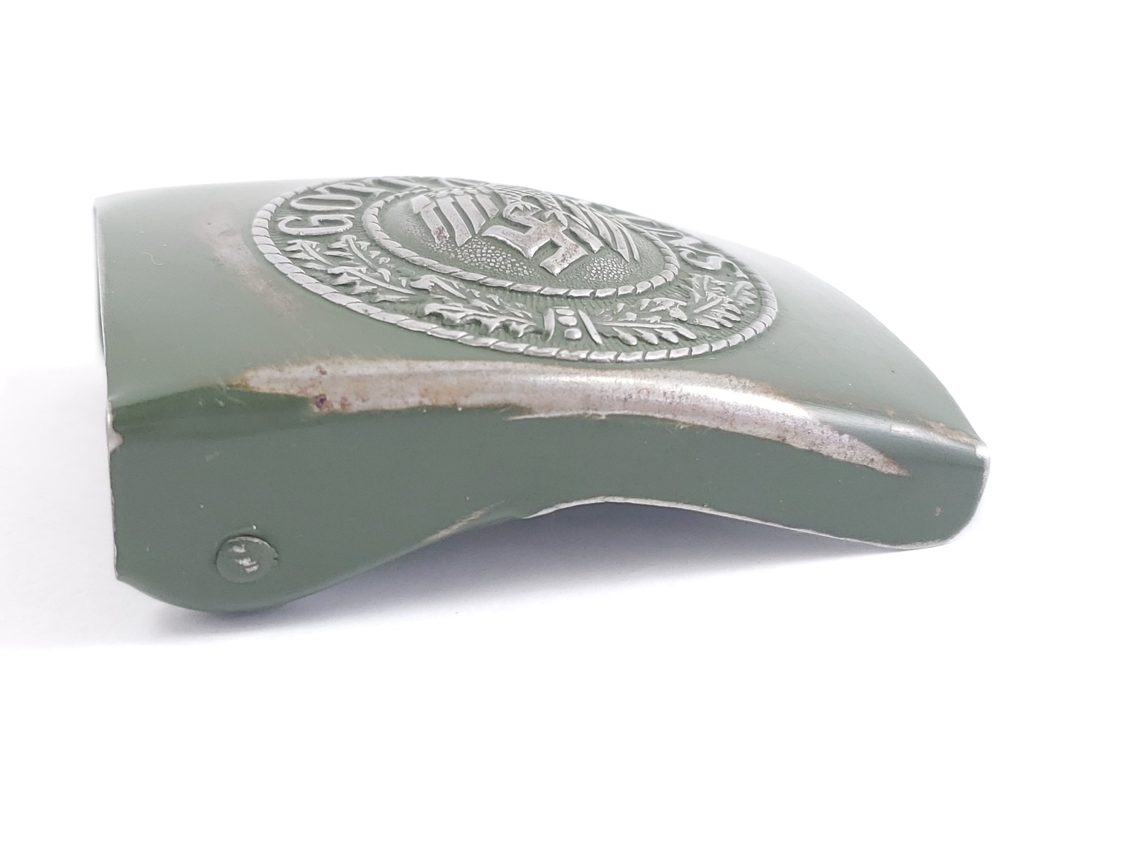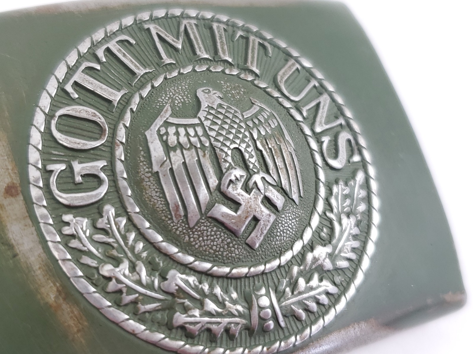 6/10/20 – This is an original WW2 nazi military belt buckle, painted olive green for combat use. The paint is still mostly in tact with some light wear and finish loss on the front of the buckle and edges. The reverse is maker stamped and dated 1940. No dents or functionality issues, overall a nice piece.