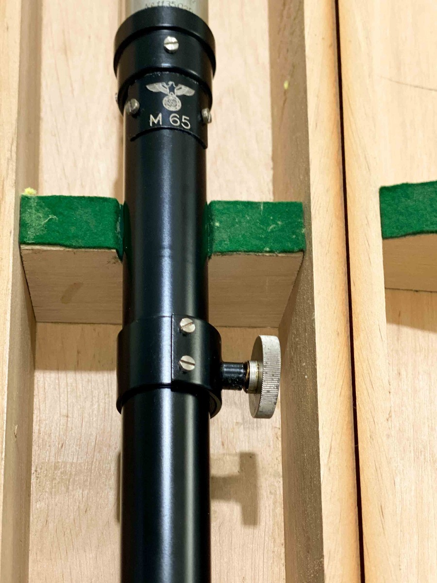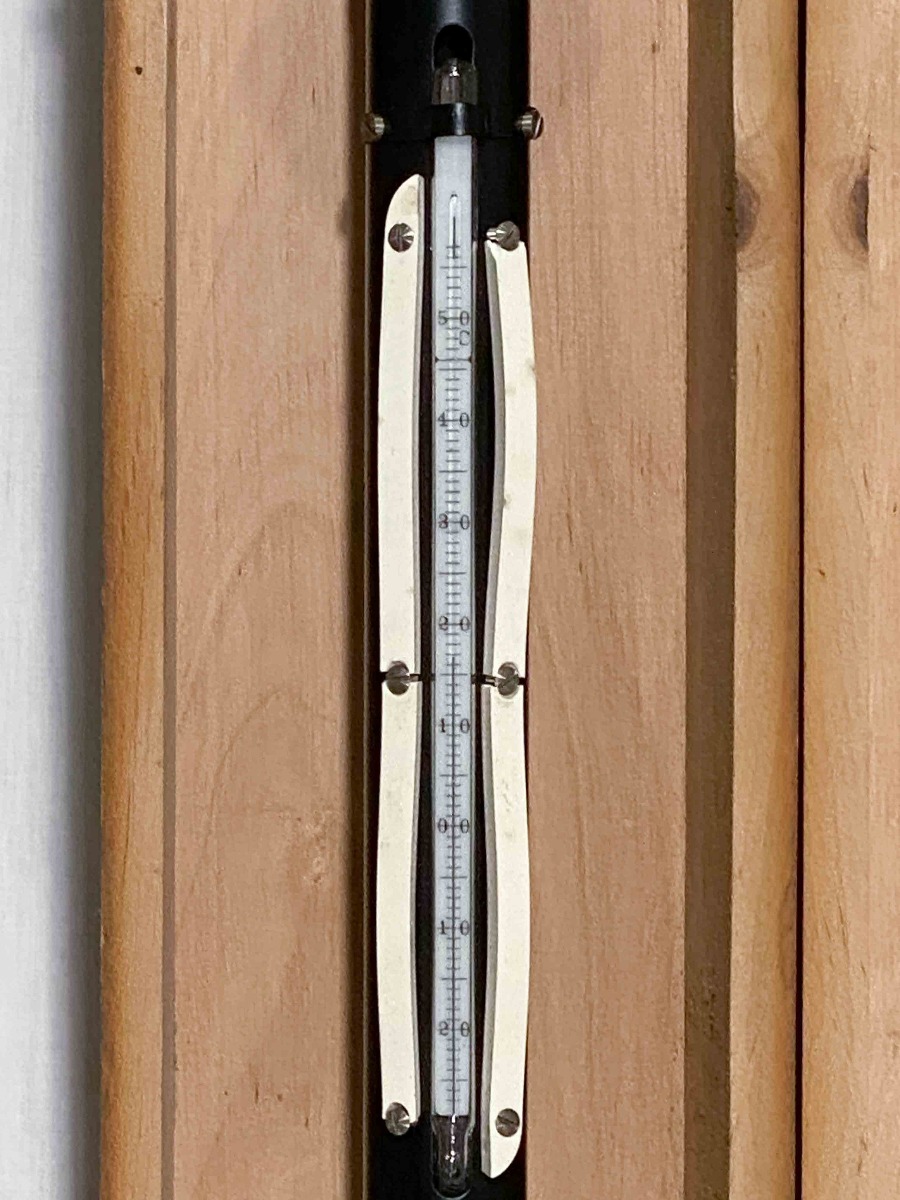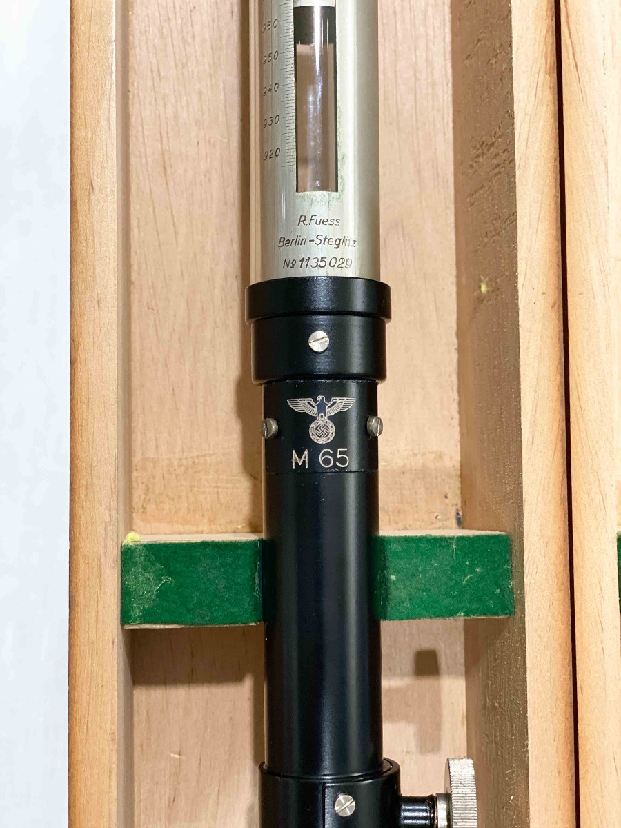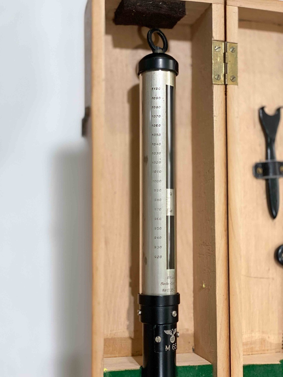 9/15/20 – This is a unique offering; a very rare 36″ WW2 Kriegsmarine barometer with the original wood case. The entire length with the case is 40″. The barometer is well stamped and all original in excellent condition. it retains the original Celsius thermometer, but the internal glass and mercury were removed at some point – not included. A wonderful display piece and a very unique item for any collection.