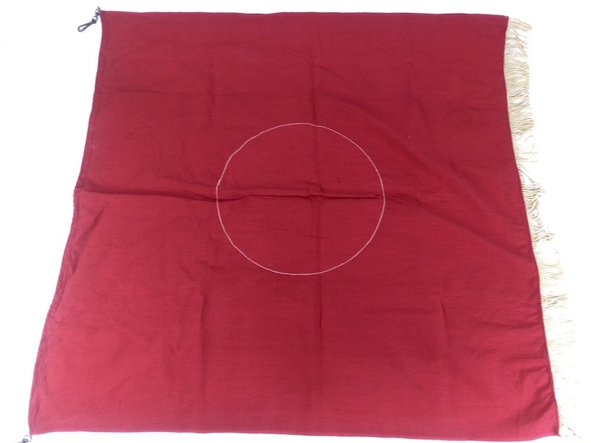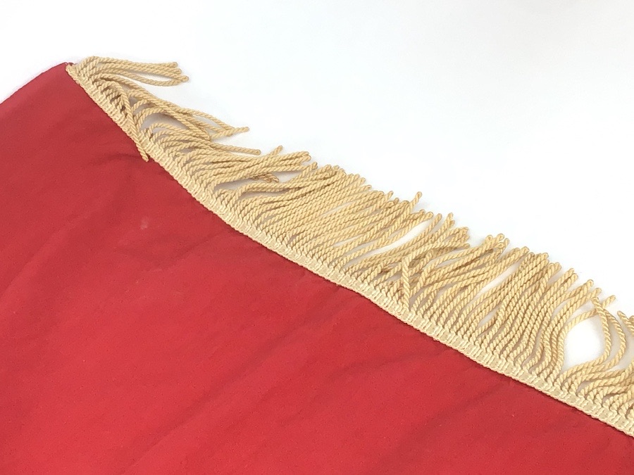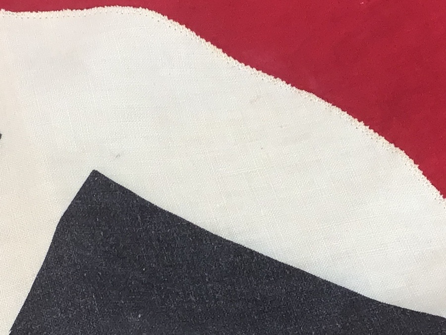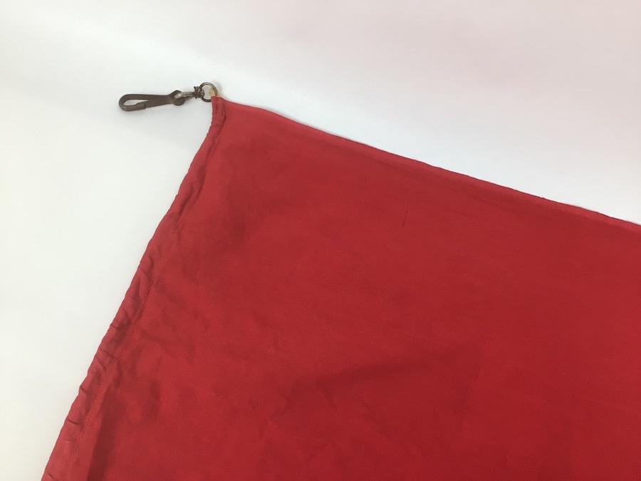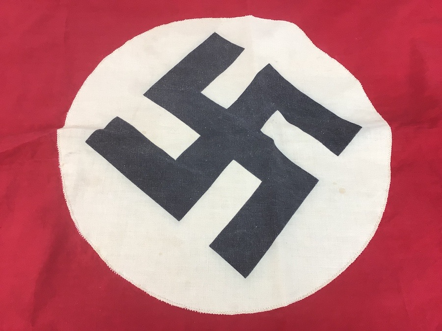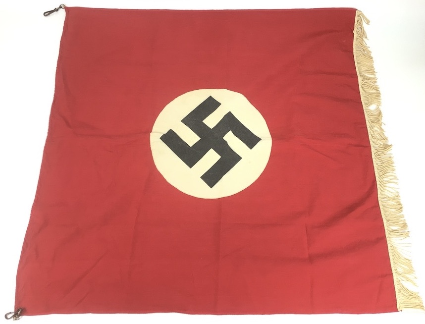 3/25/22 – This is an original WW2 nazi party flag. The flag measures .31in x 39in. The style of flag indicates that this hung as a banner with two hanger clips and a cord at the top. Tassels at the bottom. The size of the banner indicates this would have been hung indoors – so at a house or hall. There’s also an edge accent of coiled straw string . The more “ornate” additions make this flag somewhat rare and unique. No holes or tears. Single sided. Stitching is intact.