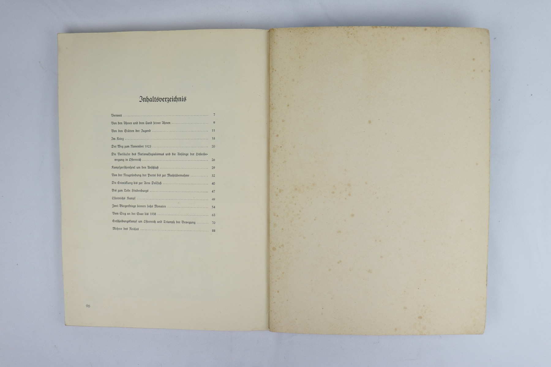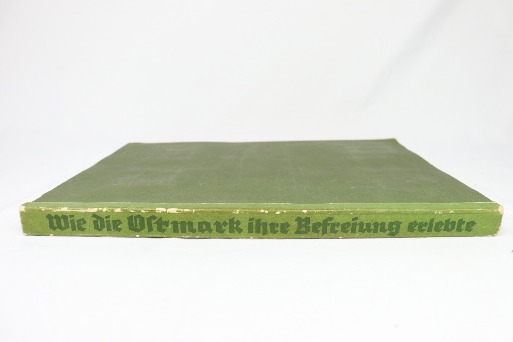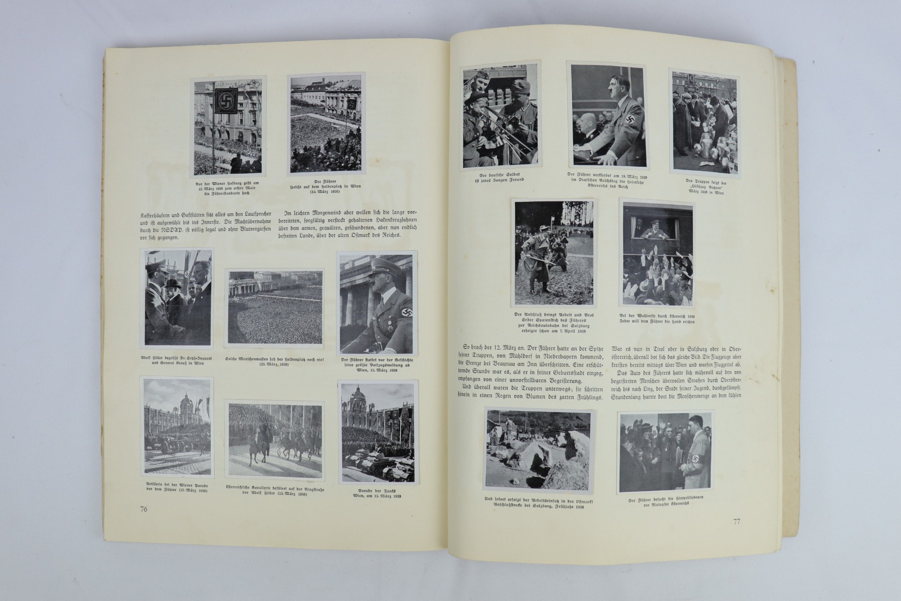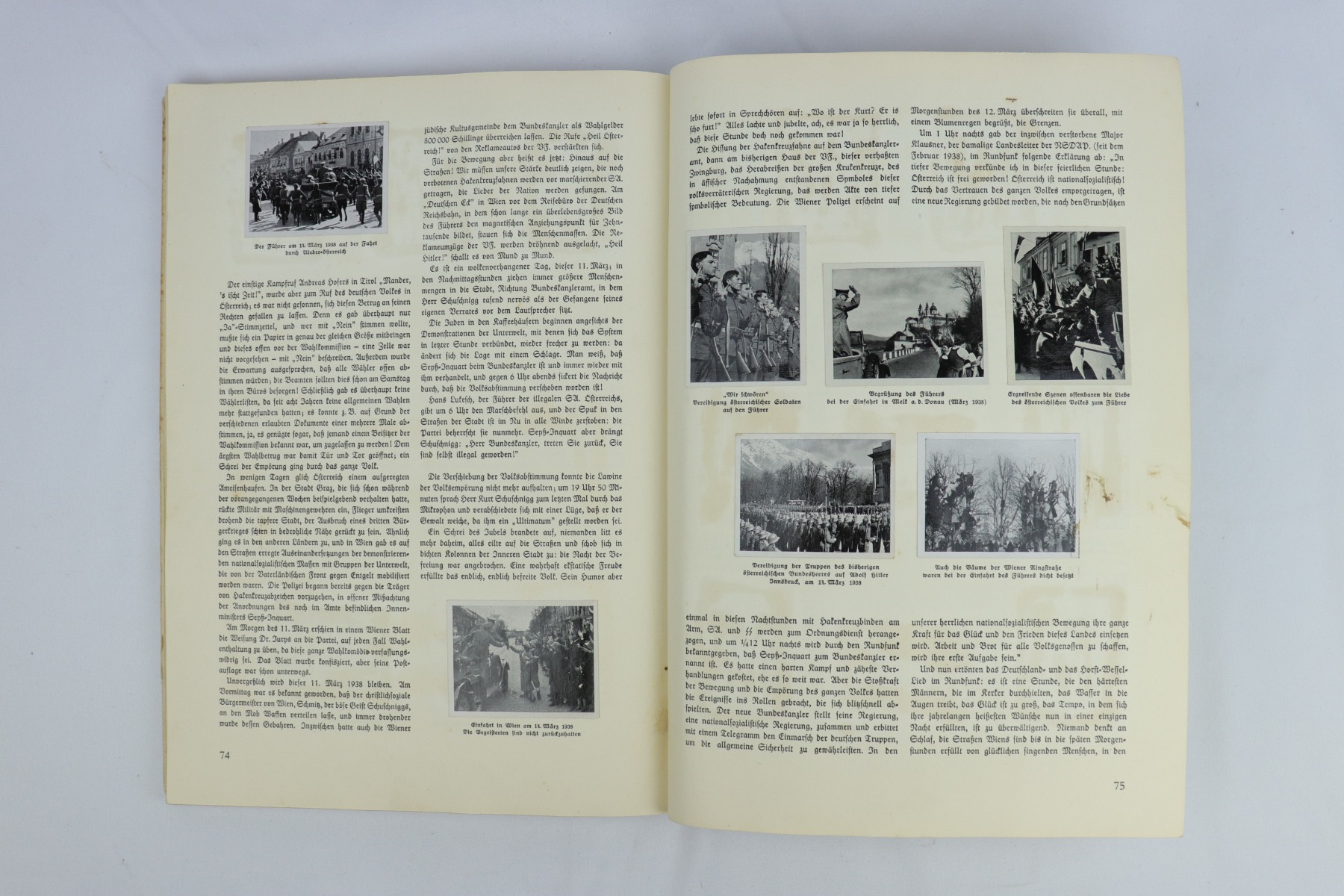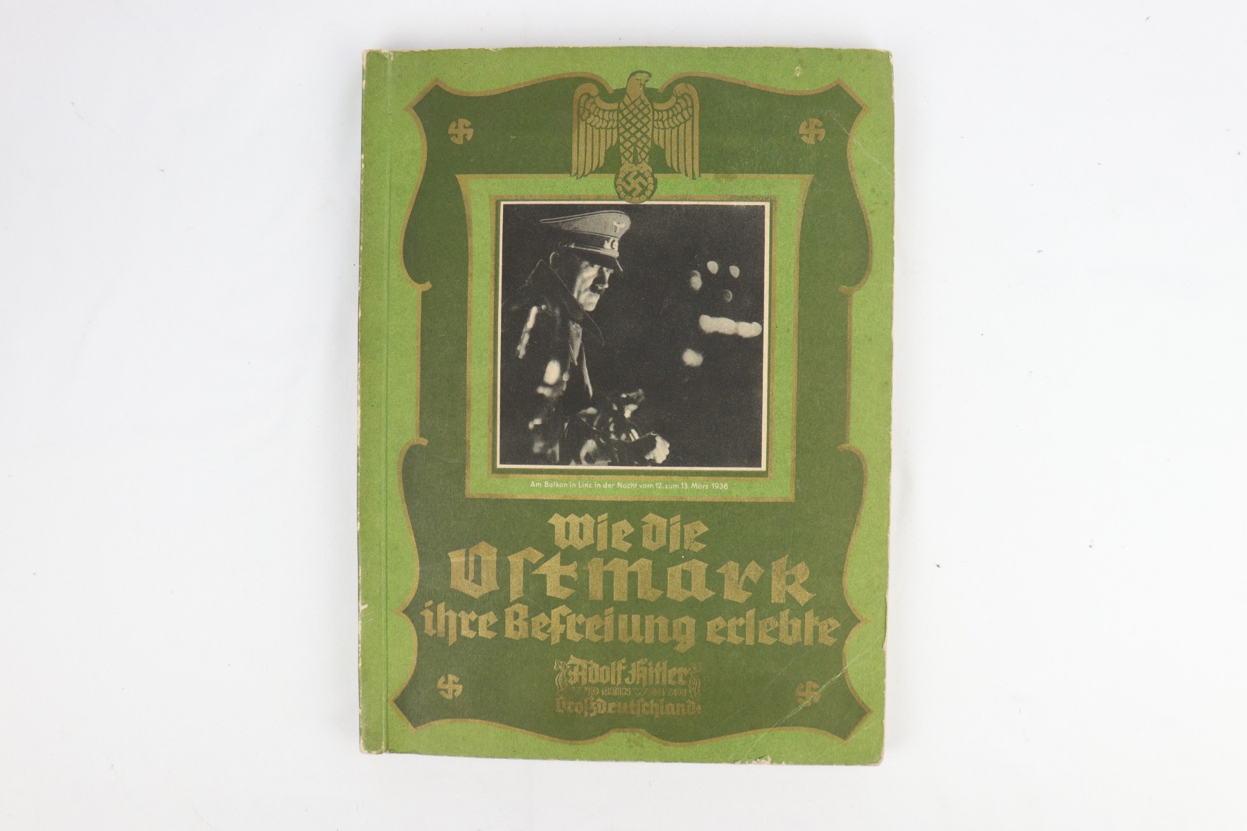 6/5/20 – This is a Nazi Propaganda Cigarette Photo Book. Overall, it is in great condition except for small tears along the cover edges and small stains on the pages throughout. Wie die Ostmark ihre Befreiung Erlebte: Adolf Hitler und sein Weg zu Grossdeutschland (How Austria Experienced its Liberation: Adolf Hitler and his Route to Greater Germany) tells the story of the early years of Adolph Hitler, Nazism, and the Third Reich. This time period, from Hitler’s birth up to the Anschluss, or annexation of Austria in 1938, might be considered “the good years” for people sympathetic to the Nazis’ cause. Luckily for the rest of the world, things went downhill for the Nazis in the years after that.Published in 1940, Wie die Ostmark ihre Befreiung Erlebte has over 300 illustrations. The majority of them are small tipped-in reproductions of original black and white photographs, each 2 inches by 2.5 inches. This gives it the look of a sticker-collection book. The rest of the illustrations are larger printed photographs and drawings that resemble woodcuts. The typeface used in Wie die Ostmark ihre Befreiung Erlebte is the old Fraktur, which originated in the 16th century. Ironically, one year later Hitler banned the use of this font (which was used in both this book and on the cover of Hitler’s earlier work, Mein Kampf) claiming it was a Jewish font since it was often seen on Judaic printed materials.