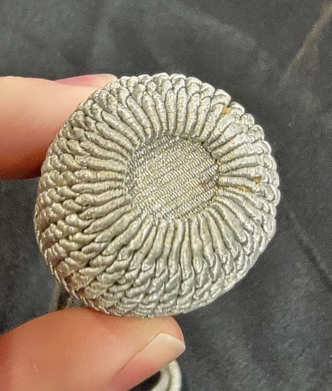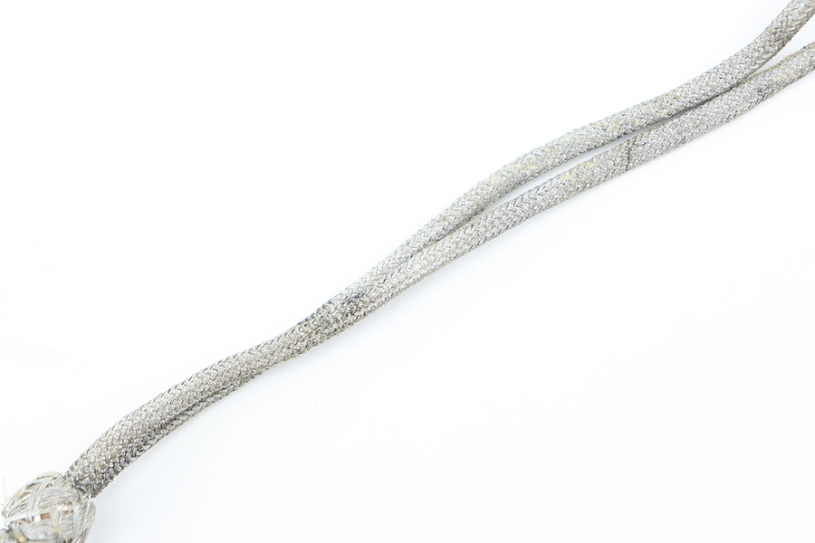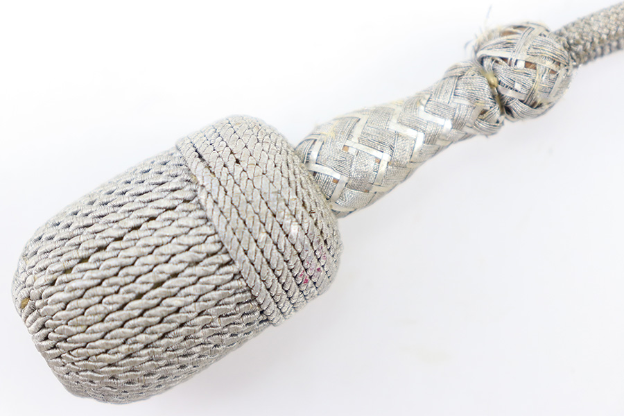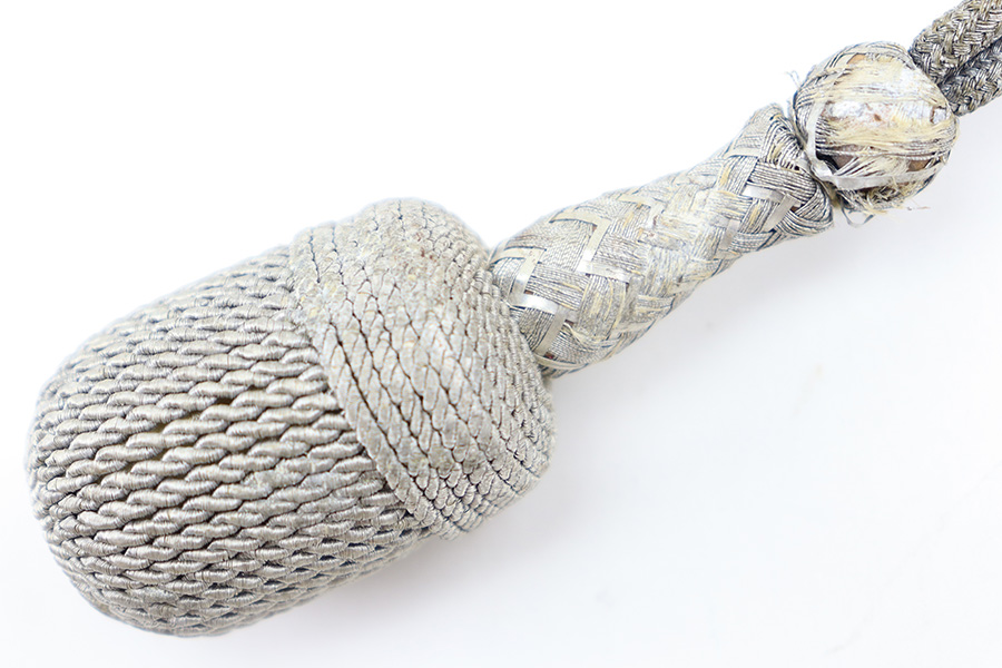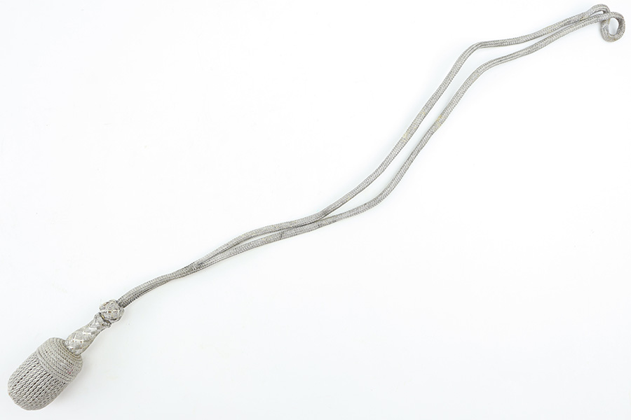 11/28/23 – This is an original WW2 German Officer Dagger portepee. The silver portepee is all original with rope and knot completely intact with almost all of the original silver threading / finish intact. The chord (rope) has a few small areas of scuffing and mild use / aging wear. The knot is tight and complete.