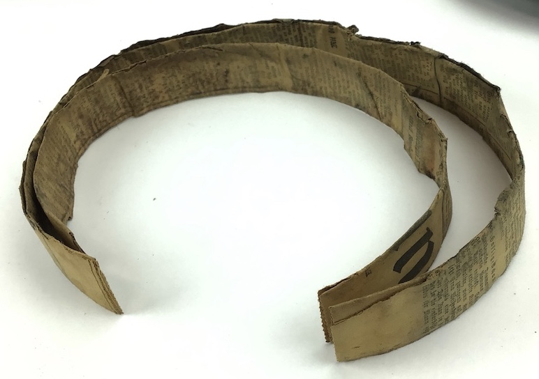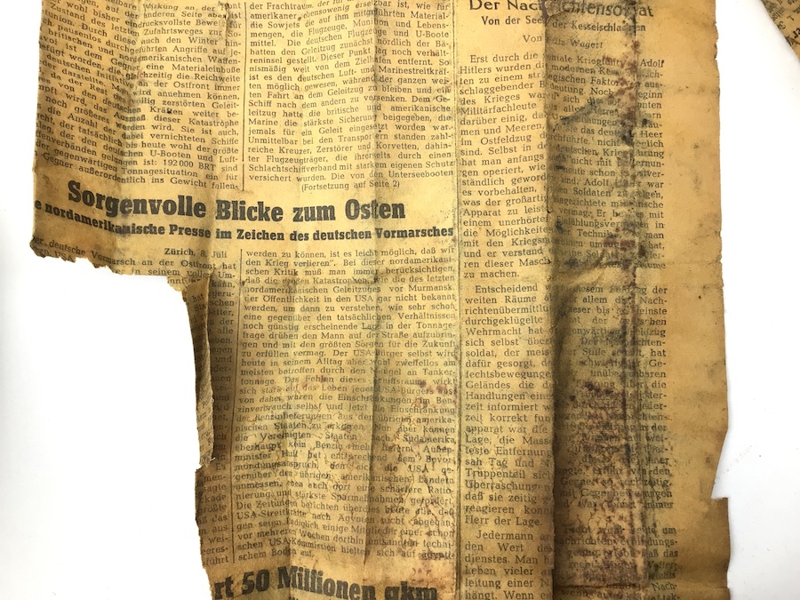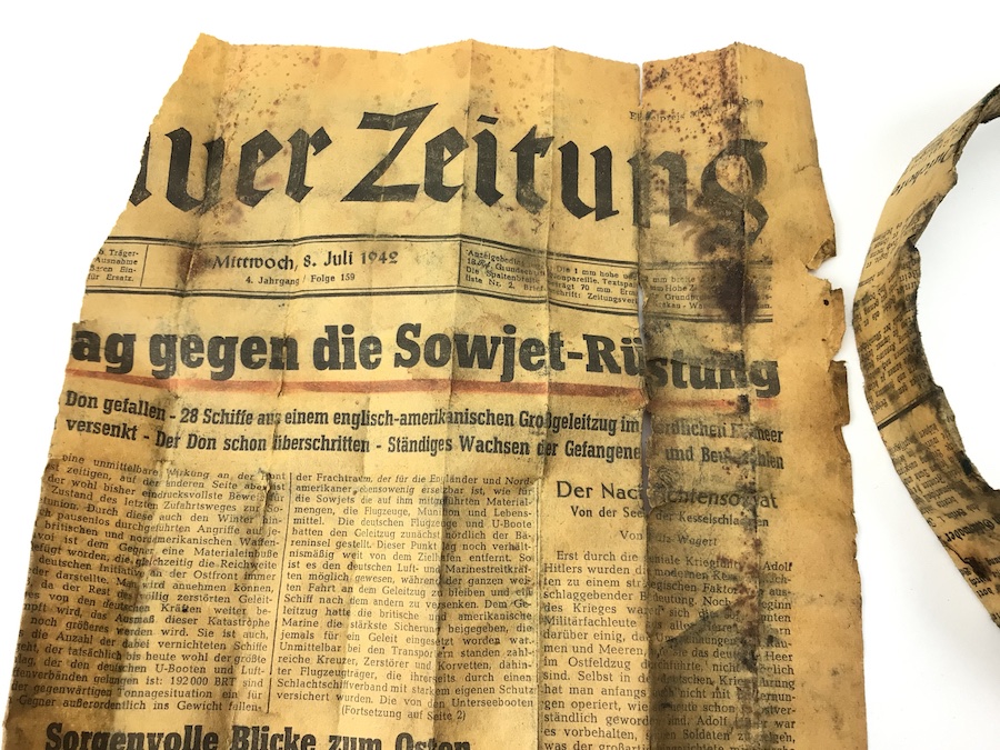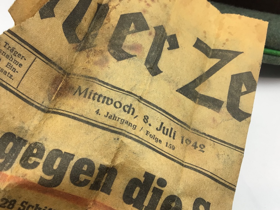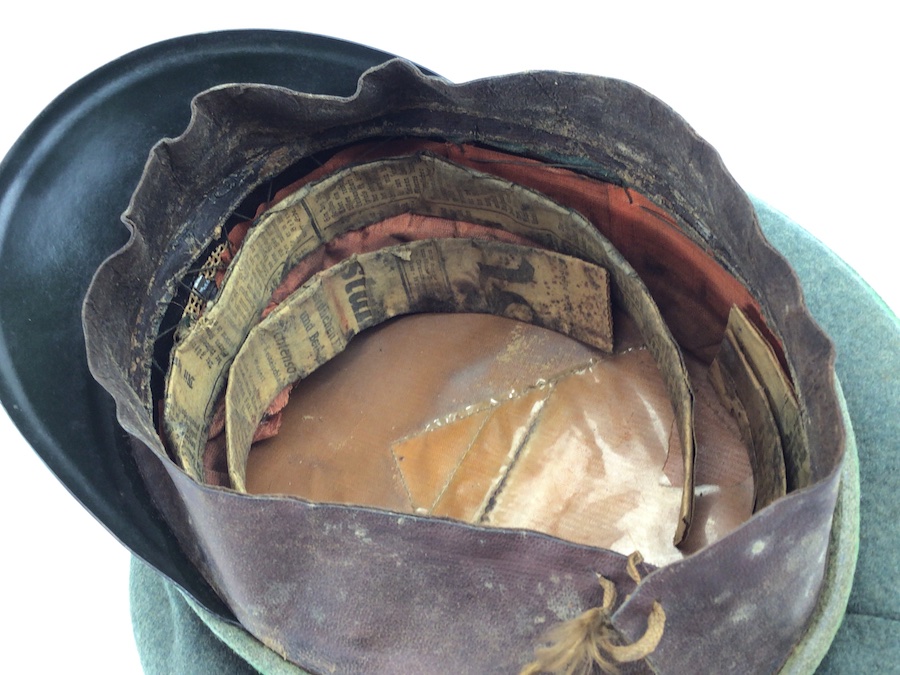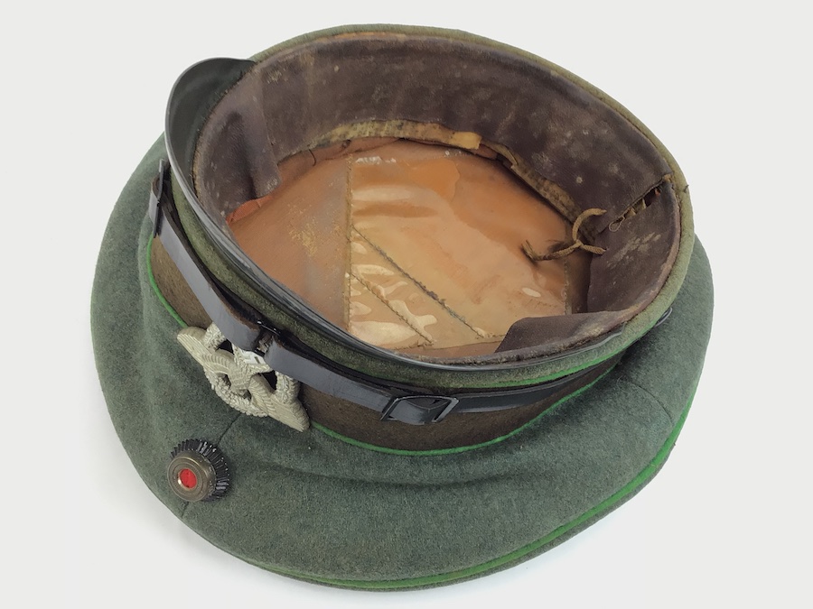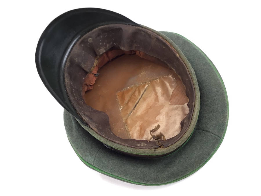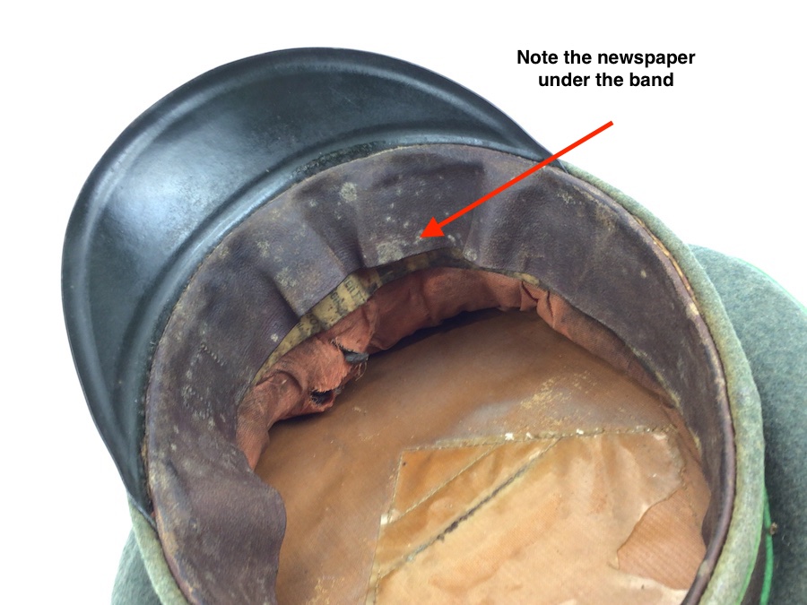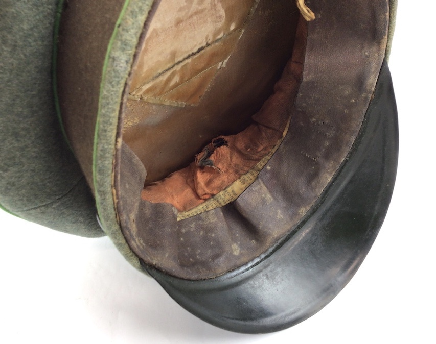 12/14/21 – Original and great condition, German WW2 Ordnungspolizei or “Order Police” visor hat for enlisted ranks. The most interesting aspect of this hat is the original German newspaper that was folded into the sweatband. Dated July 8, 1942 with a headline about the Russians. Honest wear and intact. The maker is unknown. Very cool piece of history. Great overall condition.