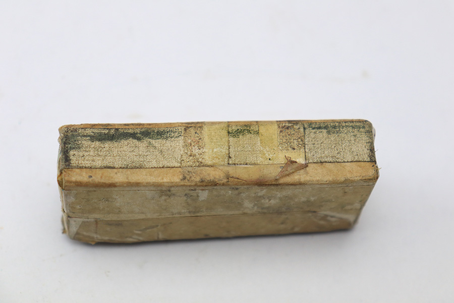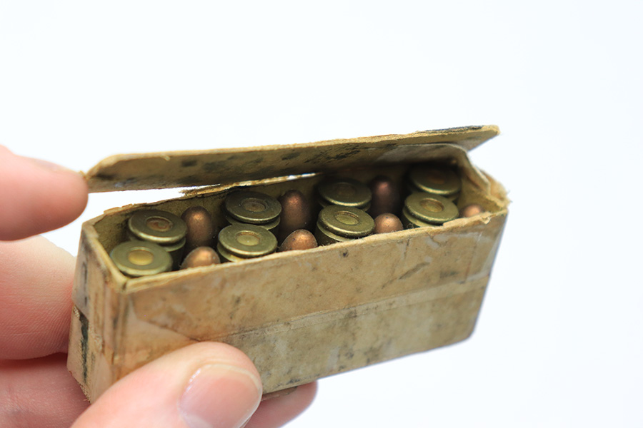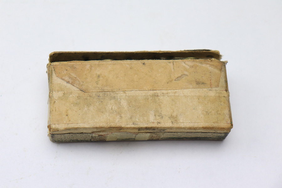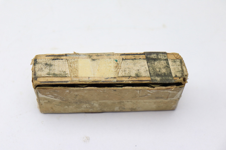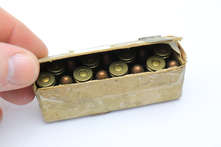 5/25/22 – This is an original box of 8mm Nambu ammunition from WW2. The ammo comes in the original box, as shown. The box has layers of tape holding it together and shows aging throughout. There are 15 rounds total included in the box. All rounds are in excellent condition.