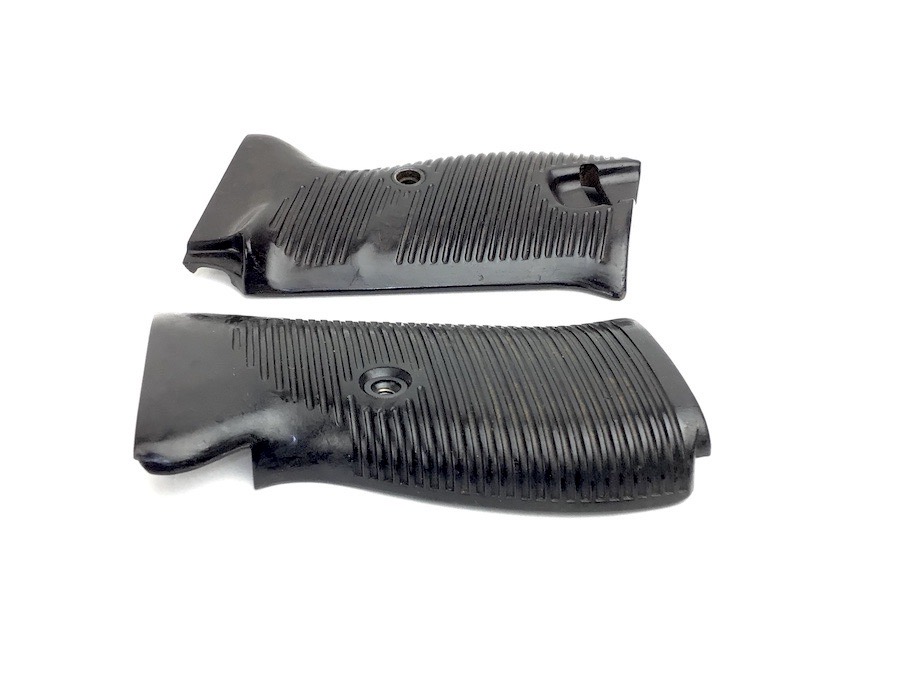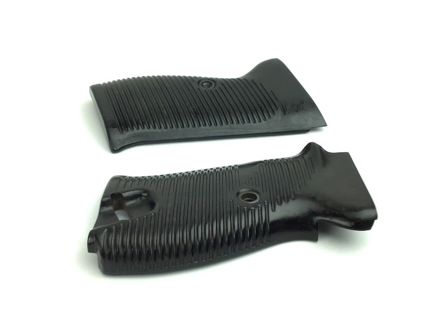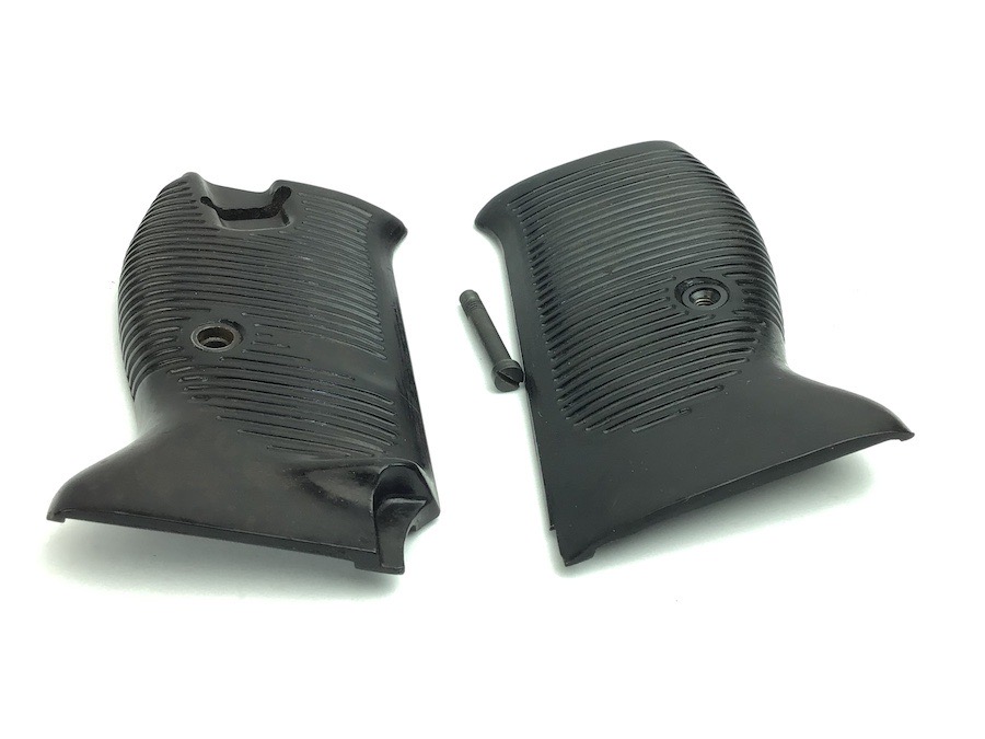 4/12/23 – This is an original pair of wartime production WW2 P.38 grips. They are black and lightweight bakelite material. The interior upper circle is stamped with the MPBD Walther markings. Original screw included. Right interior panel has a serial number 3868.