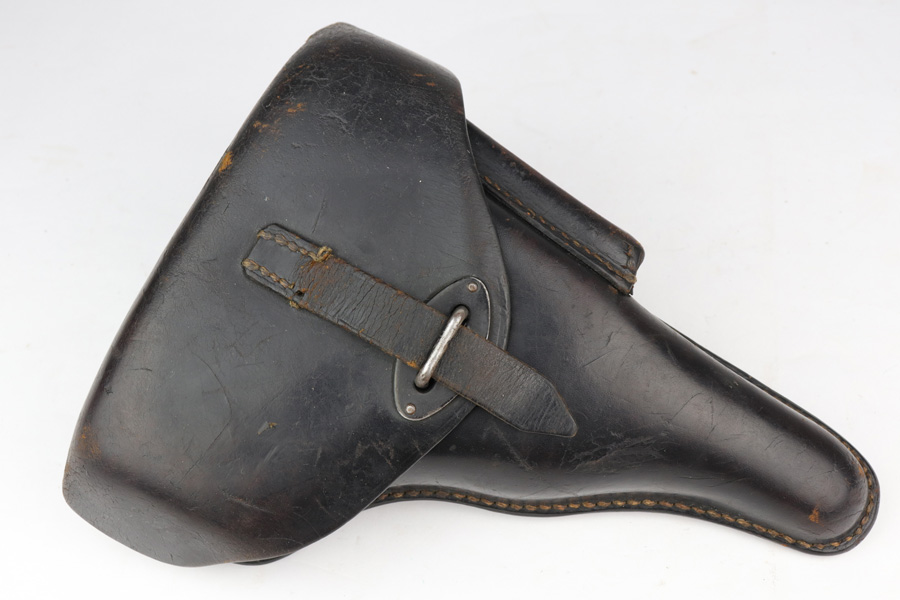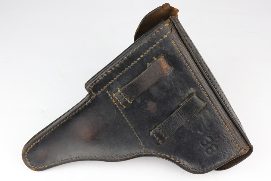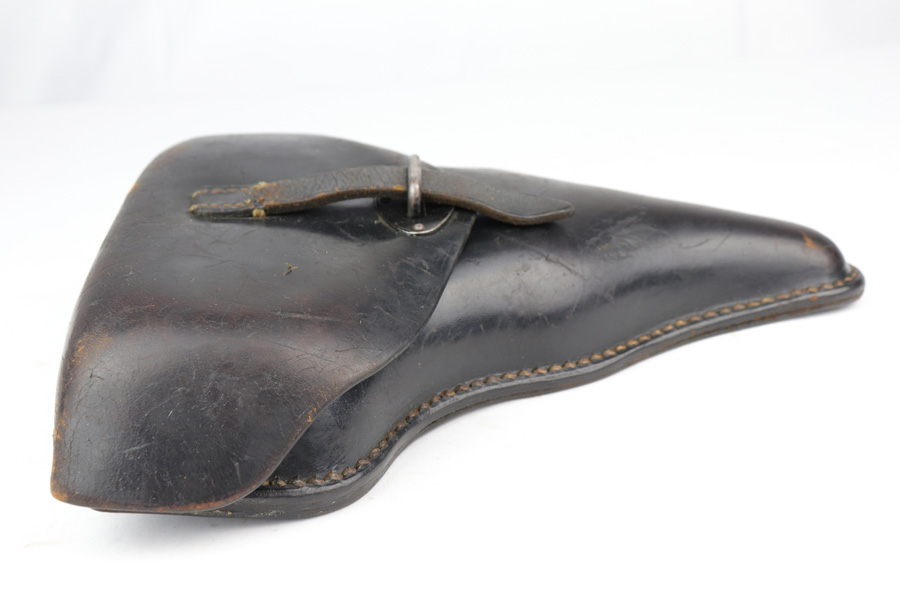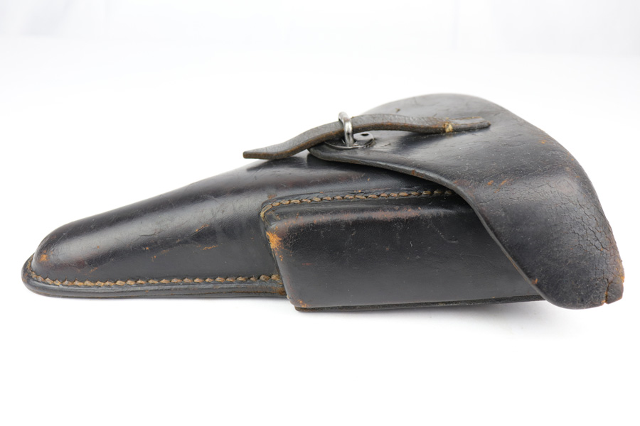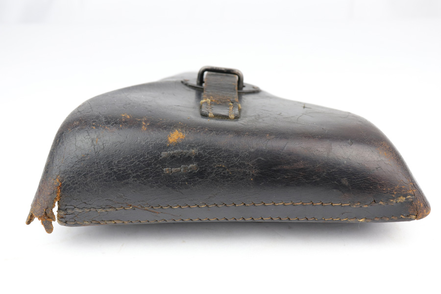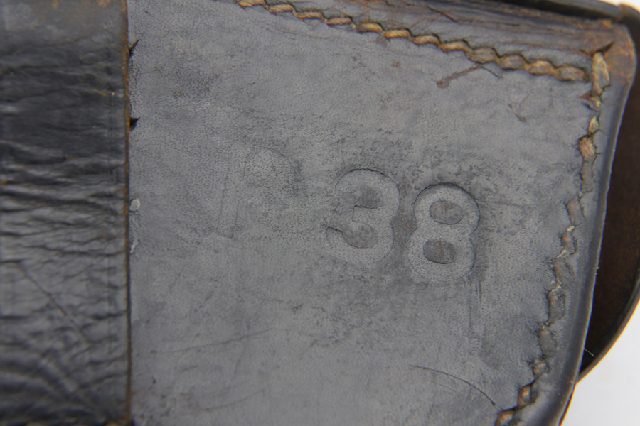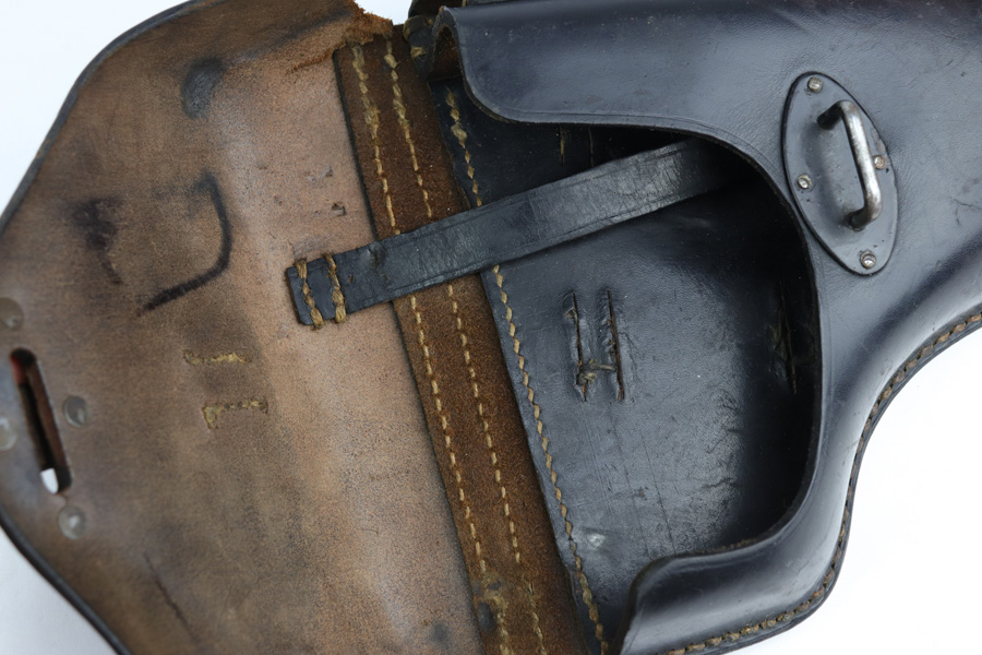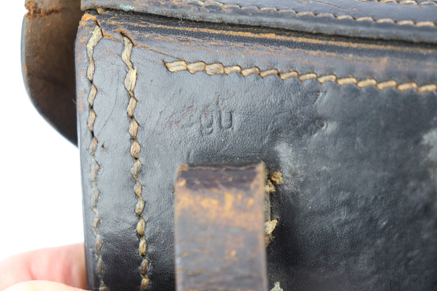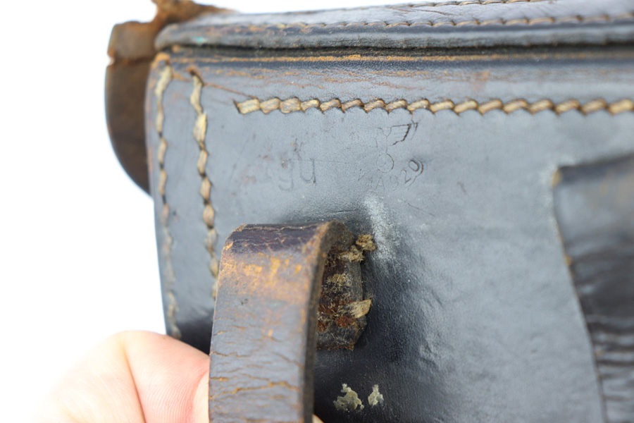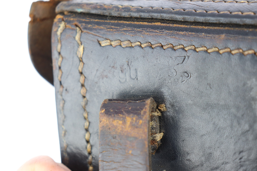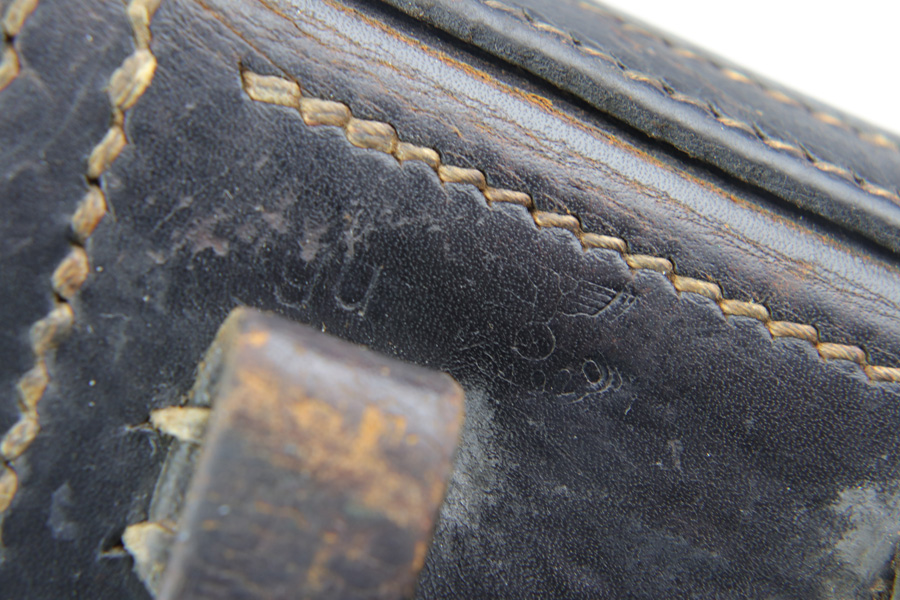 1/15/19 – This is an original scarce variation 1941 hardshell P.38 holster. The back of the holster is “cgu” maker stamped with one of the FAINTEST ’41 date stamps I’ve seen. You can see the faintest of outlines of the “41” just under the maker stamp and above the belt loop. We know this has to be either a 41 or 42 stamp, as “cgu” only made holsters in 1941 and 1942. The stamp is so faint it can only be somewhat seen in the proper lighting. There’s also a waffen WaA920 military proof. The lid has some surface cracking, and one significant crack in the corner towards the back – shown in photos. There’s a few small exterior scuffs as well. The stitching is all in tact and original, and the interior leather is fairly clean. Guaranteed original.