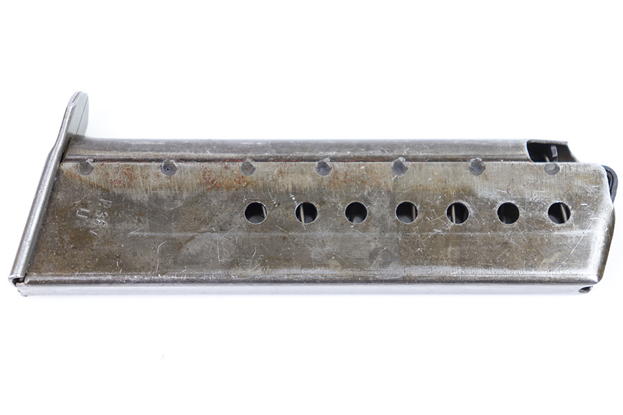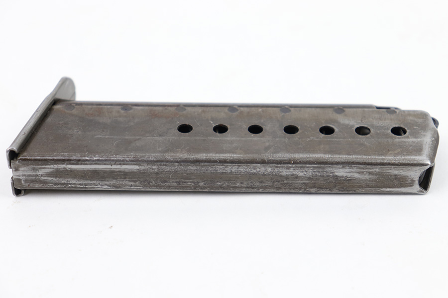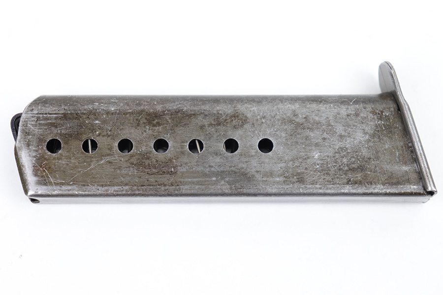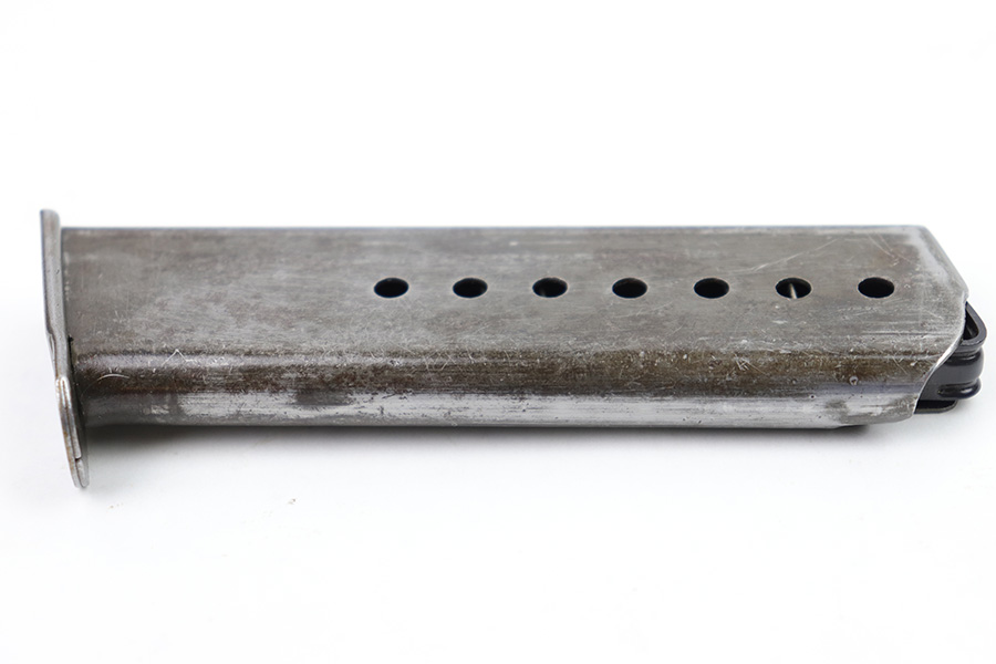 1/23/23 – This is a late WW2 production P.38 magazine. The magazine is stamped “P.38 U” on the tube, as the Germans skipped the metal hardening process at the end of the war. The magazine also has a late-war style ribbed follower. The magazine is in very good overall condition with some mild surface patina throughout. No rust or pitting and a fully functional spring.