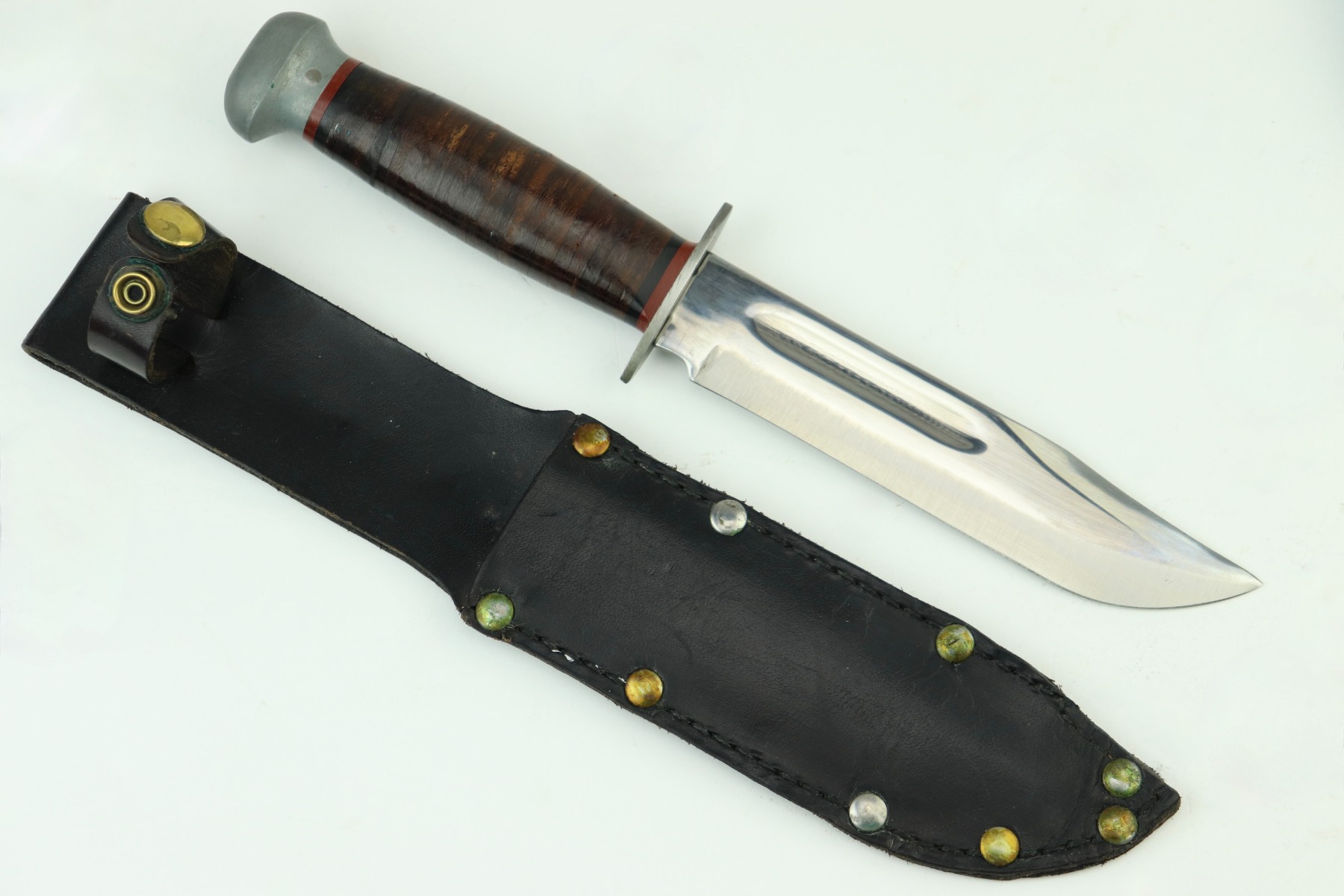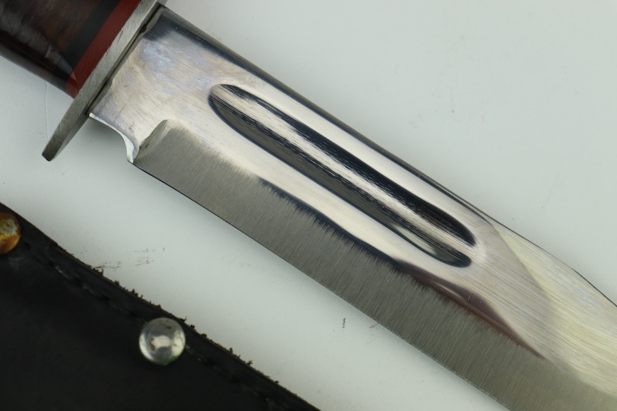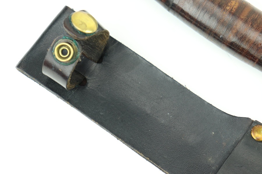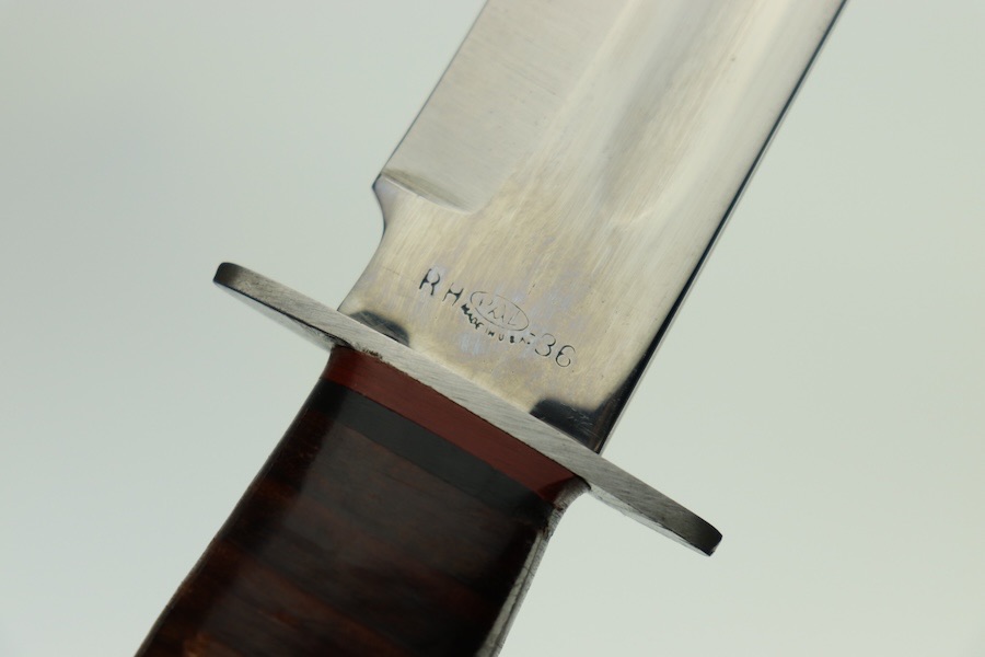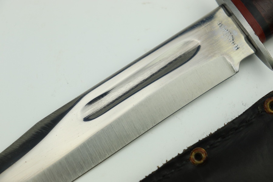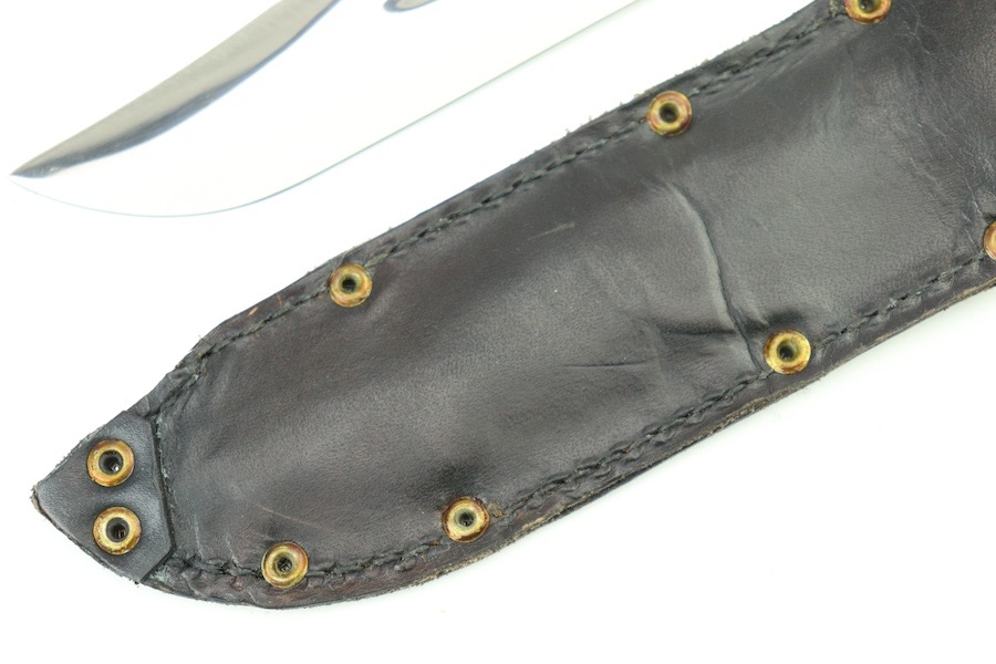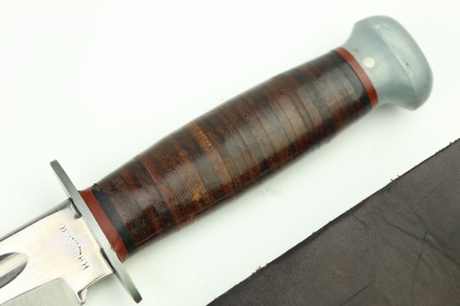 11/20/23 – This is an excellent condition RH Pal-36 combat knife. The blade has been GI restored with a high polish chrome finish and reprofiling of the edge. This was often done by GI’s after returning home from WW2. The clip-point part of the blade has been sharpened. The markings on the ricasso have some fading but are mostly legible. The cross guard has minor side-to-side play, but the blade is solid in place. The leather sheath has minor surface wrinkling but has very tight and original stitching.
