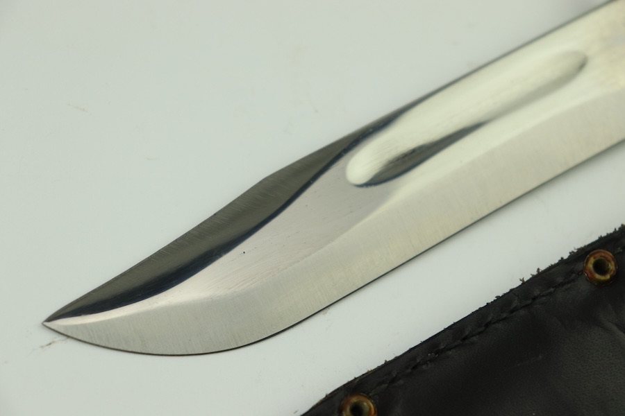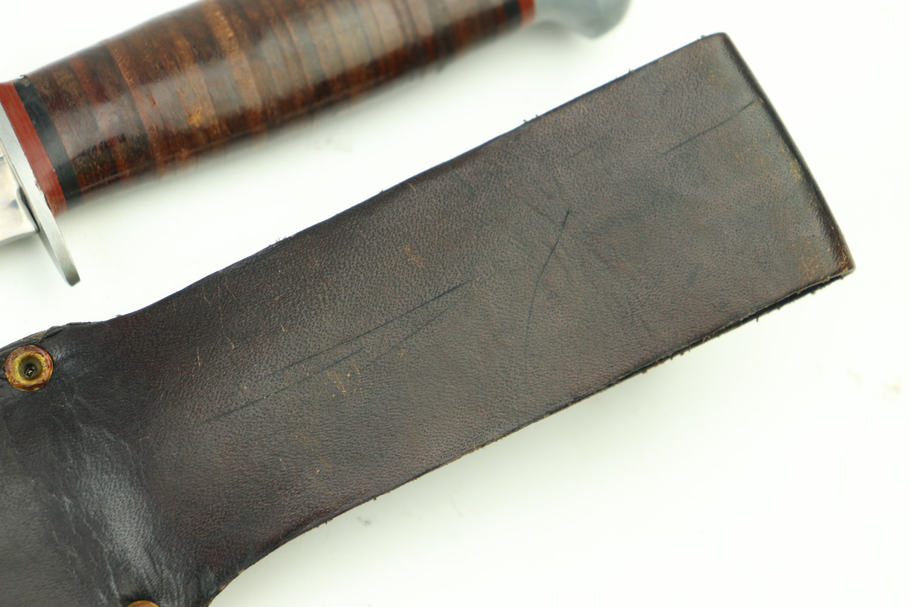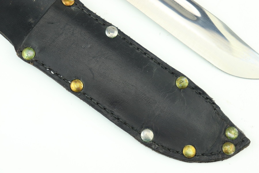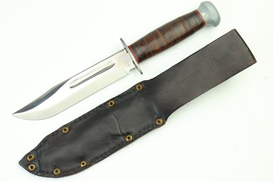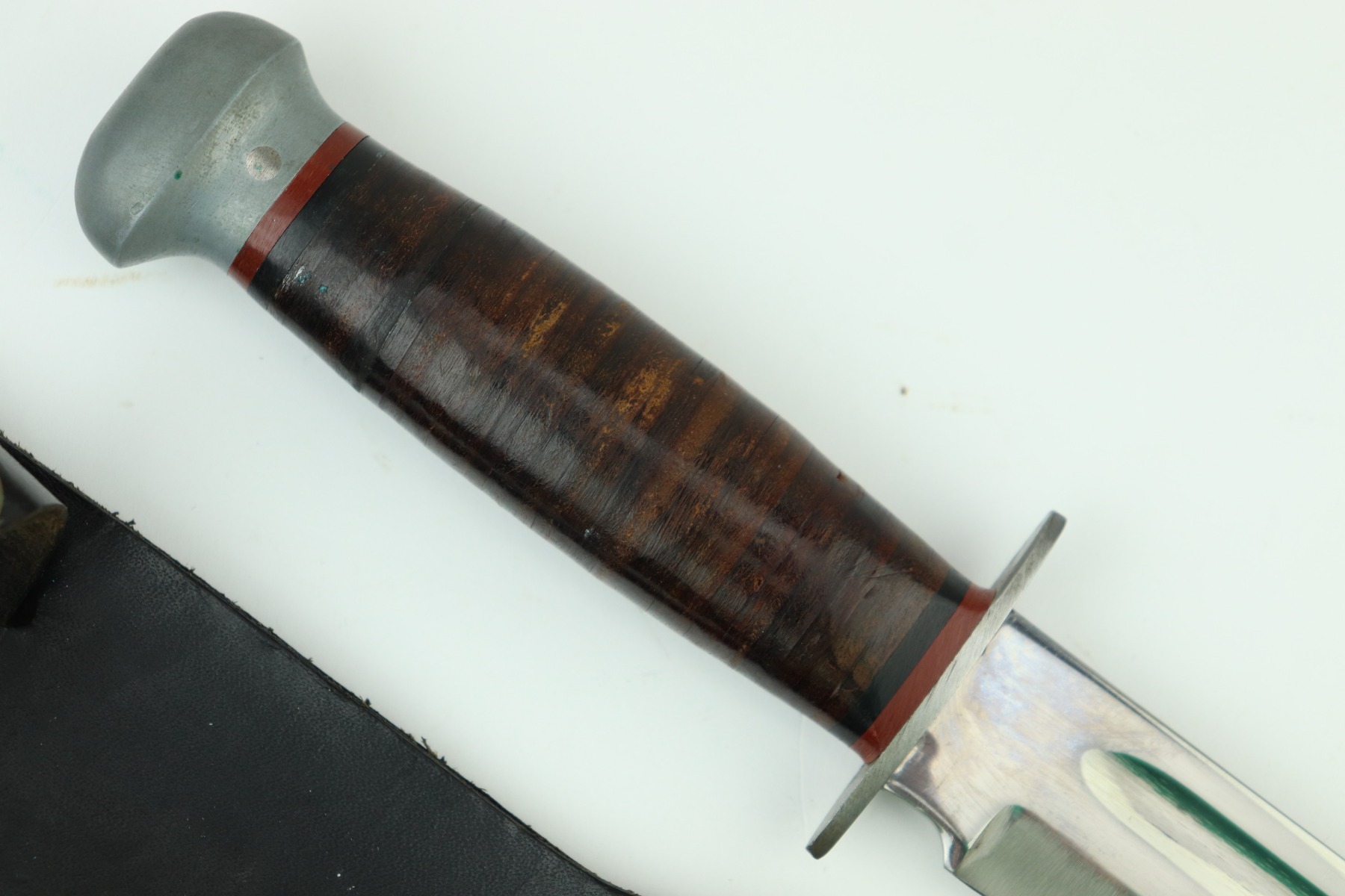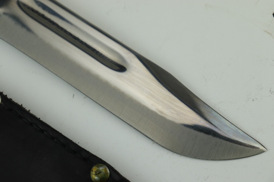 11/20/23 – This is an excellent condition RH Pal-36 combat knife. The blade has been GI restored with a high polish chrome finish and reprofiling of the edge. This was often done by GI’s after returning home from WW2. The clip-point part of the blade has been sharpened. The markings on the ricasso have some fading but are mostly legible. The cross guard has minor side-to-side play, but the blade is solid in place. The leather sheath has minor surface wrinkling but has very tight and original stitching.