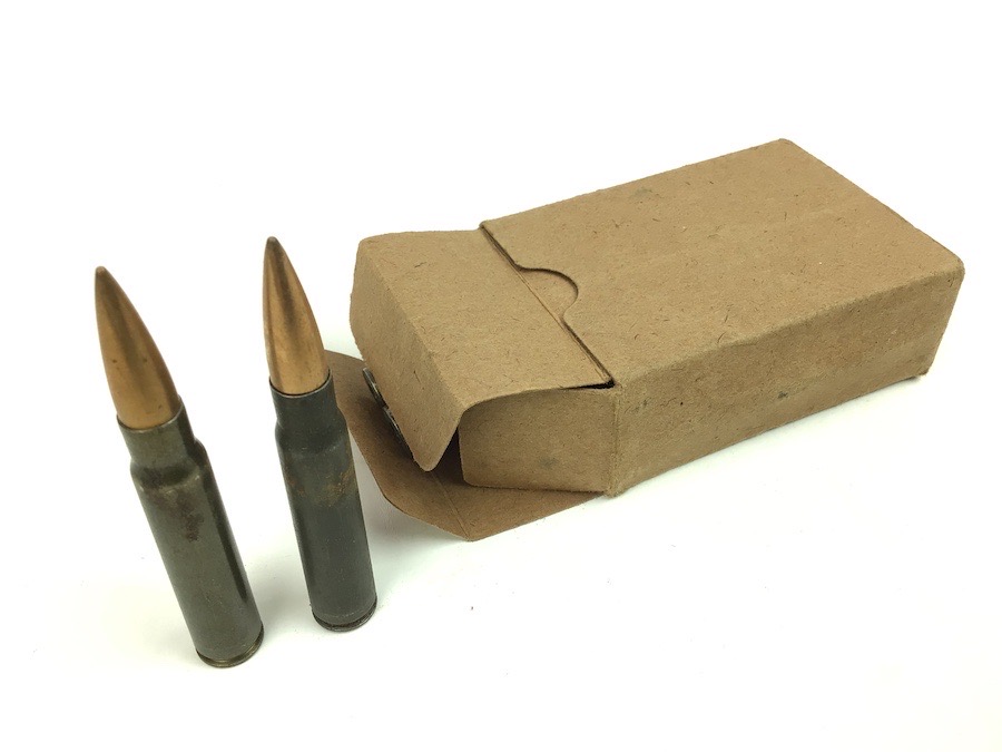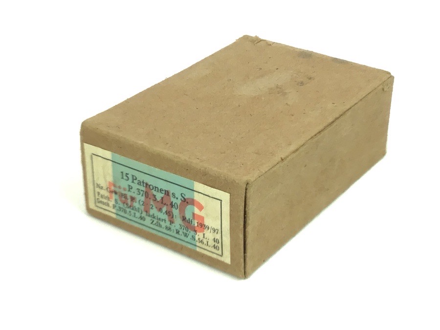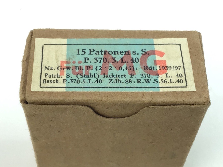 6/11/24 – Original box of WW2 production 7.92×57 (8mm) “Patronen SmE for Machine Gun” ammunition. There are 15 rounds in the box. Head stamps are dated 1940. Cartridges are in great condition. The box has an intact, original labels with great color.