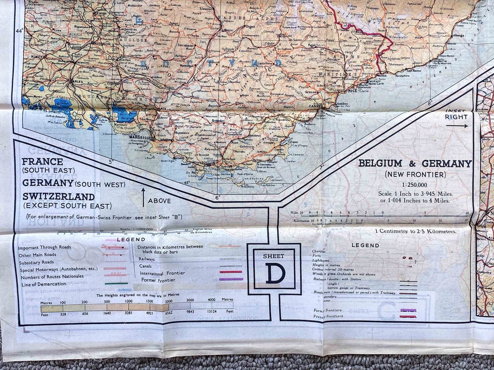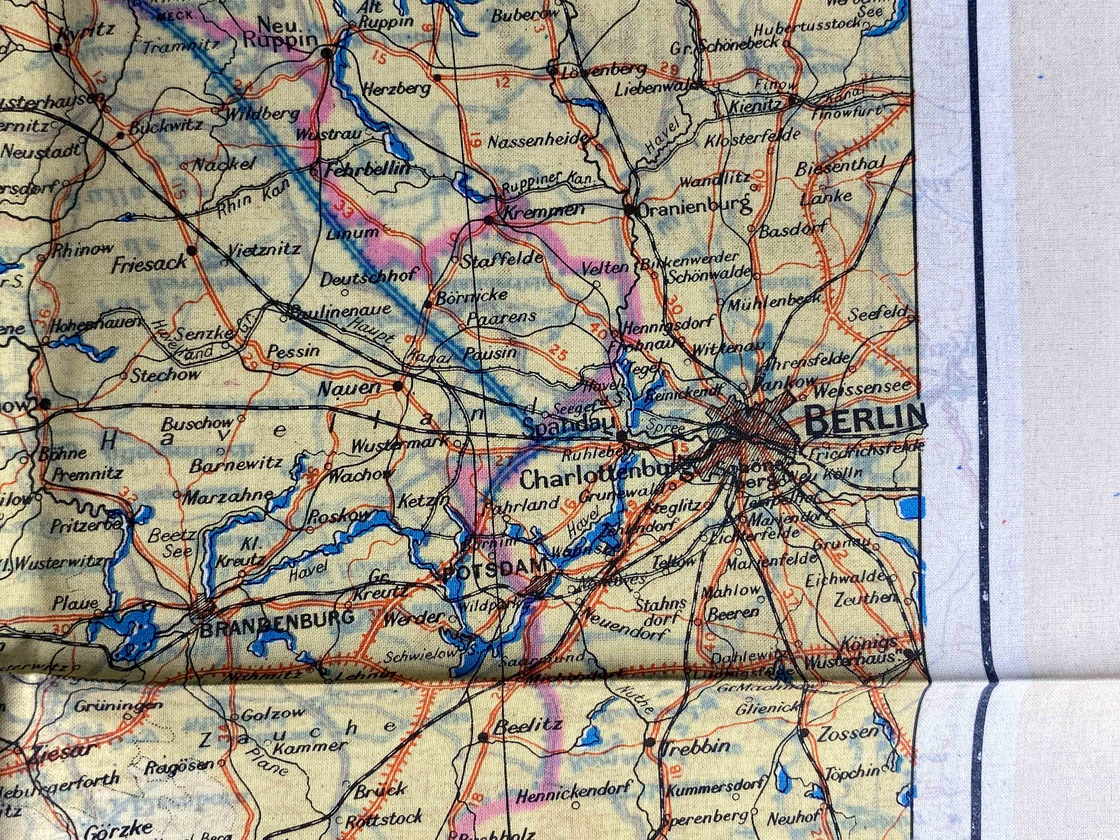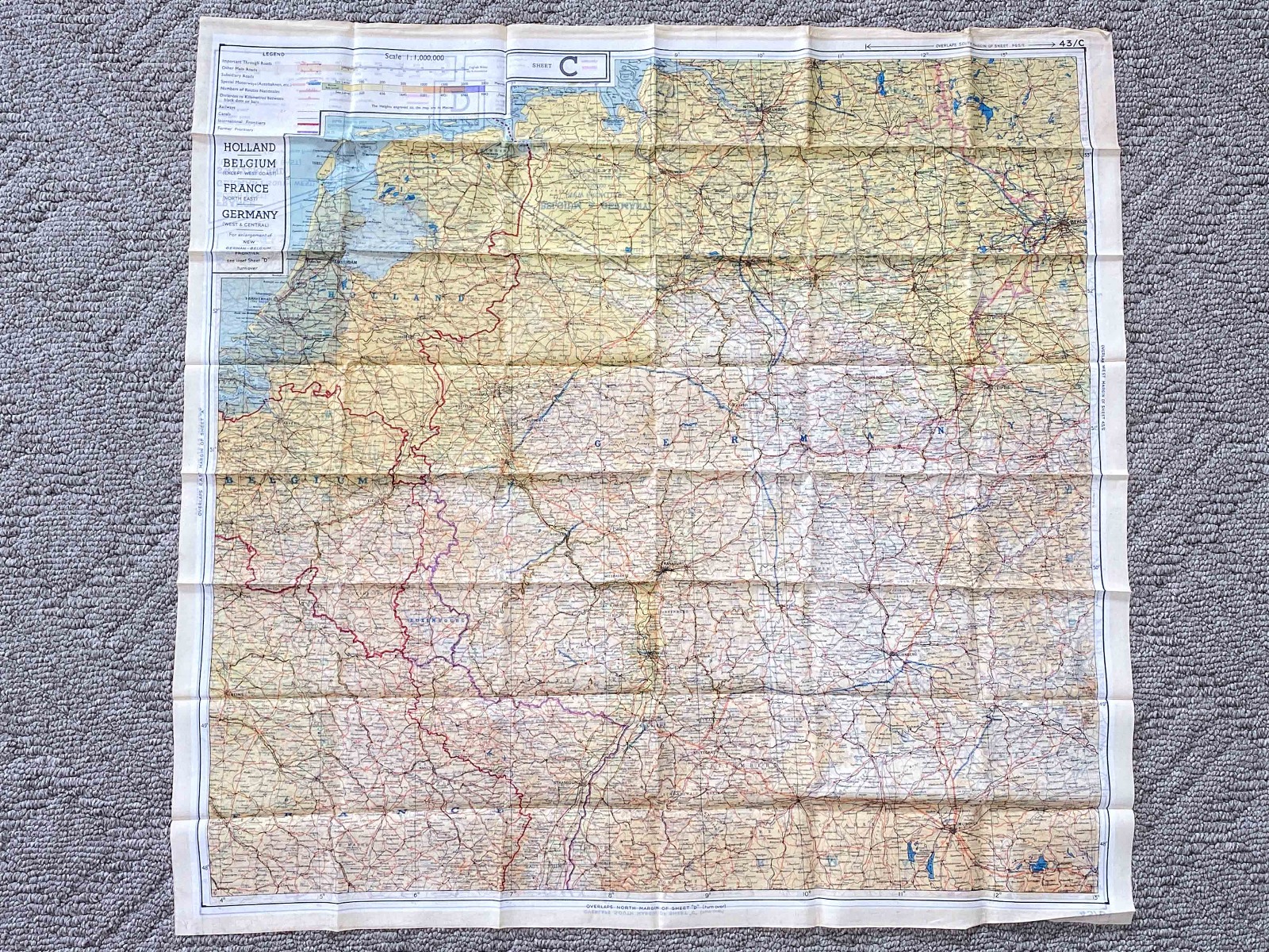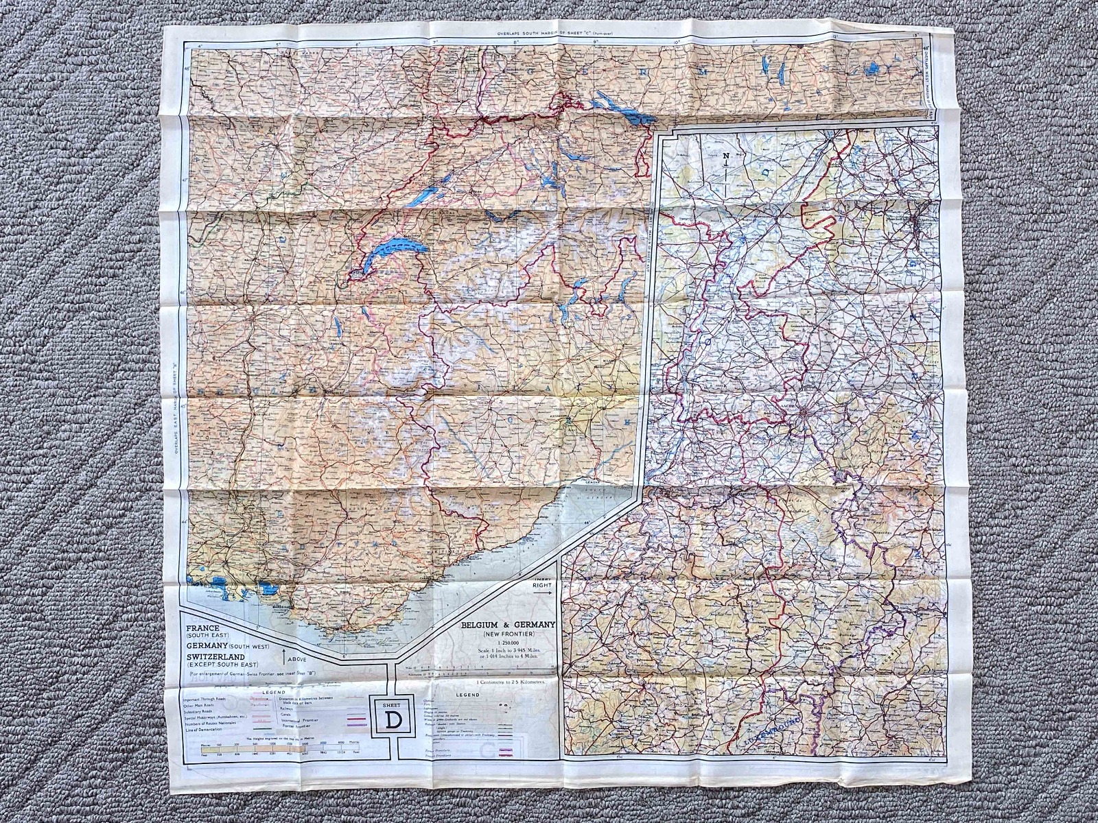 5/20/20 – This is an original WW2 pilot’s silk escape map. The map is in excellent condition with some minor fraying on the edges. The map is “Sheet D” and “Sheet C”. This was issued to the RAF and USAAF operating over enemy territory. Covers France, Germany, and Switzerland. Size is 29×30 inches.