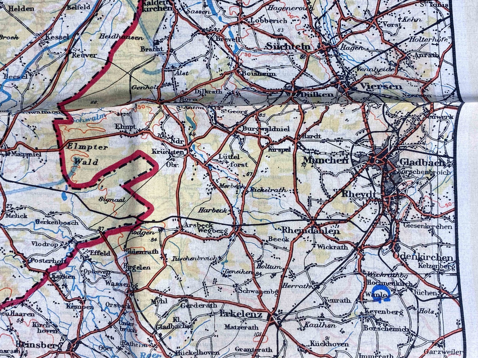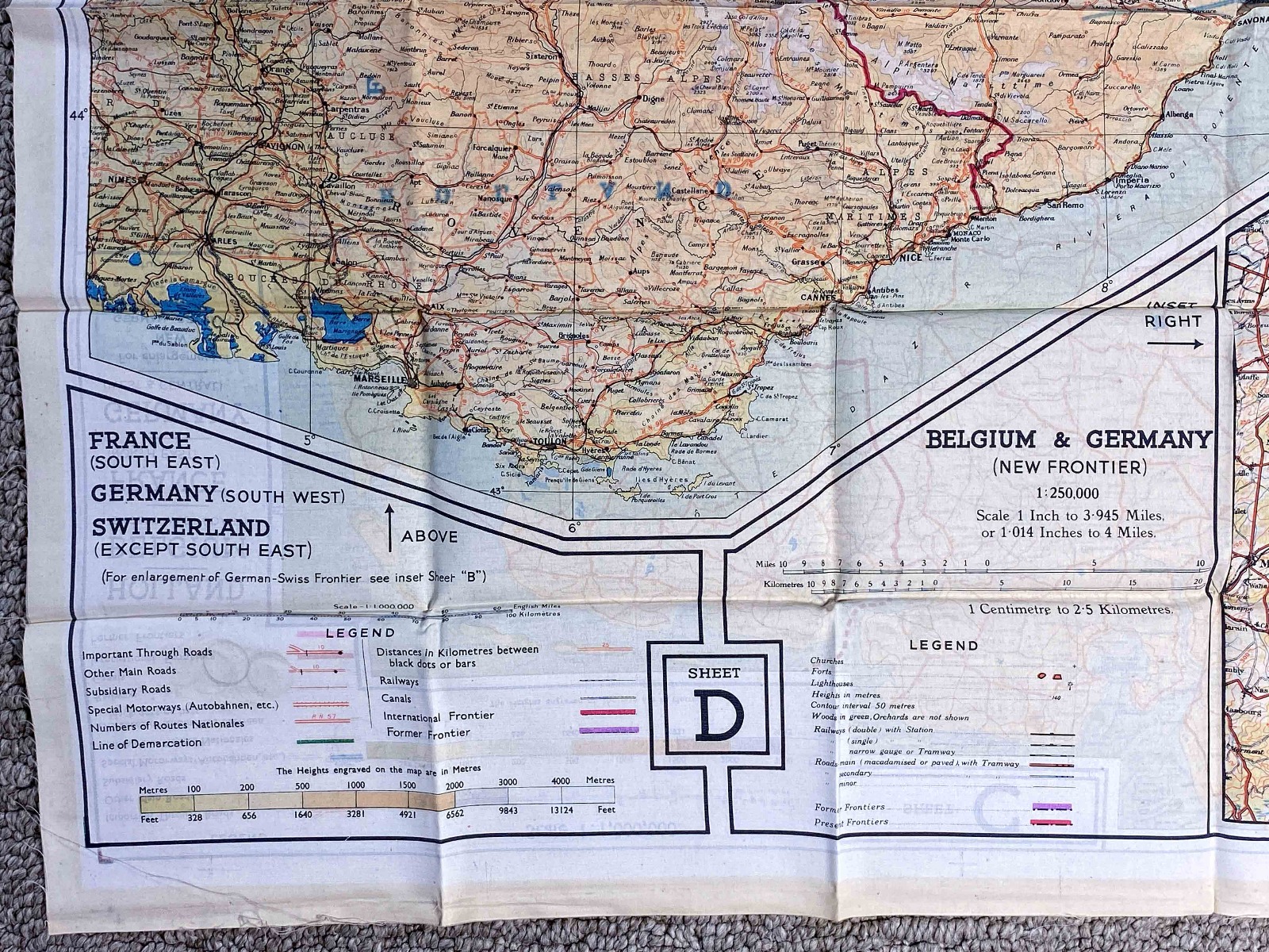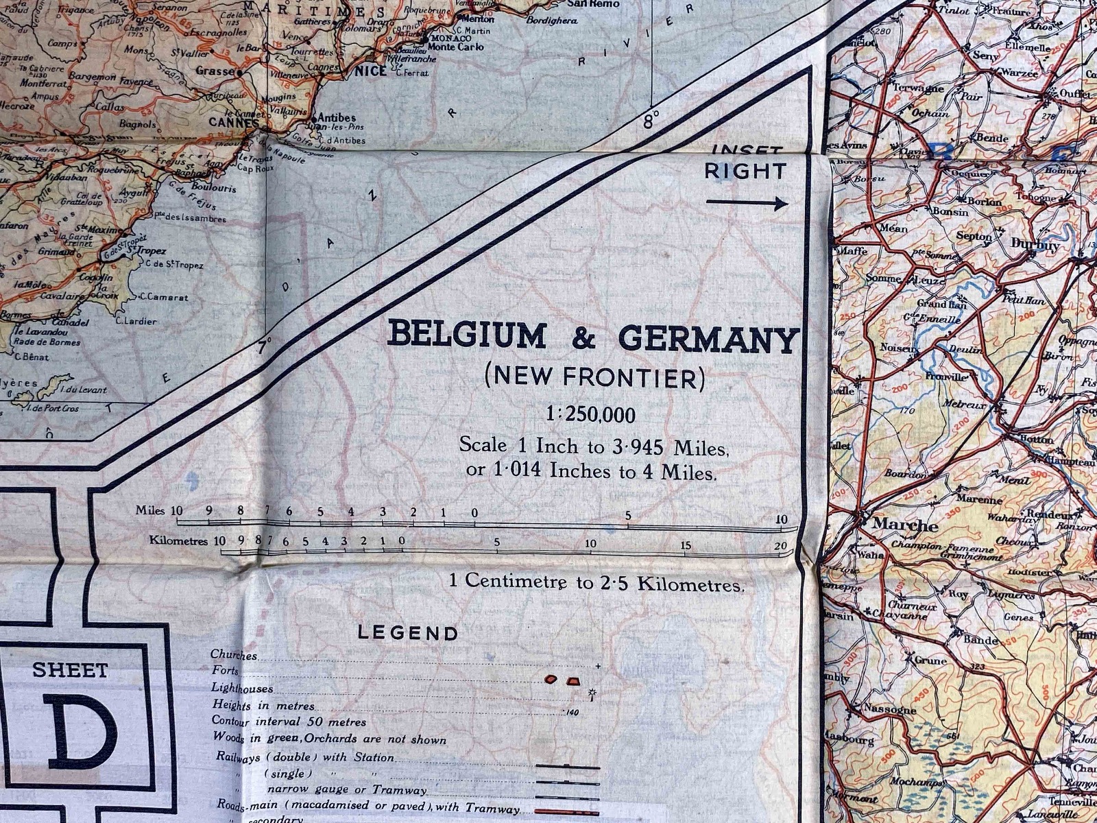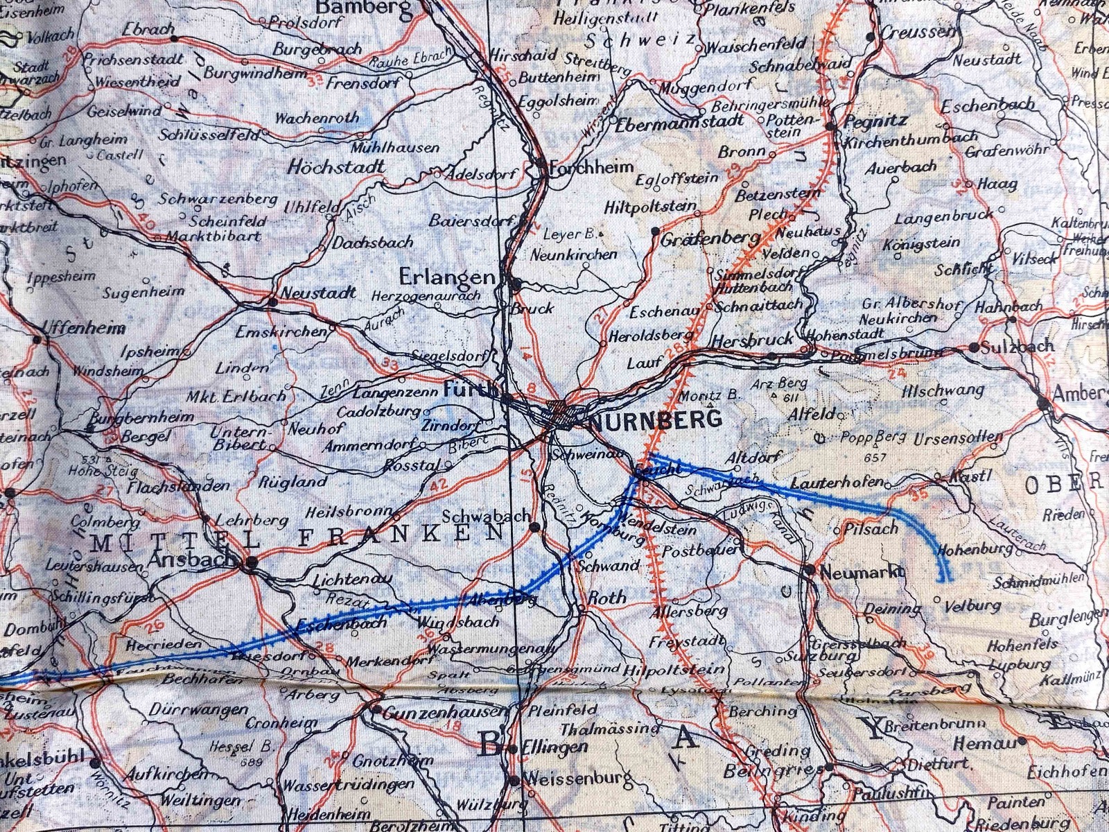 5/20/20 – This is an original WW2 pilot’s silk escape map. The map is in excellent condition with some minor fraying on the edges. The map is “Sheet D” and “Sheet C”. This was issued to the RAF and USAAF operating over enemy territory. Covers France, Germany, and Switzerland. Size is 29×30 inches.