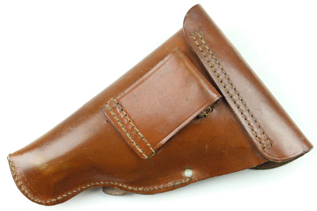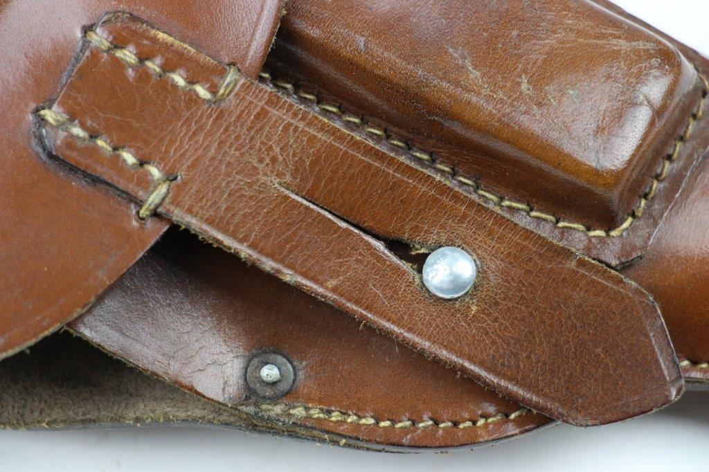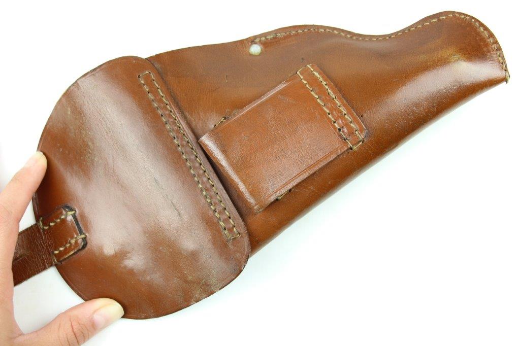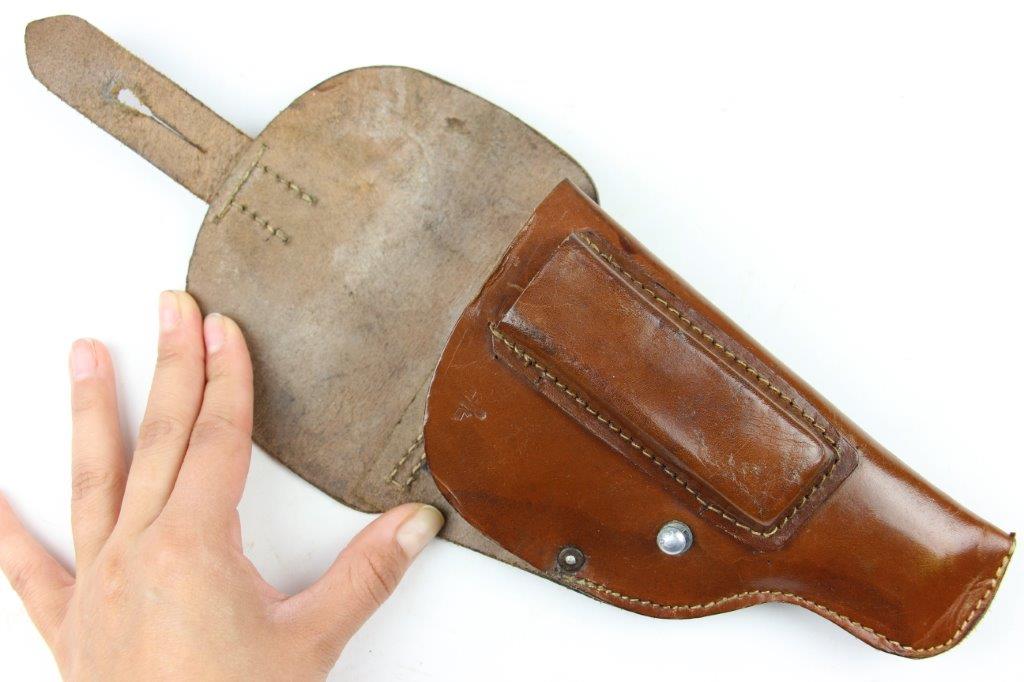 5/14/24 – This is an original WW2 German Police 7.65mm Holster. The holster has no date stamp, but the front leather is police eagle stamped under the closure strap, and the interior leather is ink stamped, “Primosa Stuttgart”. The size and shape of the holster is best suitable for a Walther PP or similar sized 7.65mm Axis pistol. The leather is in near-excellent condition with light signs of previous use, and mild surface wrinkling throughout. The interior leather is fairly clean. Excellent, original stitching throughout.