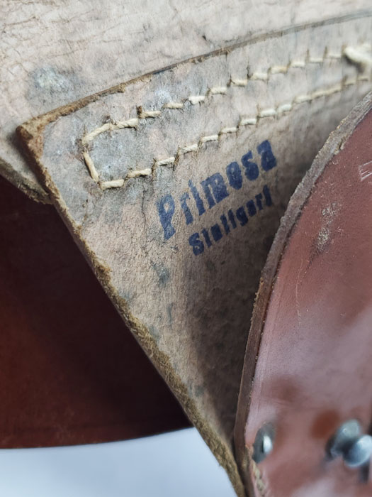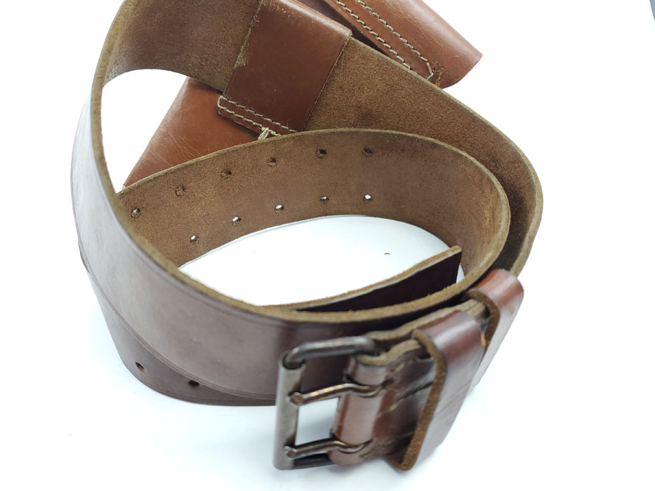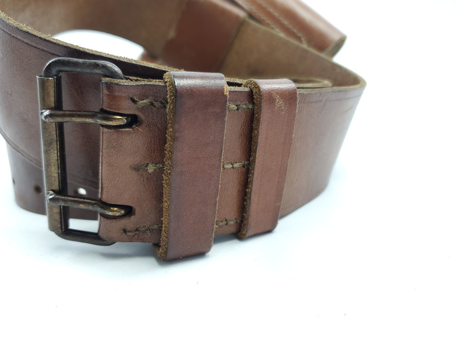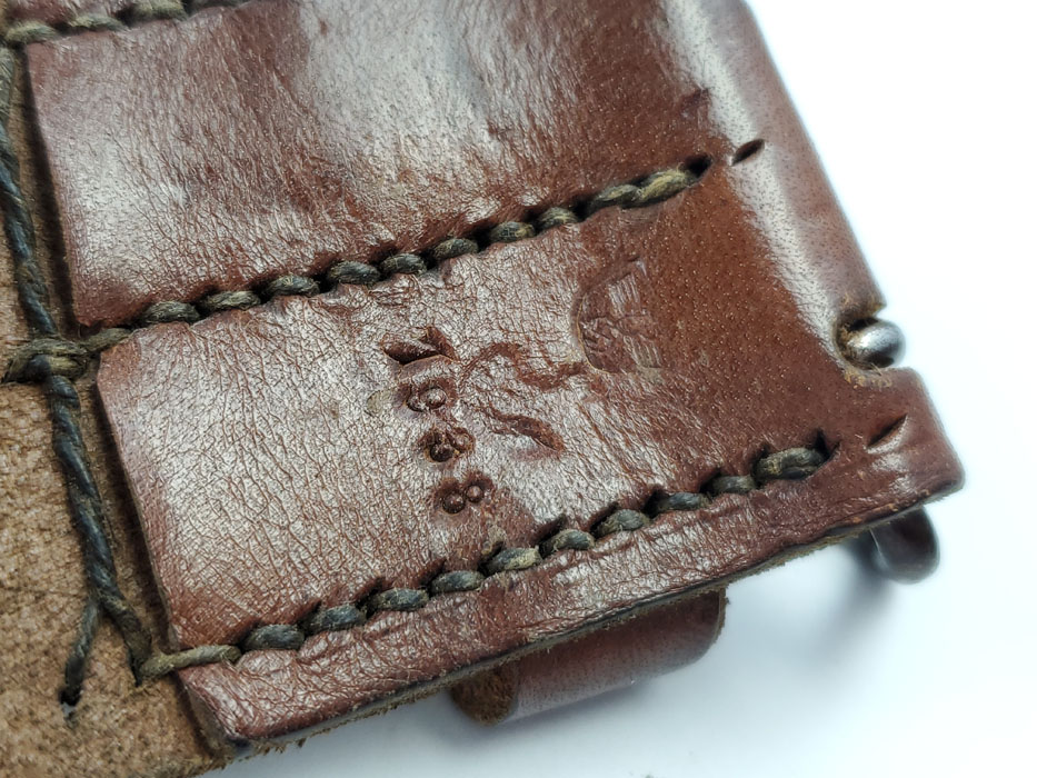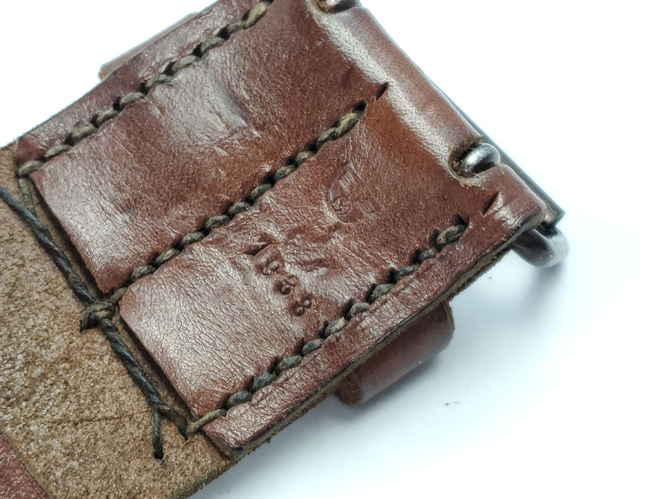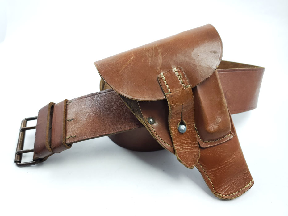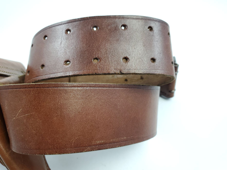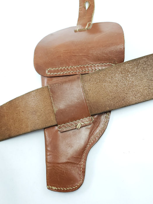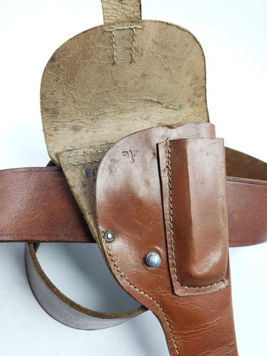 4/1/20 – This is an original WW2 nazi Police pistol holster and belt. The holster would fit a Walther PPK, Mauser HSc, Sauer 38h, or similar sized pistol. May be a little snug of a fit as the leather doesn’t appear to have held a pistol in a long time. The front leather is police eagle stamped, and the interior leather is ink stamped “Primosa Stuttgart”. The stitching is all tight and in tact. Attached to the holster is a WW2 era belt. The belt is 1938 dated and eagle stamped as well, but these stamps are very deep and we doubt they are authentic. The belt, although in minty condition, does appear to be aged and may be authentic / period correct. Priced accordingly.