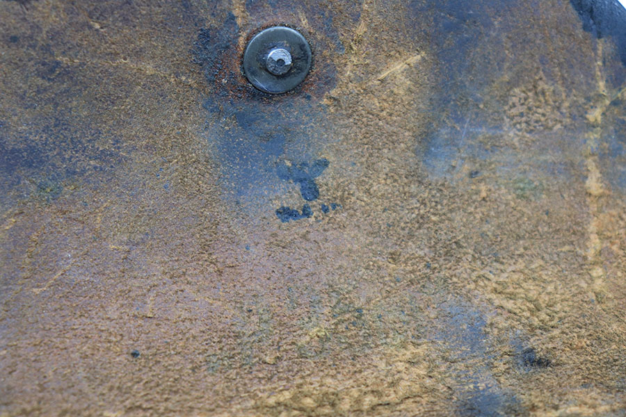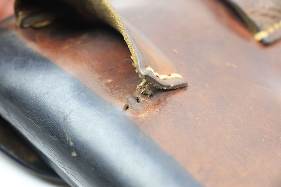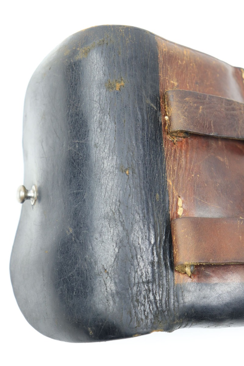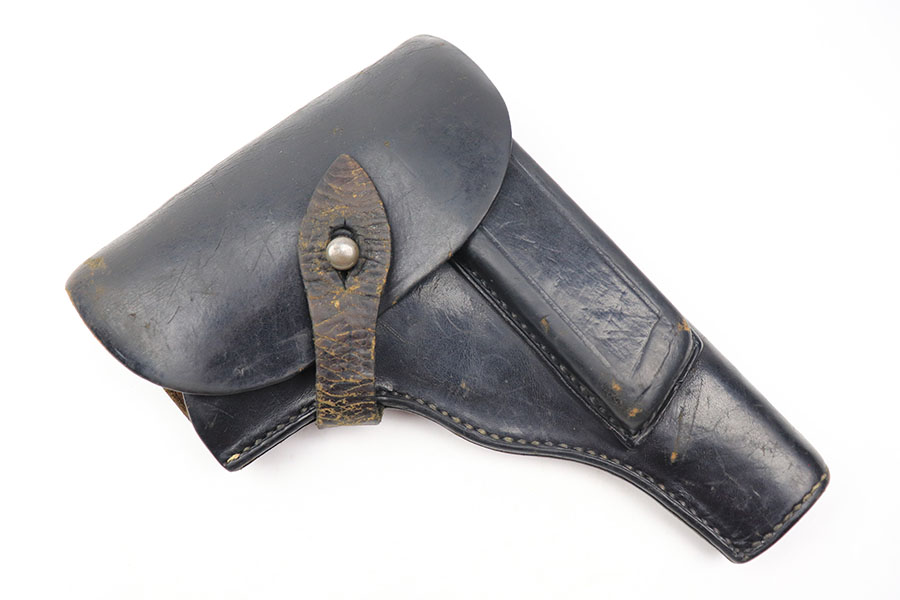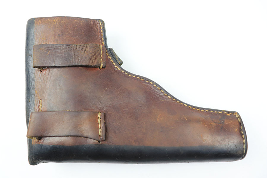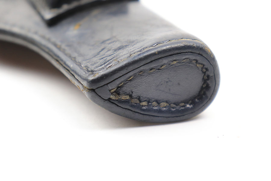 11/29/21 – This is an original WW2 era Radom holster. The holster has a waffen eagle ink stamp on the interior leather with no other markings. The holster appears to have been brown and then later painted black, as indicated by the lines of paint on the back leather. This was done in the 1940s by the German military. The holster has nice original stitching throughout and normal wear / aging throughout the leather.