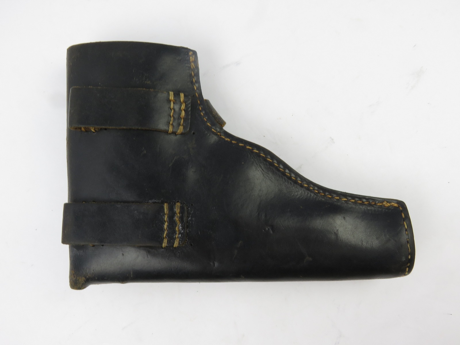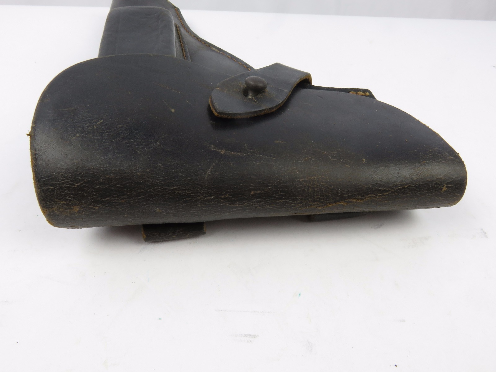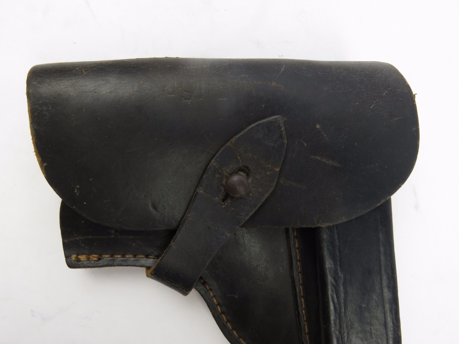 8/9/17 – This is an original WW2 production Radom holster. The holster is in good condition, but has no maker stamps, date stamps, or markings that I could find. The front top leather seems to have a light “Sp” stamp with some light scratching over top of it. The leather is in good condition with normal wear. The closure strap has some minor surface cracking, but no deep cracks or rips. The stitching is all tight and original. Guaranteed original from WW2.