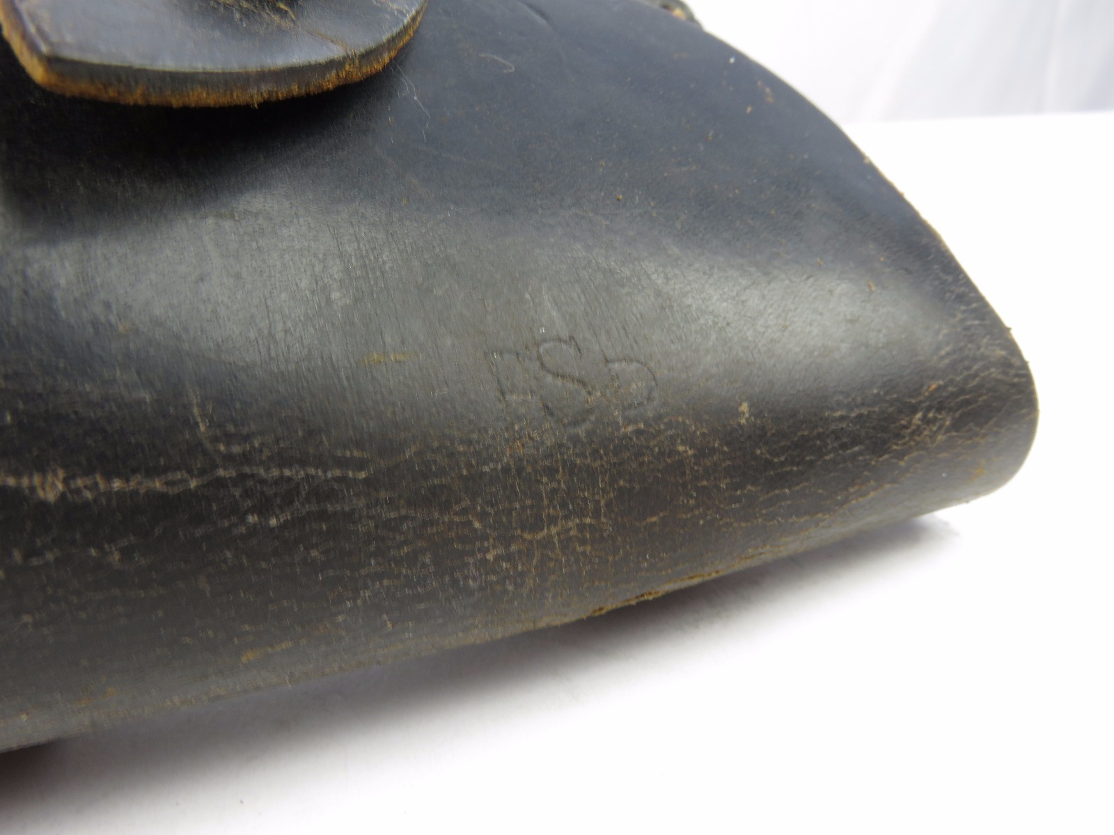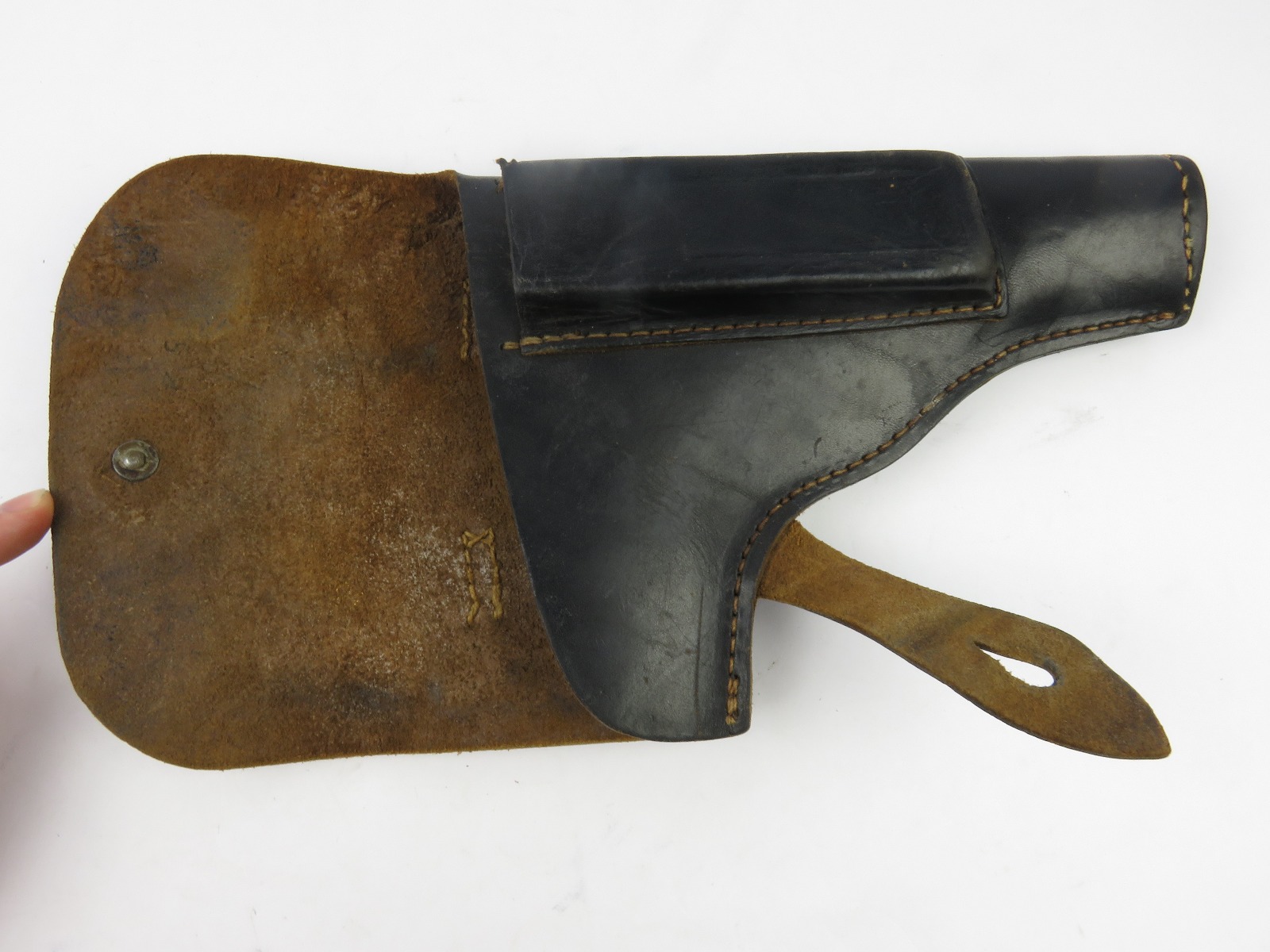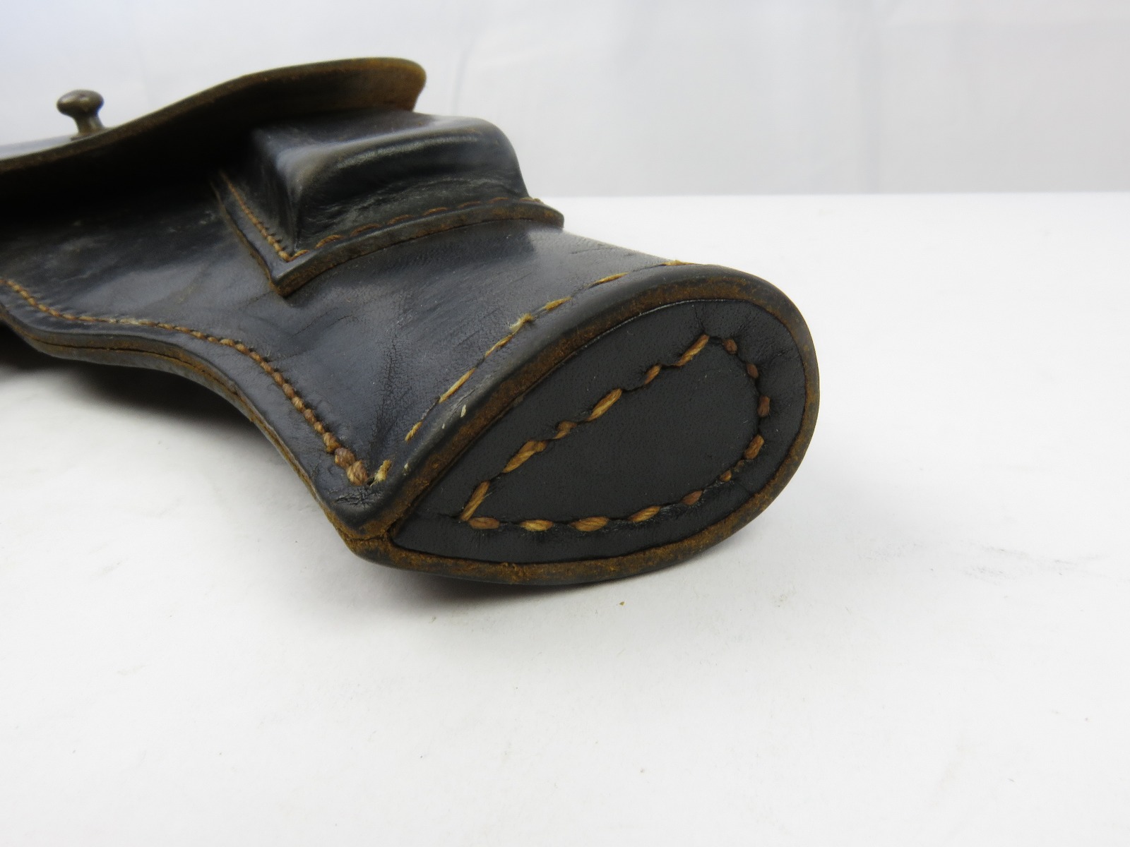 8/9/17 – This is an original WW2 production Radom holster. The holster is in good condition, but has no maker stamps, date stamps, or markings that I could find. The front top leather seems to have a light “Sp” stamp with some light scratching over top of it. The leather is in good condition with normal wear. The closure strap has some minor surface cracking, but no deep cracks or rips. The stitching is all tight and original. Guaranteed original from WW2.