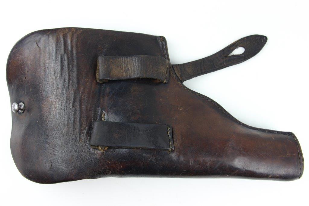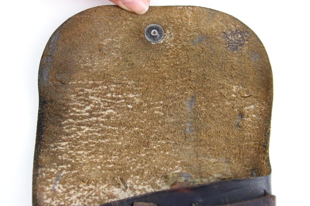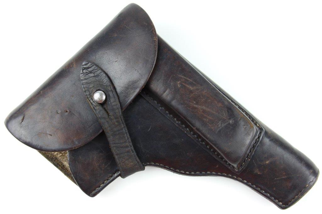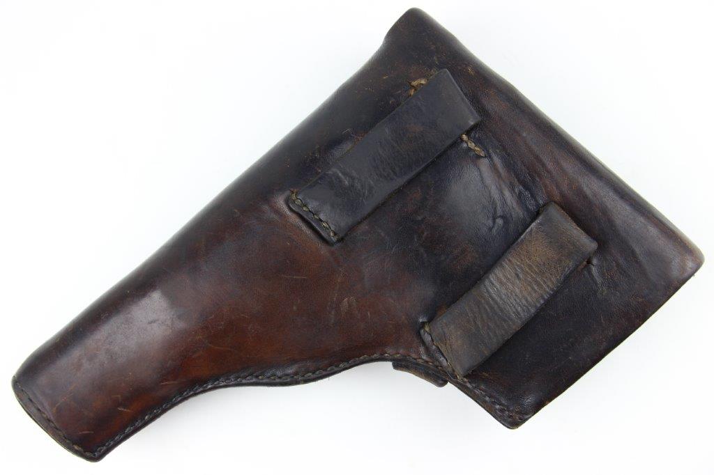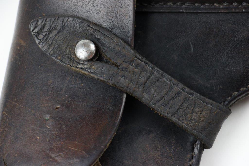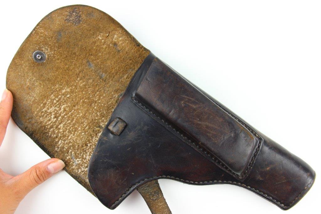 6/26/24 – This is an original WW2 era production Radom VIS 35 pistol holster. The holster has no visible markings or stamps, however we suspect the interior leather was once ink stamped in the upper right corner (where there’s currently a dark smudge of some sort; the markings have likely worn away with age). The leather has normal pliability with evidence of use wear throughout. Some small surface scuffs and wrinkling on the exterior. The front leather has a small pin-hole which indicates this was likely embellished with a uniform emblem or medal of some sort at one point in time. Excellent original stitching throughout.