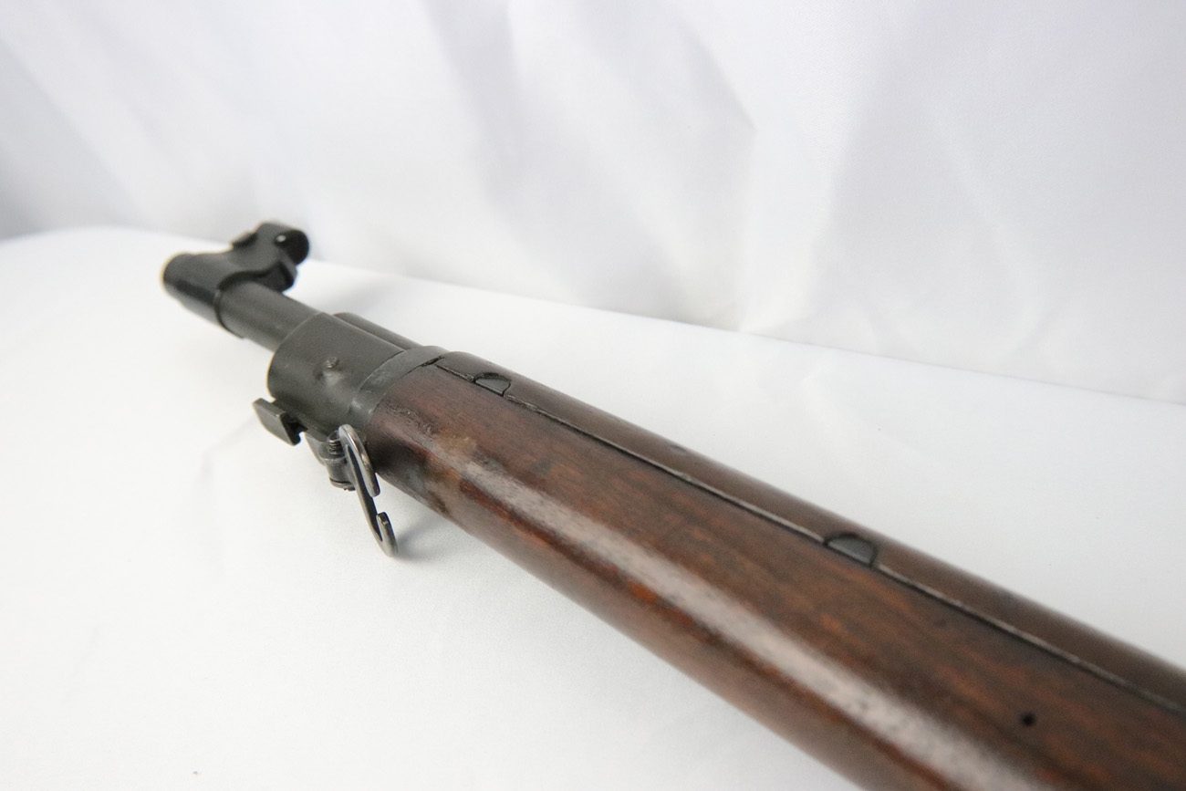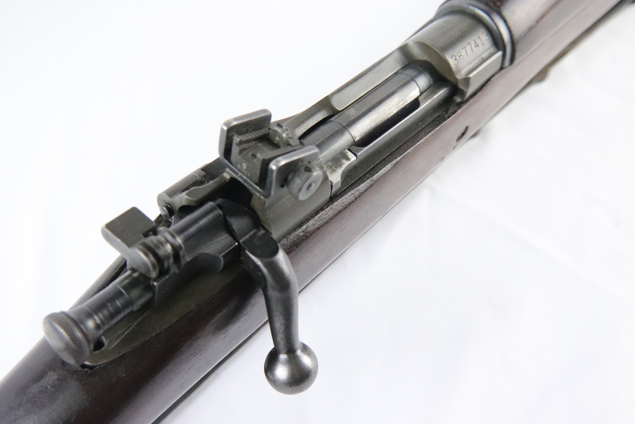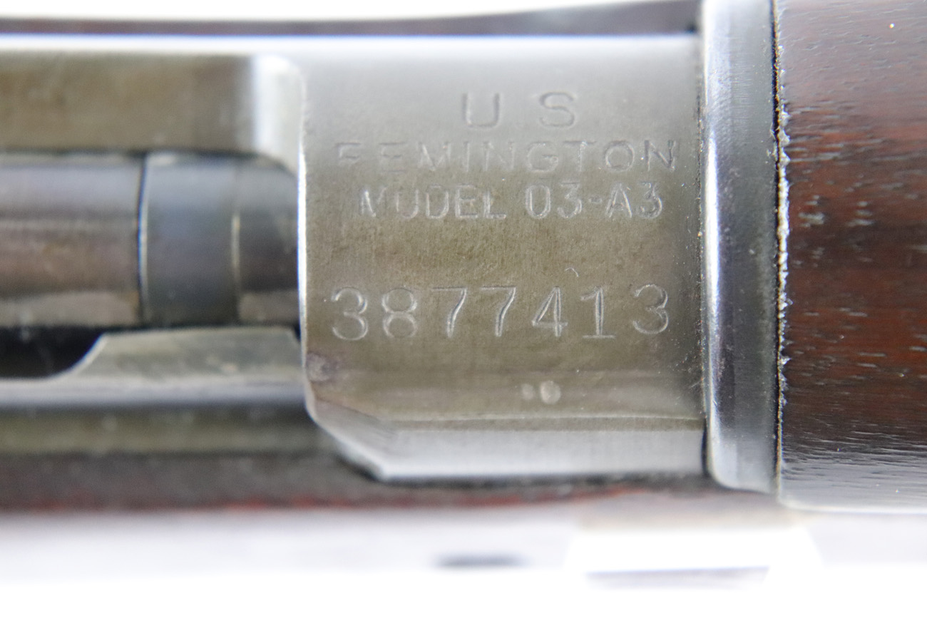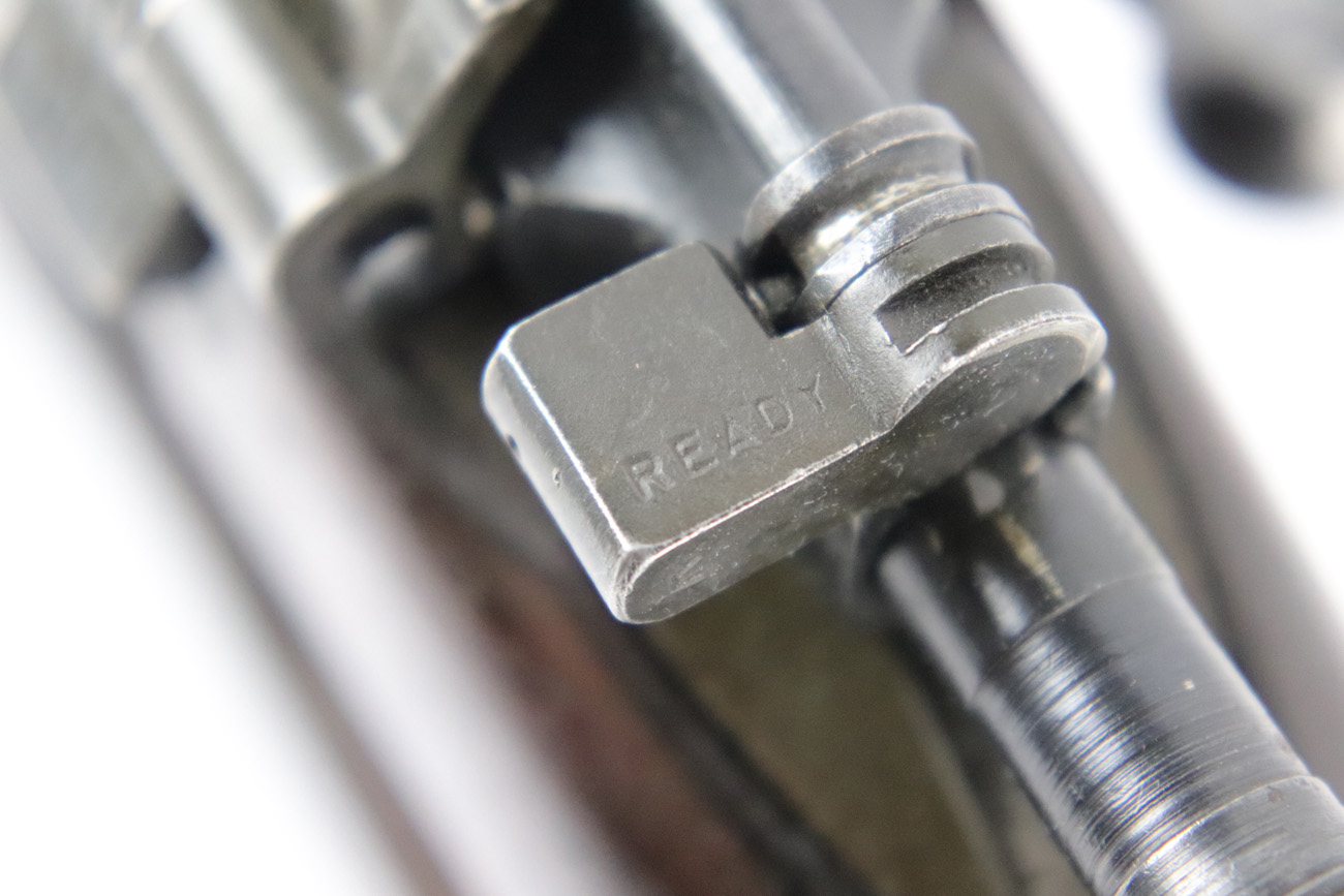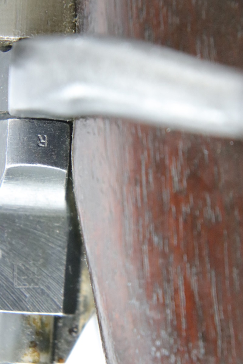 11/26/18 – This is an original 1943 Remington 1903-A3 rifle from WW2. The rifle is all original and correct with all parts blued except for the receiver which is parkerized. The finish on the metal parts has some normal thinning and use wear. There isn’t any excessive wear or corrosion on the metal parts though. The bore is very nice with excellent rifling. There is some minimal residue and signs of being fired, but this can easily be cleaned. The stock is original and has the proper cartouche and FJA inspector stamp, but these stamps are EXTREMELY faint. They’re to the right of the “RA” arsenal stamp on the left side of the stock. The upper portion of the handguard closer to the barrel has a crack in it – see photos. This is a very light crack and some would see it as “character” in the wood. Otherwise the stock is in great shape. Guaranteed original.