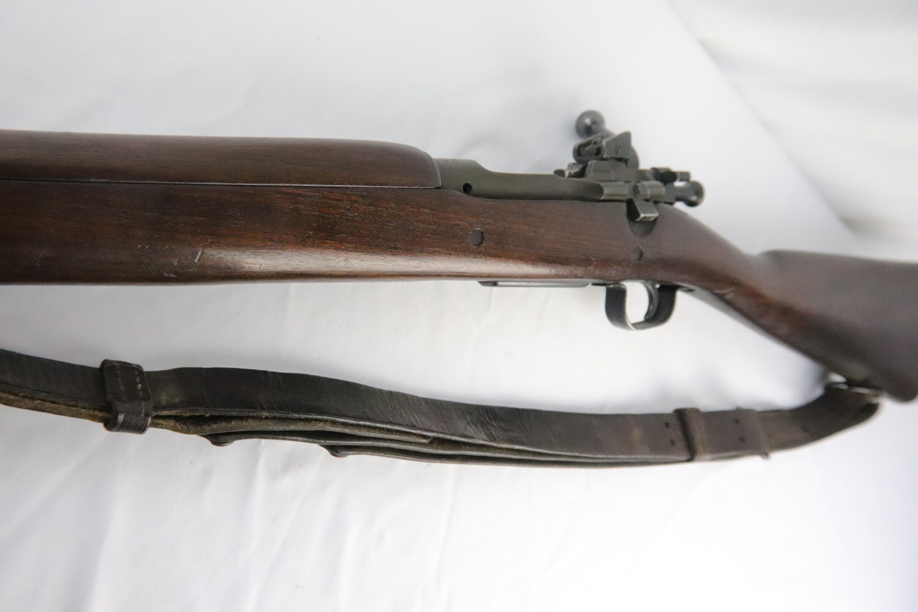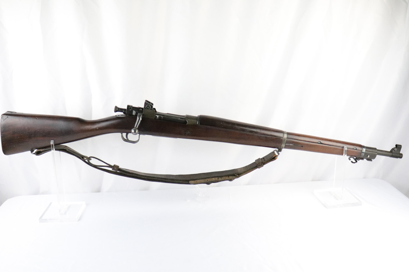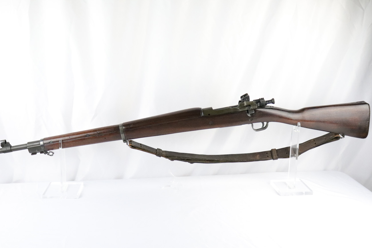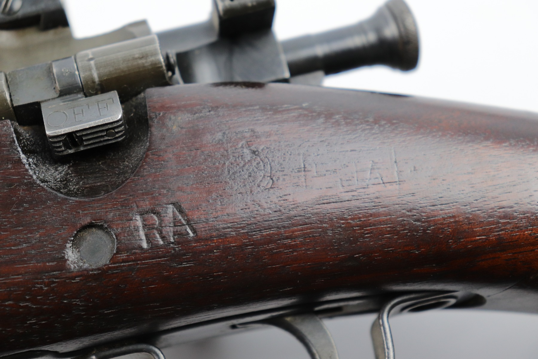 11/26/18 – This is an original 1943 Remington 1903-A3 rifle from WW2. The rifle is all original and correct with all parts blued except for the receiver which is parkerized. The finish on the metal parts has some normal thinning and use wear. There isn’t any excessive wear or corrosion on the metal parts though. The bore is very nice with excellent rifling. There is some minimal residue and signs of being fired, but this can easily be cleaned. The stock is original and has the proper cartouche and FJA inspector stamp, but these stamps are EXTREMELY faint. They’re to the right of the “RA” arsenal stamp on the left side of the stock. The upper portion of the handguard closer to the barrel has a crack in it – see photos. This is a very light crack and some would see it as “character” in the wood. Otherwise the stock is in great shape. Guaranteed original.