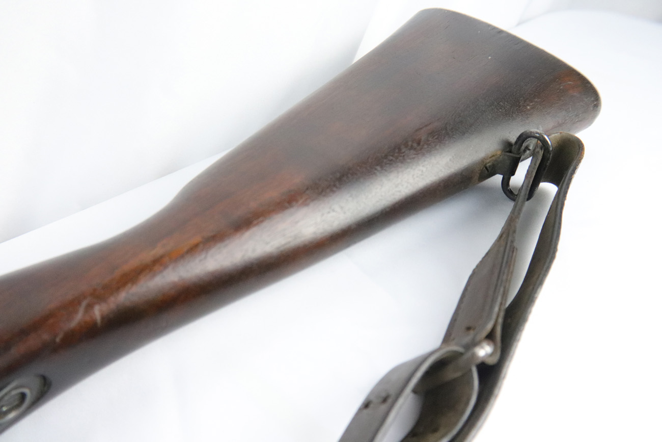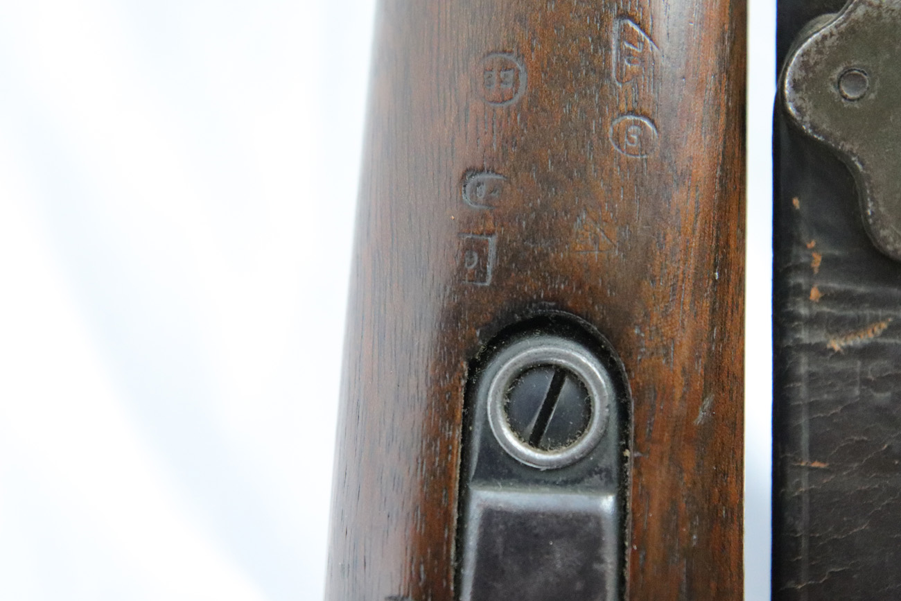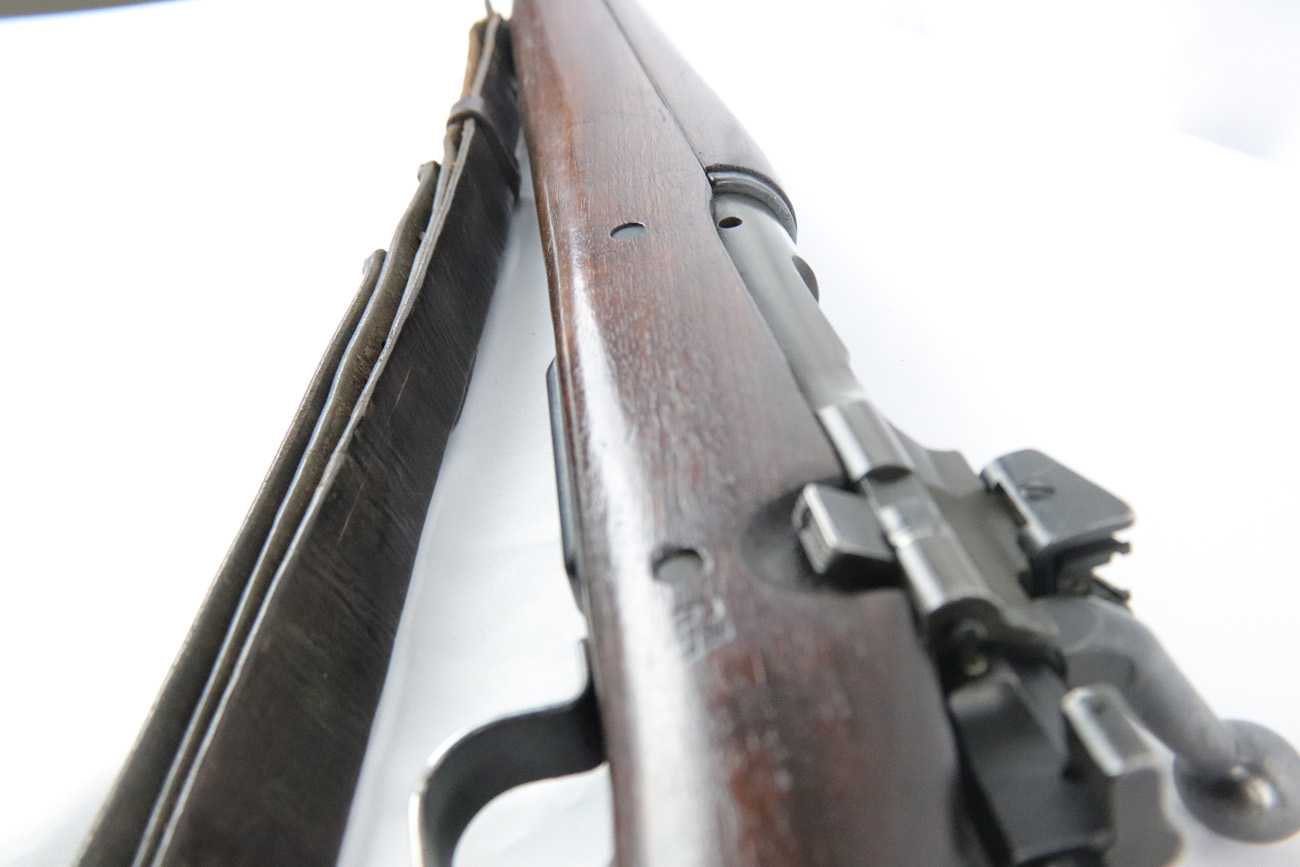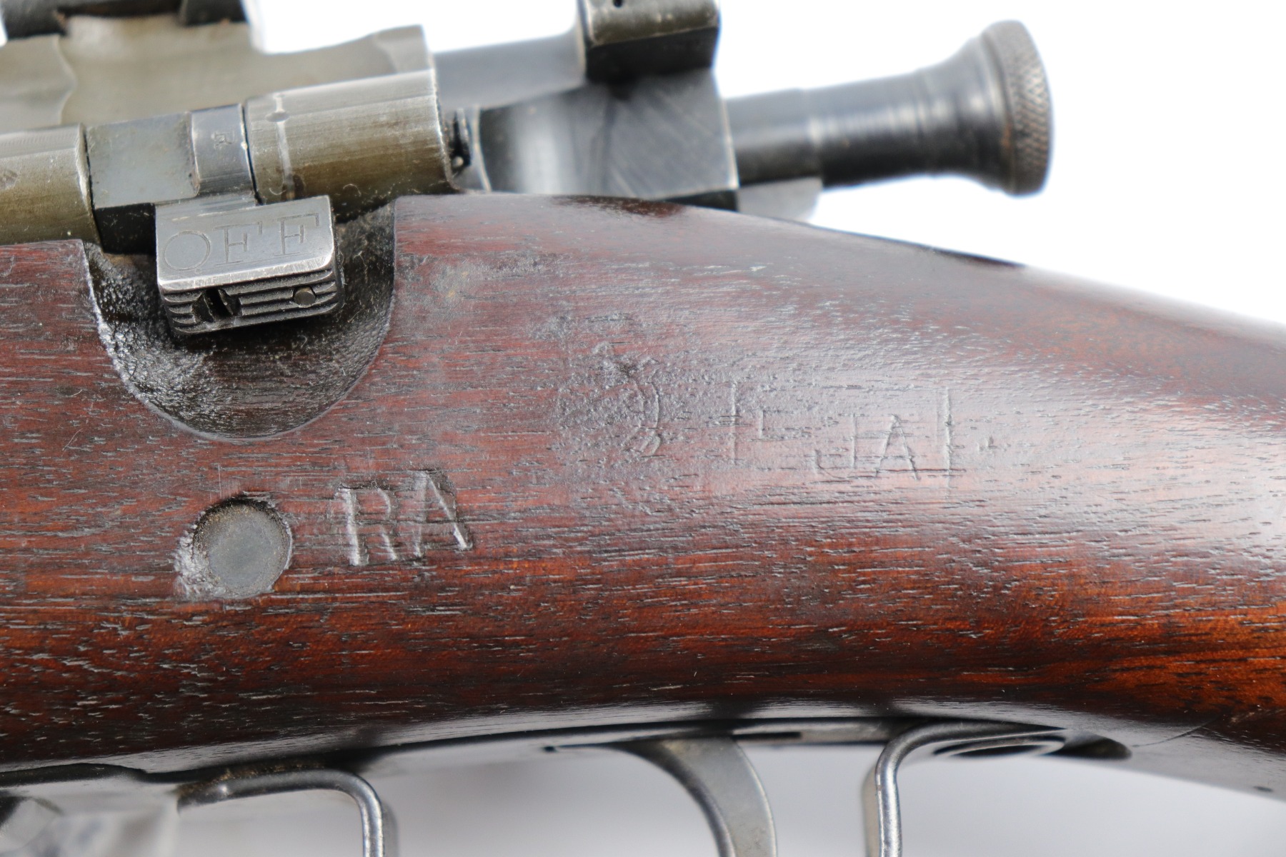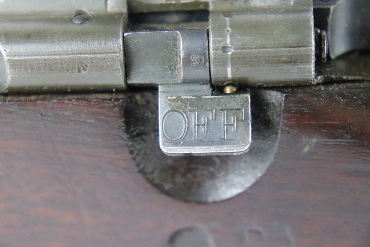 11/26/18 – This is an original 1943 Remington 1903-A3 rifle from WW2. The rifle is all original and correct with all parts blued except for the receiver which is parkerized. The finish on the metal parts has some normal thinning and use wear. There isn’t any excessive wear or corrosion on the metal parts though. The bore is very nice with excellent rifling. There is some minimal residue and signs of being fired, but this can easily be cleaned. The stock is original and has the proper cartouche and FJA inspector stamp, but these stamps are EXTREMELY faint. They’re to the right of the “RA” arsenal stamp on the left side of the stock. The upper portion of the handguard closer to the barrel has a crack in it – see photos. This is a very light crack and some would see it as “character” in the wood. Otherwise the stock is in great shape. Guaranteed original.