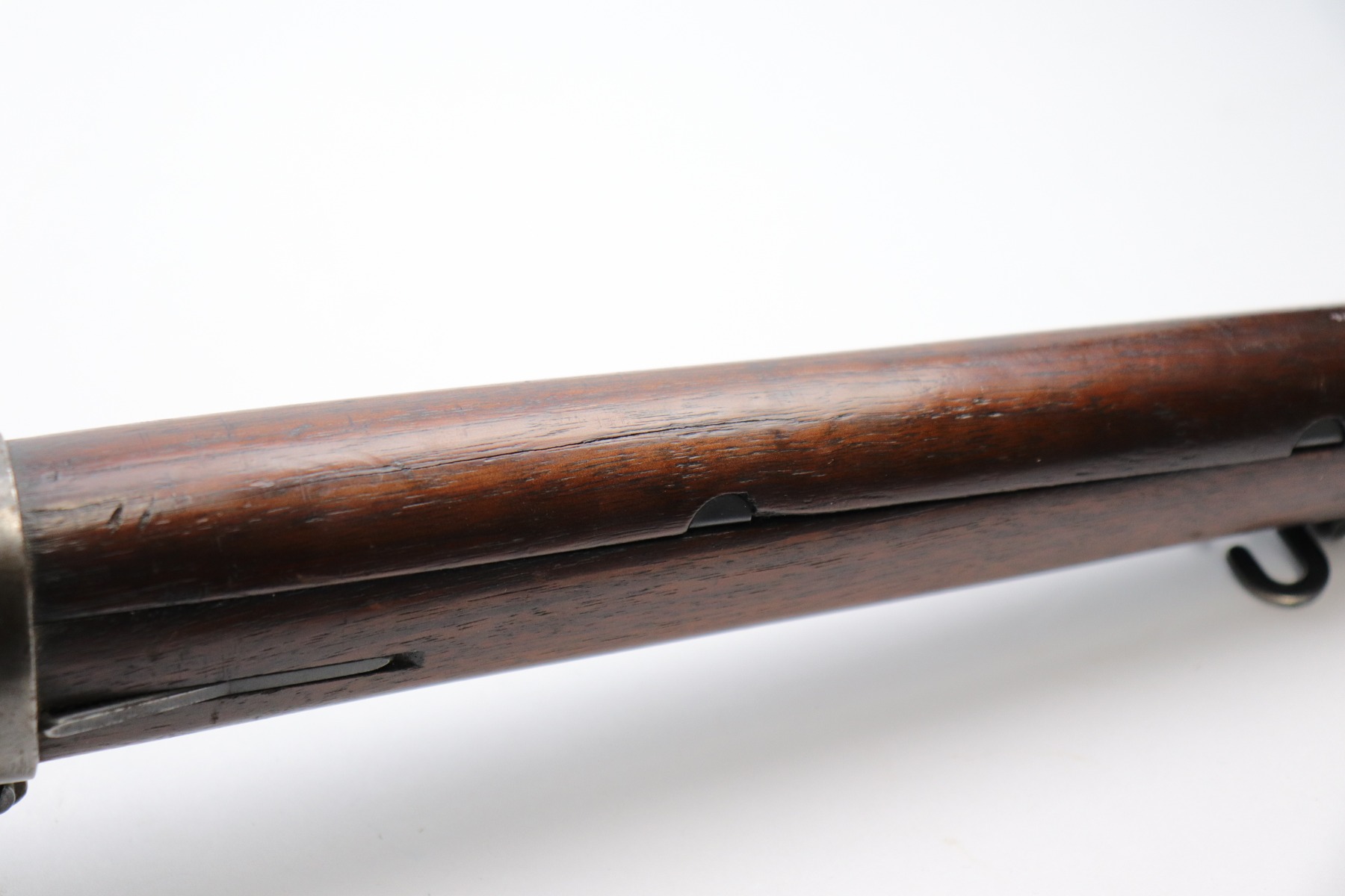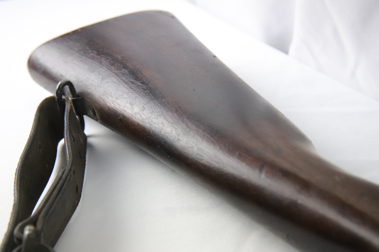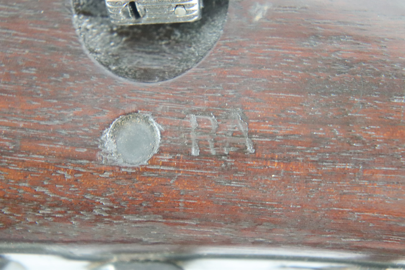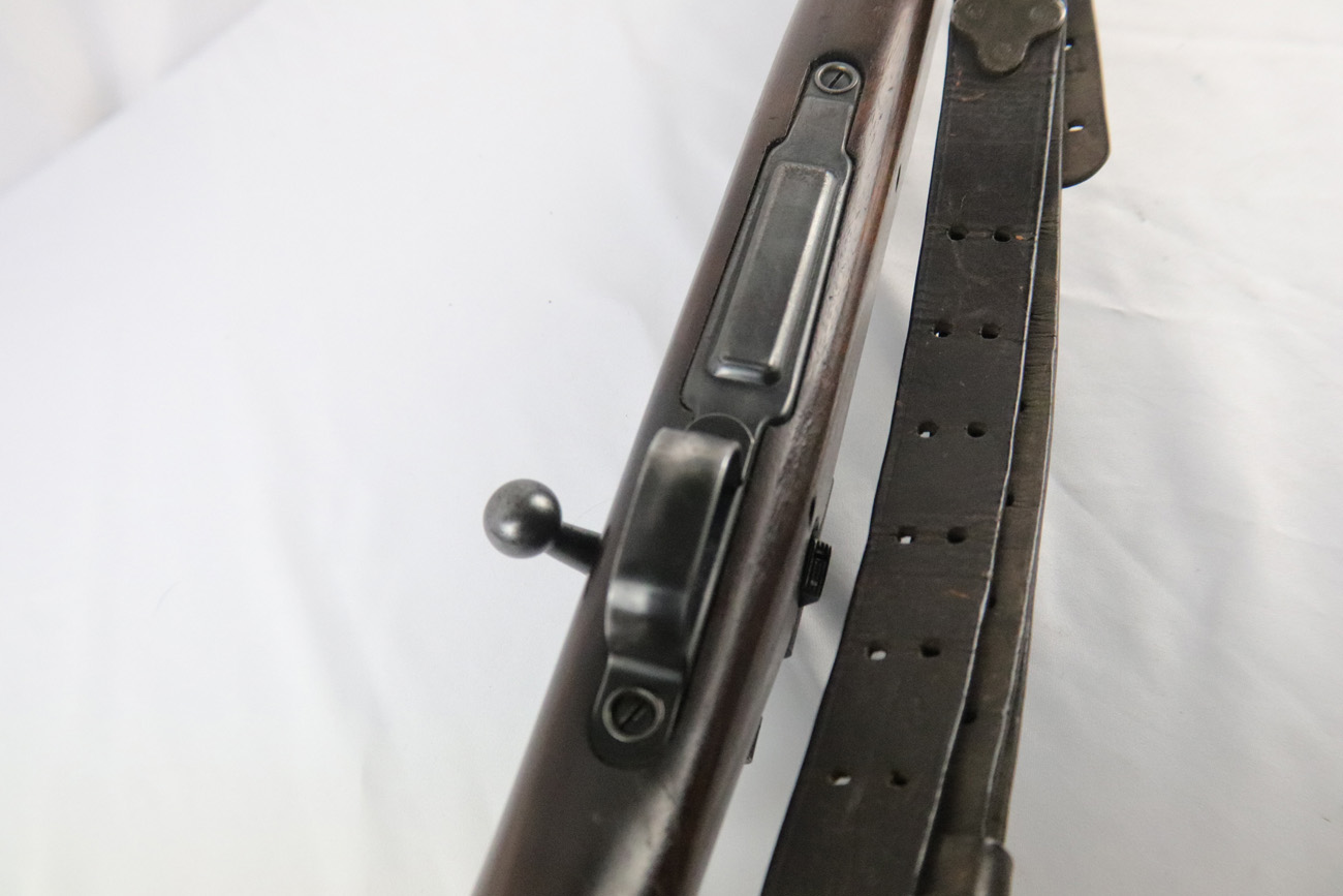 11/26/18 – This is an original 1943 Remington 1903-A3 rifle from WW2. The rifle is all original and correct with all parts blued except for the receiver which is parkerized. The finish on the metal parts has some normal thinning and use wear. There isn’t any excessive wear or corrosion on the metal parts though. The bore is very nice with excellent rifling. There is some minimal residue and signs of being fired, but this can easily be cleaned. The stock is original and has the proper cartouche and FJA inspector stamp, but these stamps are EXTREMELY faint. They’re to the right of the “RA” arsenal stamp on the left side of the stock. The upper portion of the handguard closer to the barrel has a crack in it – see photos. This is a very light crack and some would see it as “character” in the wood. Otherwise the stock is in great shape. Guaranteed original.