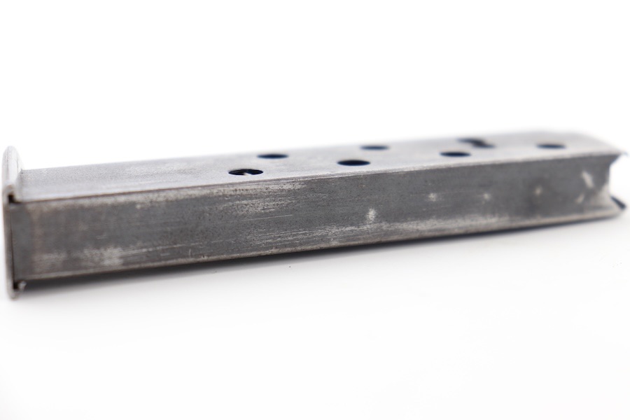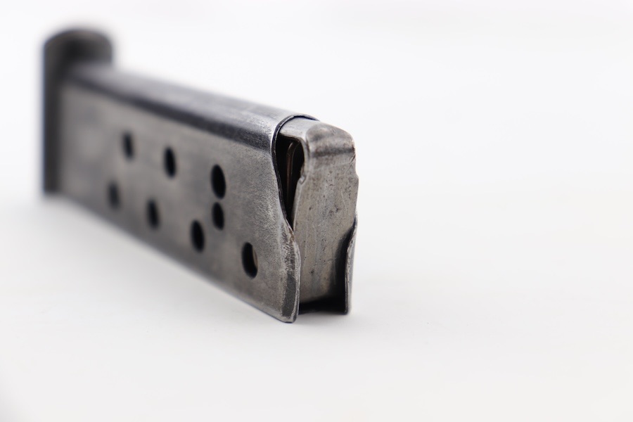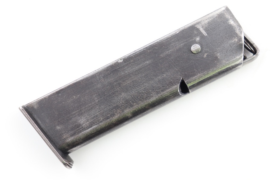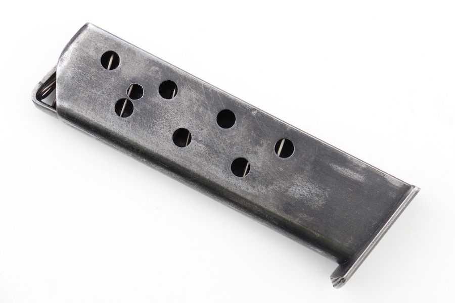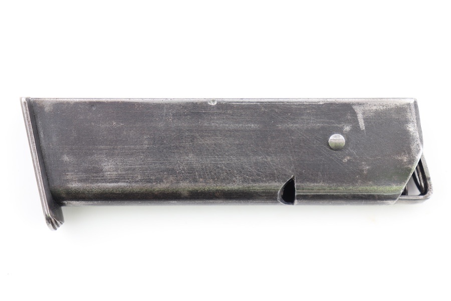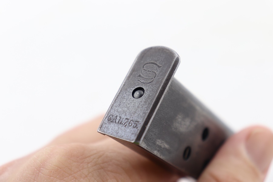 1/29/24 – This is an original Sauer 38h pistol magazine from WW2. The magazine is an earlier WW2 production style with a double ‘S’ Sauer logo and “Cal. 7,65” underneath. The base has a high polish blued finish and shows some light edge wear and patina but great overall condition. The tube has some finish loss and no rust or pitting. Strong, functional spring.