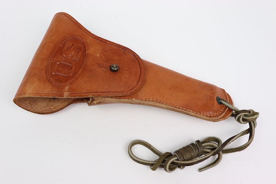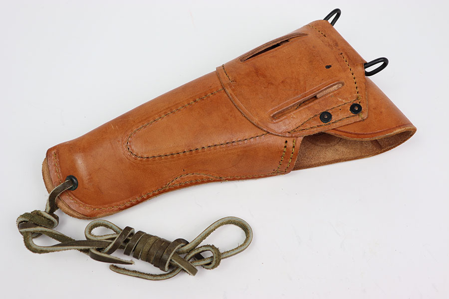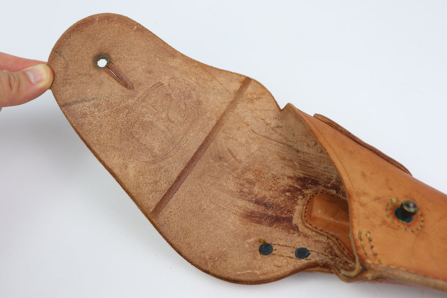 2/22/24 – This is a WW2 era production Sears M1916 holster for the M1911A1 pistol. The holster is in excellent condition with clean leather that has normal pliability and little signs of aging. The front leather is crisply stamped ‘US’ and the back leather is Sears maker stamped. No stitching issues. Some light use wear on the interior leather. Lanyard strap attached and intact.