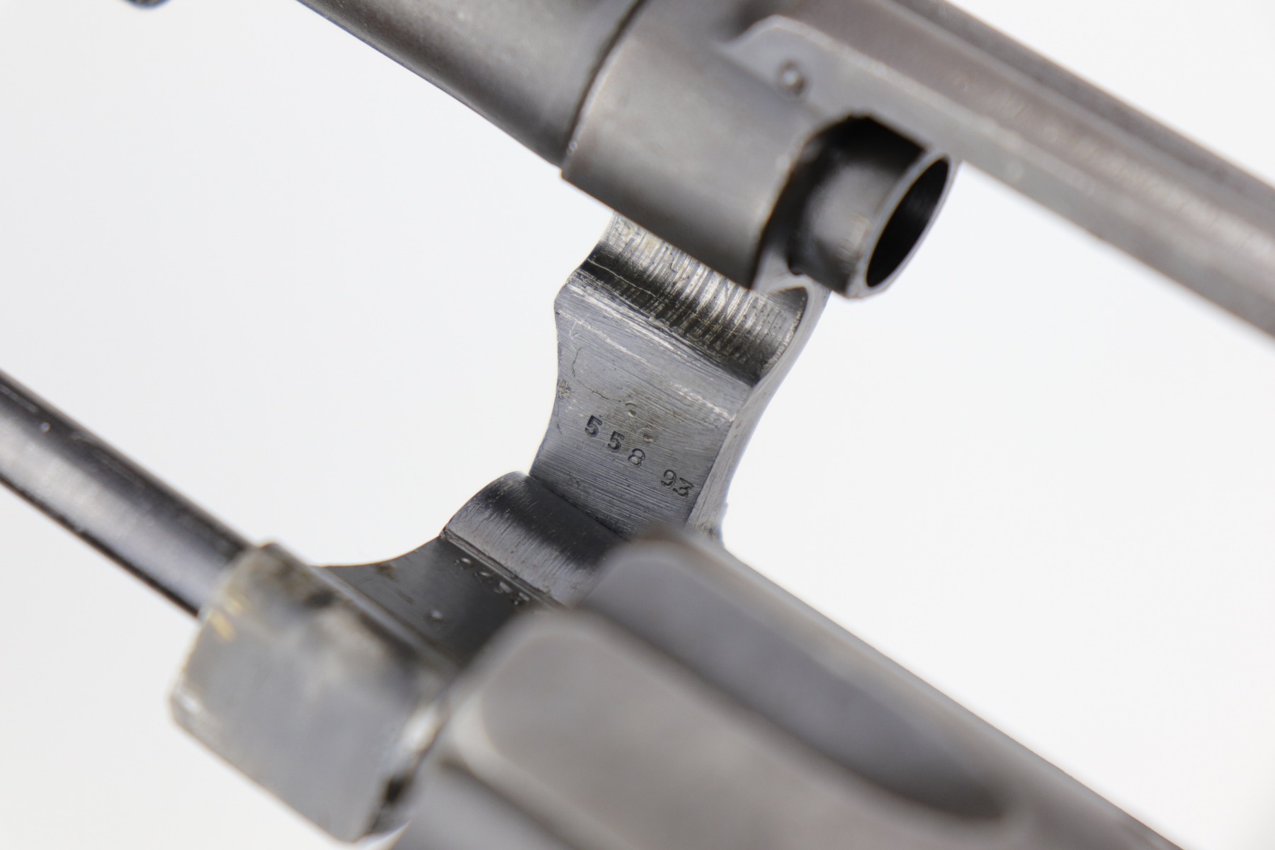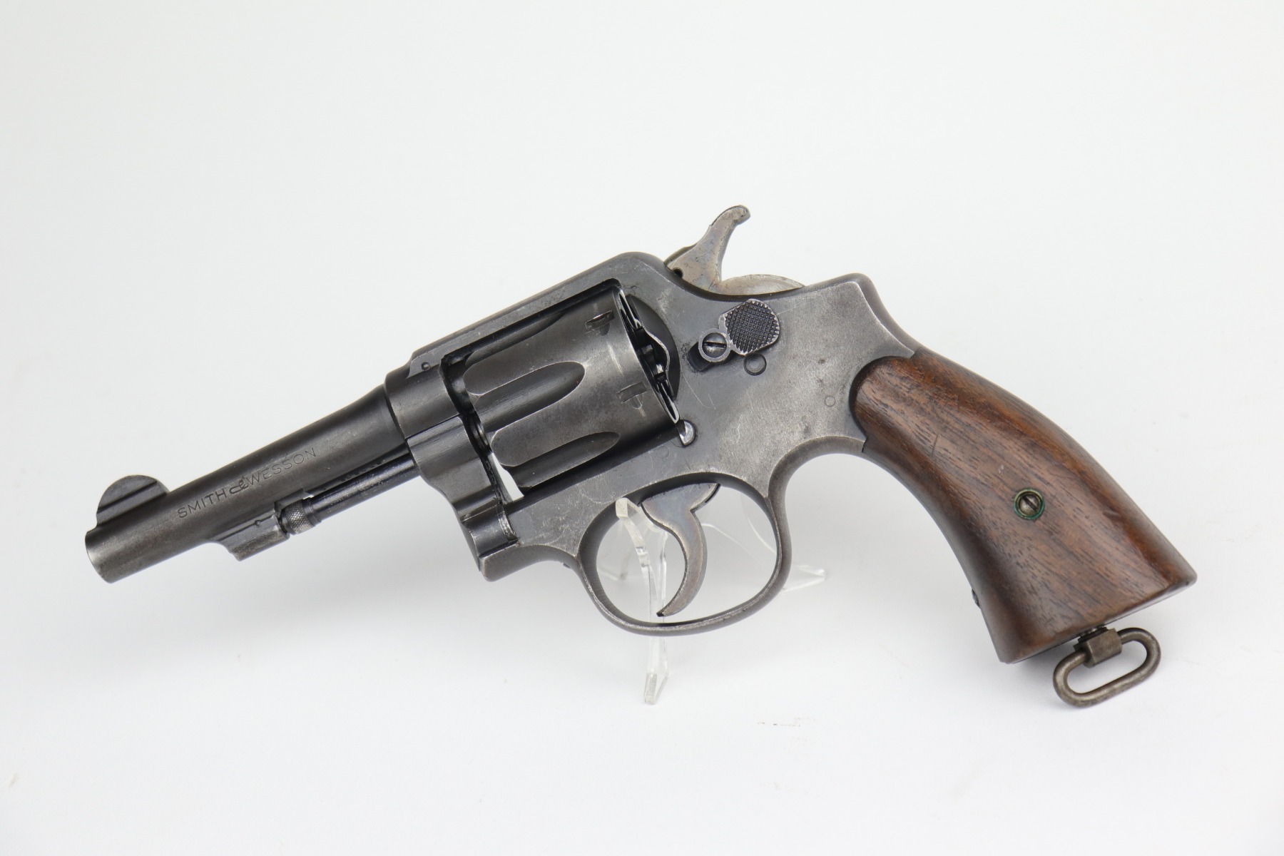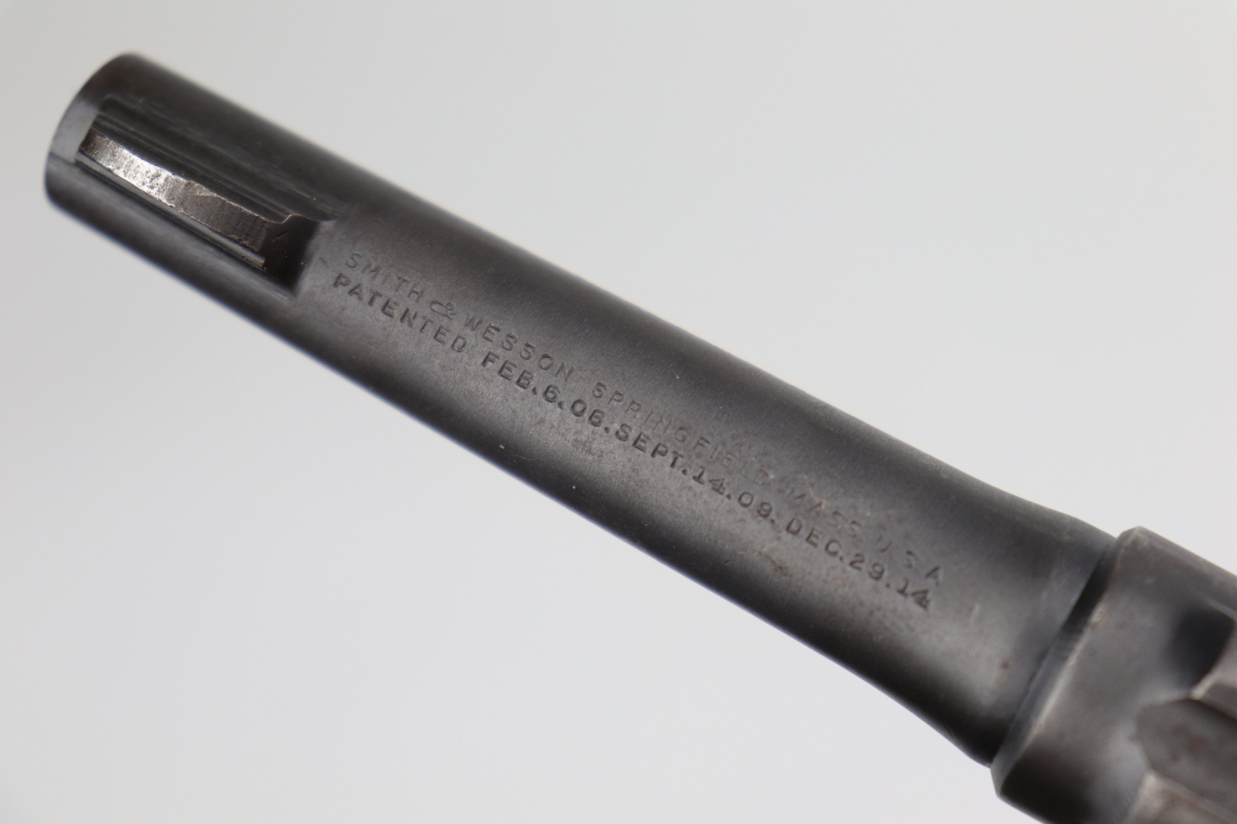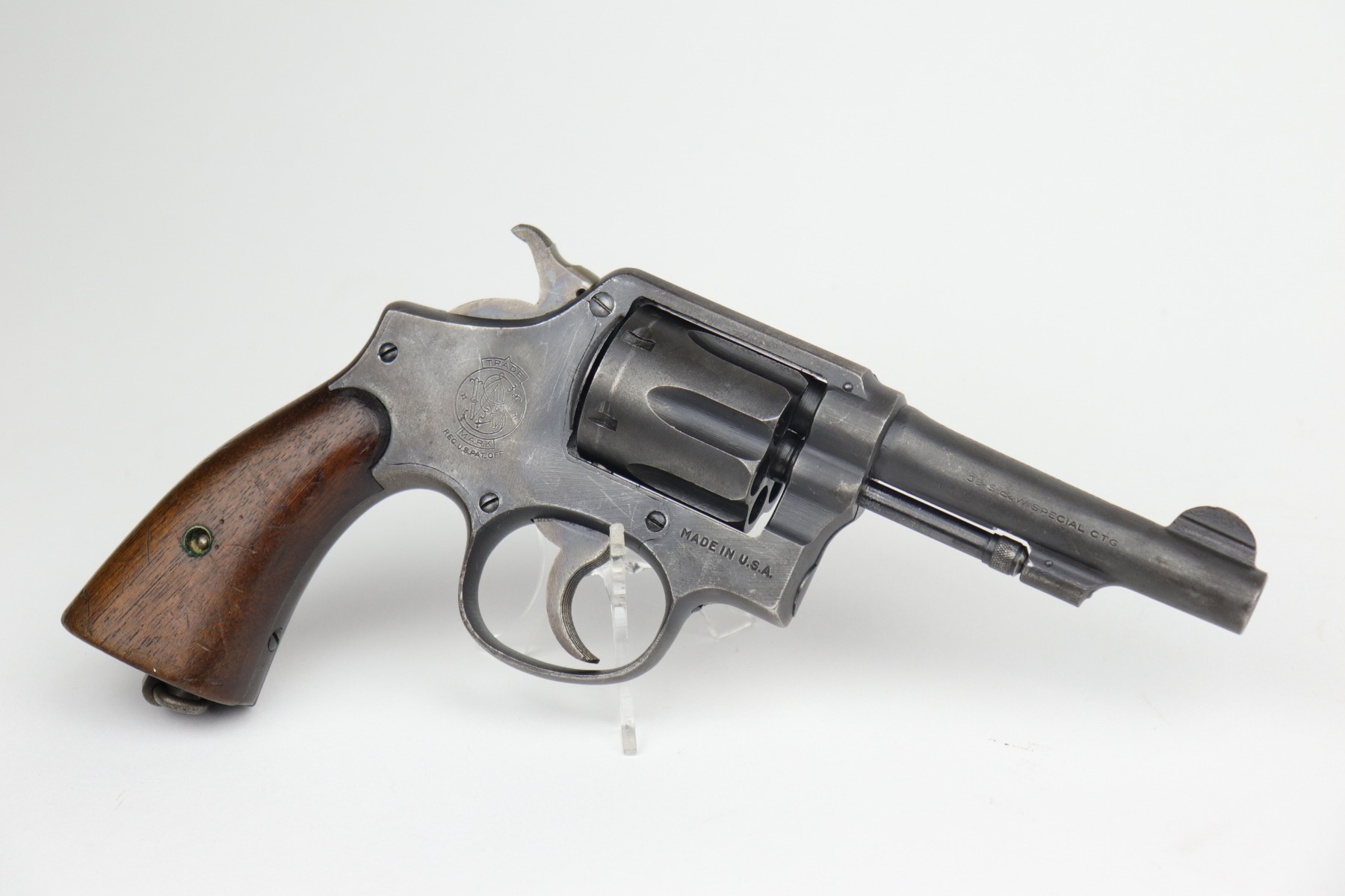 12/31/20 – This is a nice example of a Smith & Wesson Victory revolver issued to the US Military during WW2. The gun is correct and has a flaming bomb proof and “US Property” marking. It has retained about 90% of its original finish. There is minor wear around the muzzle and on the high edges. There are areas of minor thinning on the side of the frame and some patina on the straps. Areas of minor oxidation here and there. Roll mark on the cylinder. The cylinder is tight and the action is smooth. The bore is near-mint.