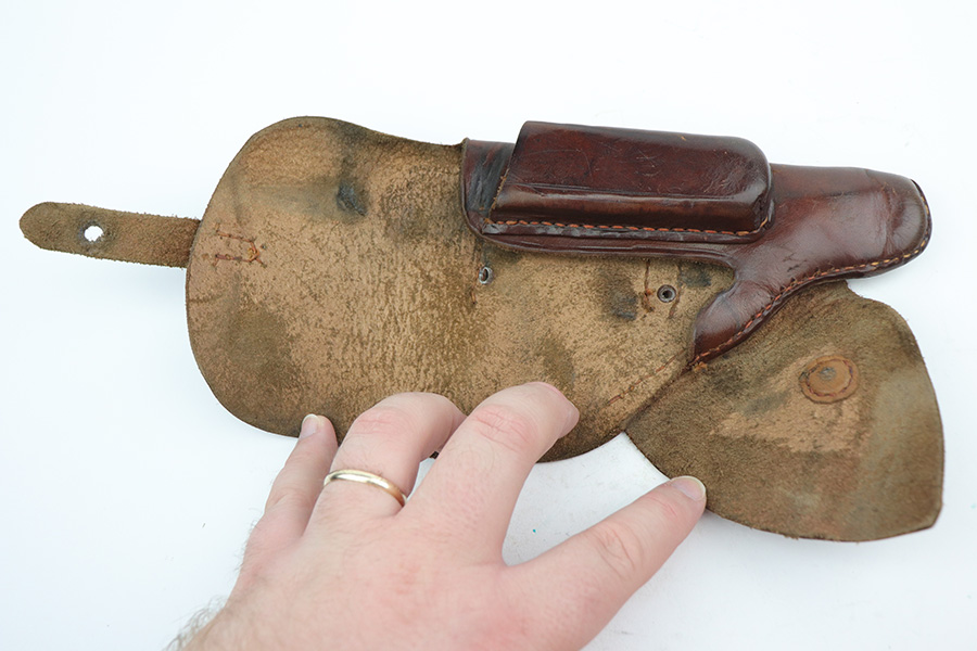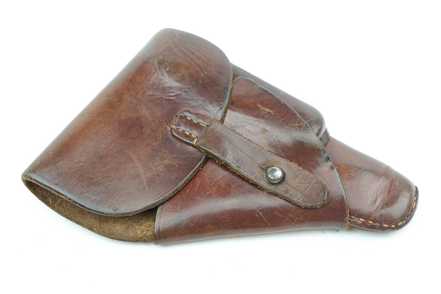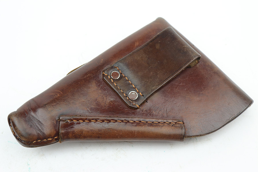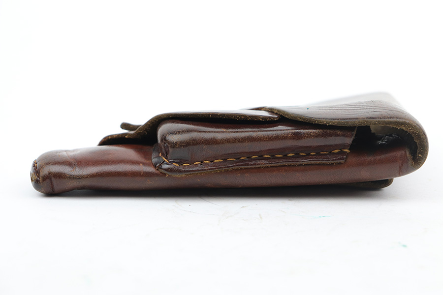 10/4/21 – This unmarked brown holster is intended for a Steyr 1908 or 1934. Manufactured during the WW2 era, this holster features an aluminum closure nut and rivets to secure the belt loop. The stitching is mostly intact. The leather is in good condition with only minor wear and tear throughout.