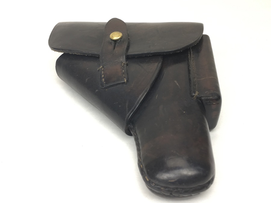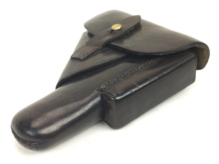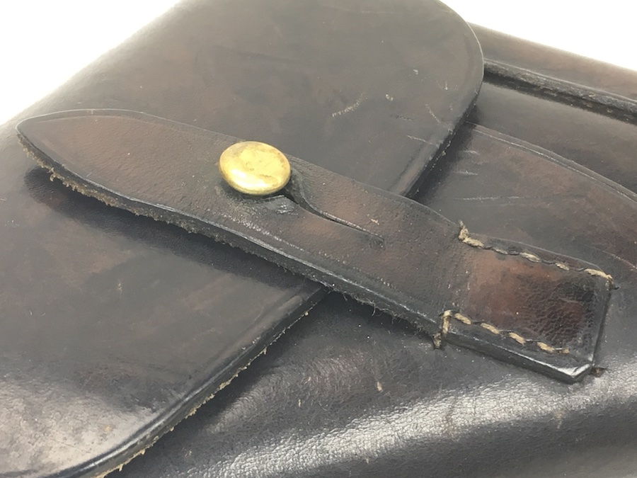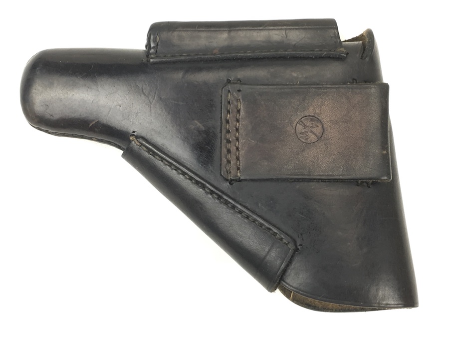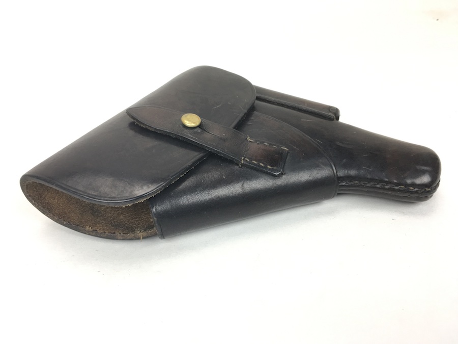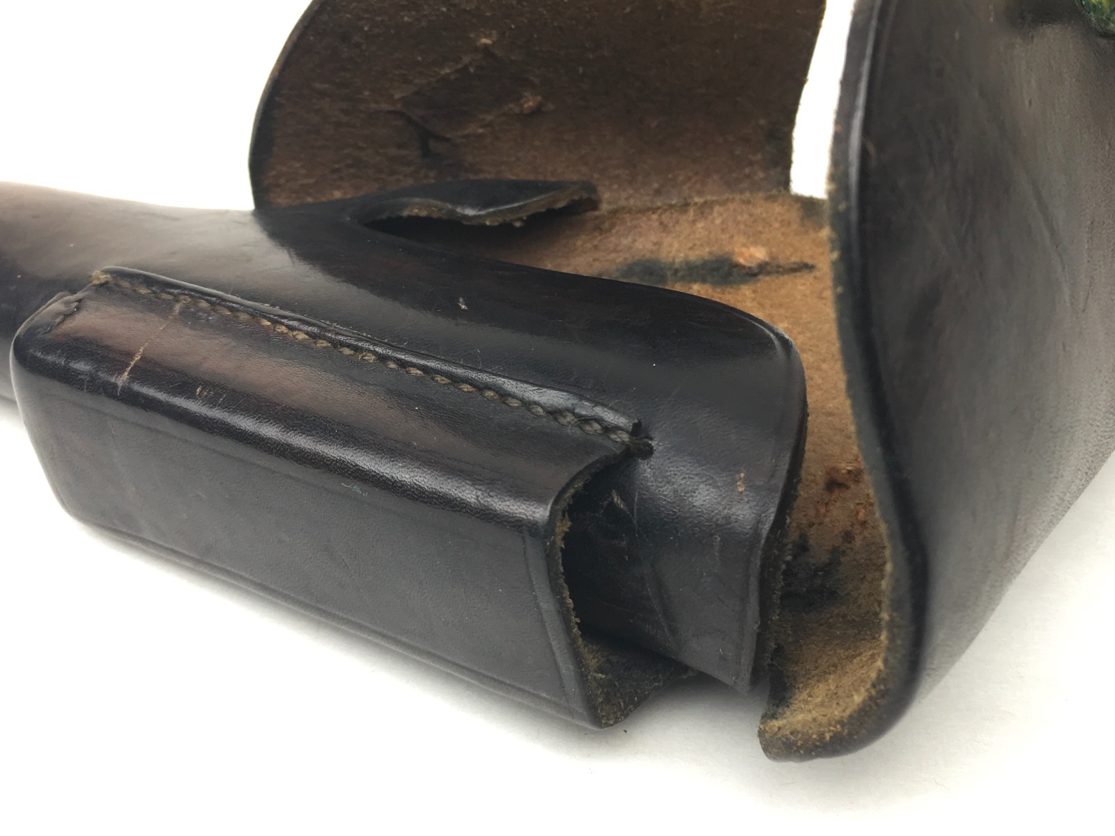4/18/19 – This is an original, minty condition Maurice WIdforss leading edge holster. A scarce holster not often seen. Made for a pre WWII Swedish contract PP pistol. Maker stamped on the belt loop with “M W” The deep brown leather and stitching are in excellent condition. Some minor surface wear and scuffs, but very attractive. The interior leather is clean. Made in the 1930s – note the early brass closure knob.