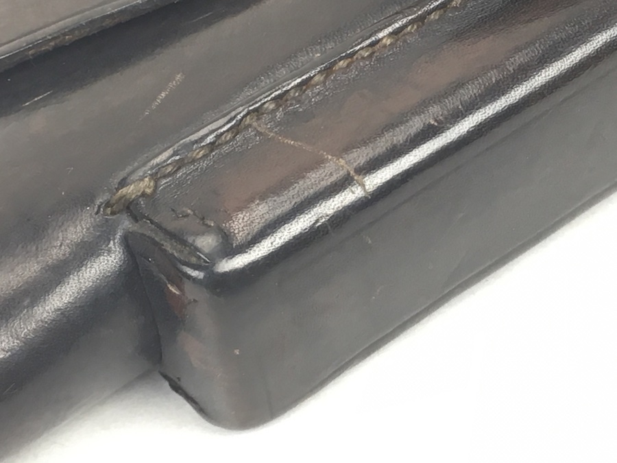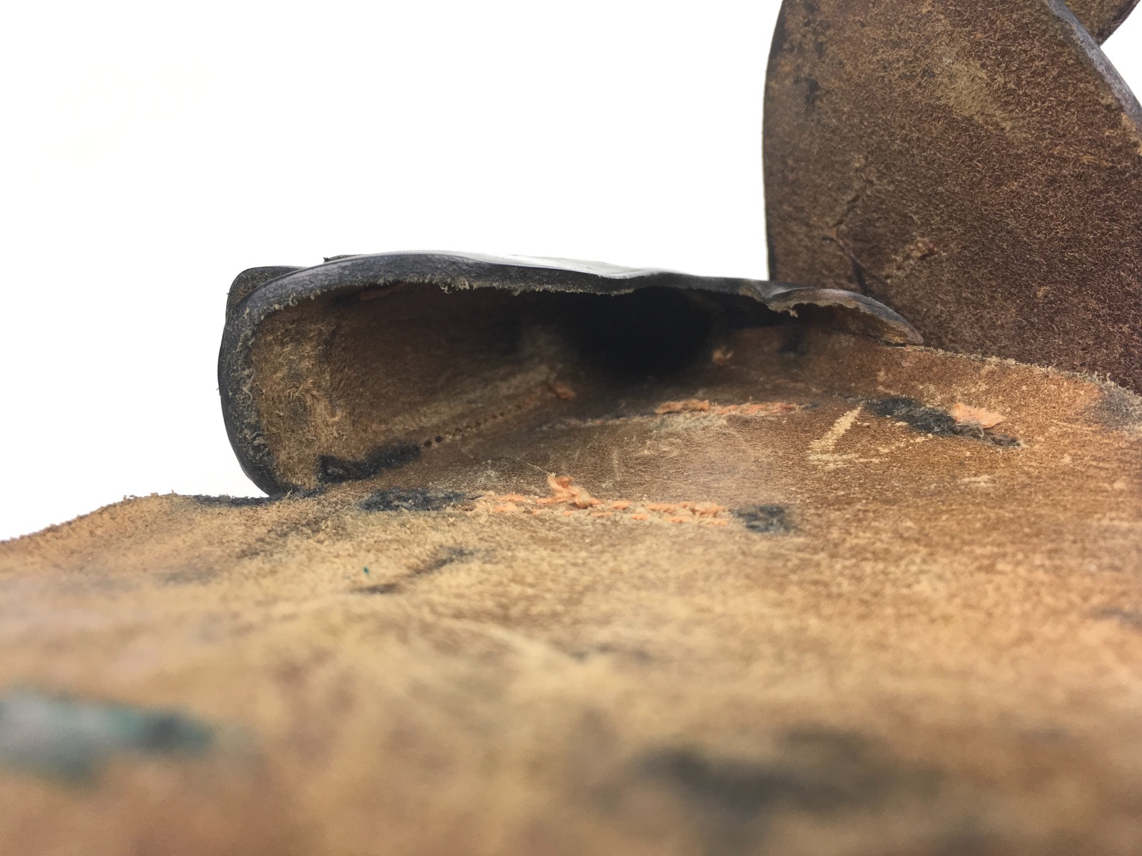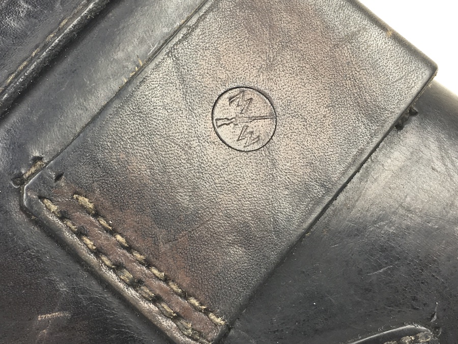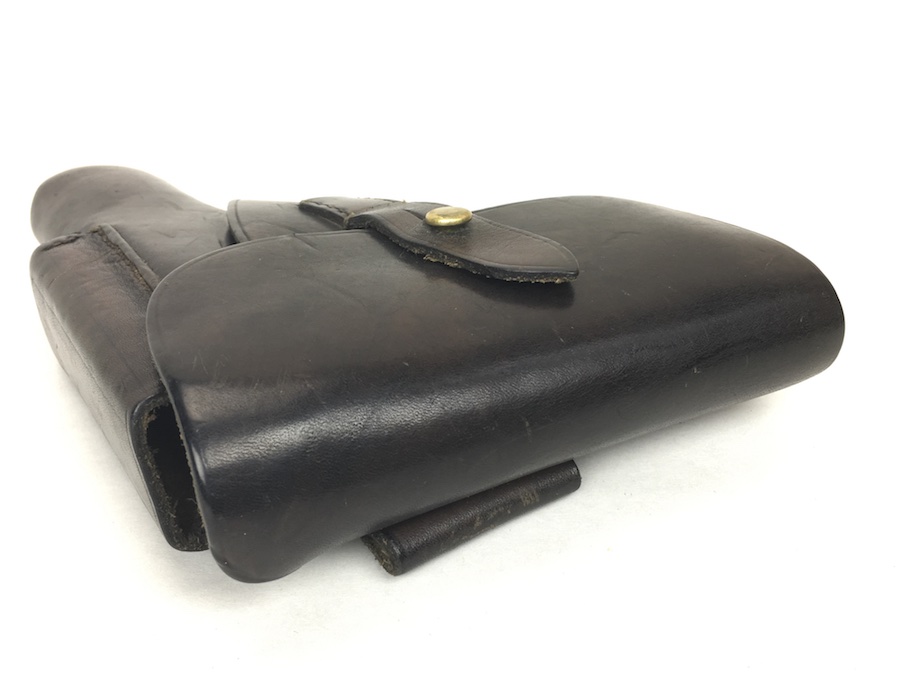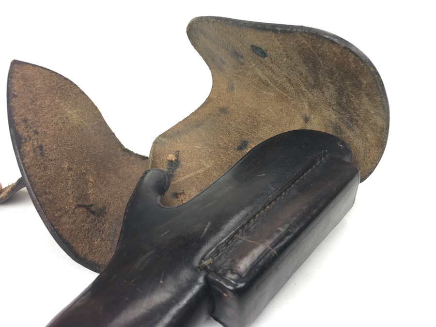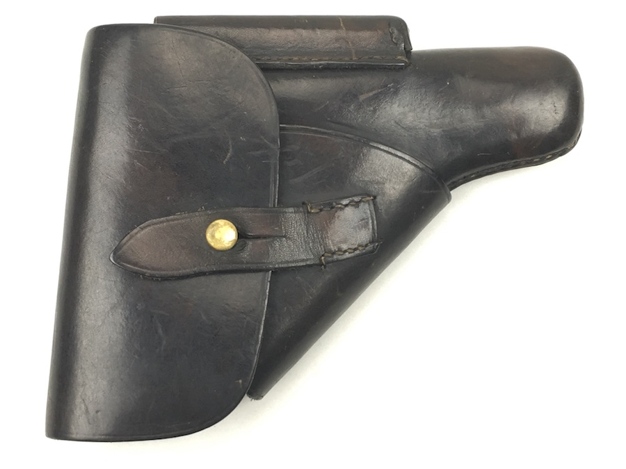 4/18/19 – This is an original, minty condition Maurice WIdforss leading edge holster. A scarce holster not often seen. Made for a pre WWII Swedish contract PP pistol. Maker stamped on the belt loop with “M W” The deep brown leather and stitching are in excellent condition. Some minor surface wear and scuffs, but very attractive. The interior leather is clean. Made in the 1930s – note the early brass closure knob.