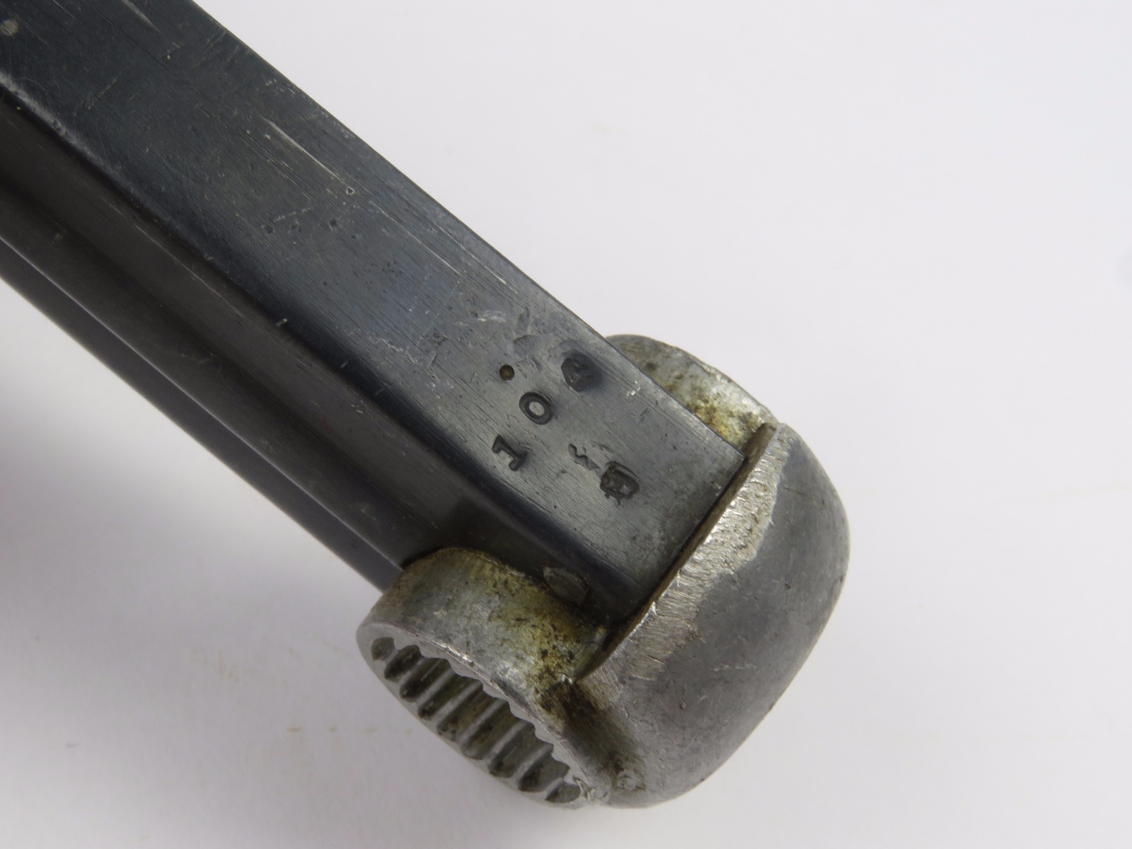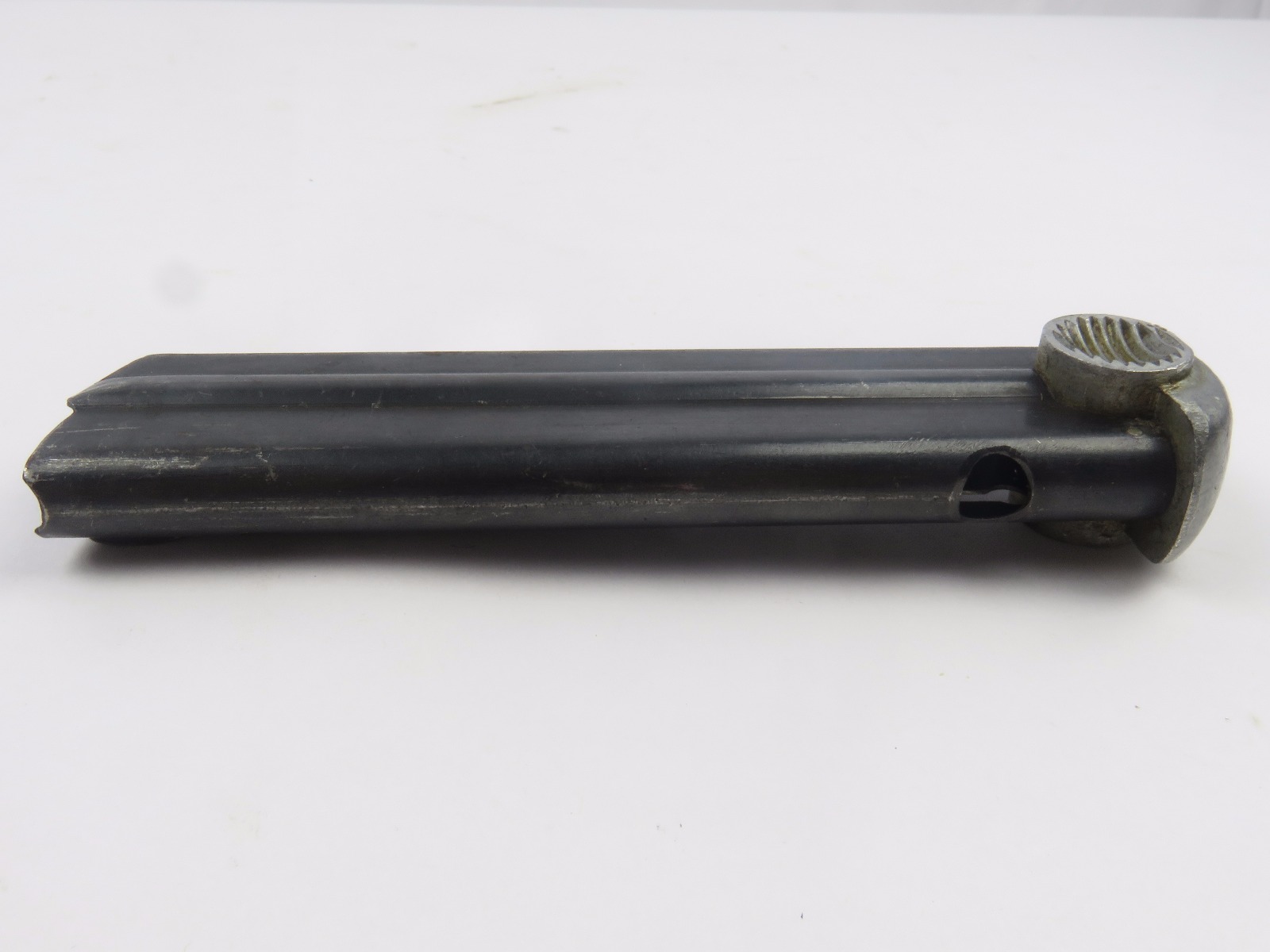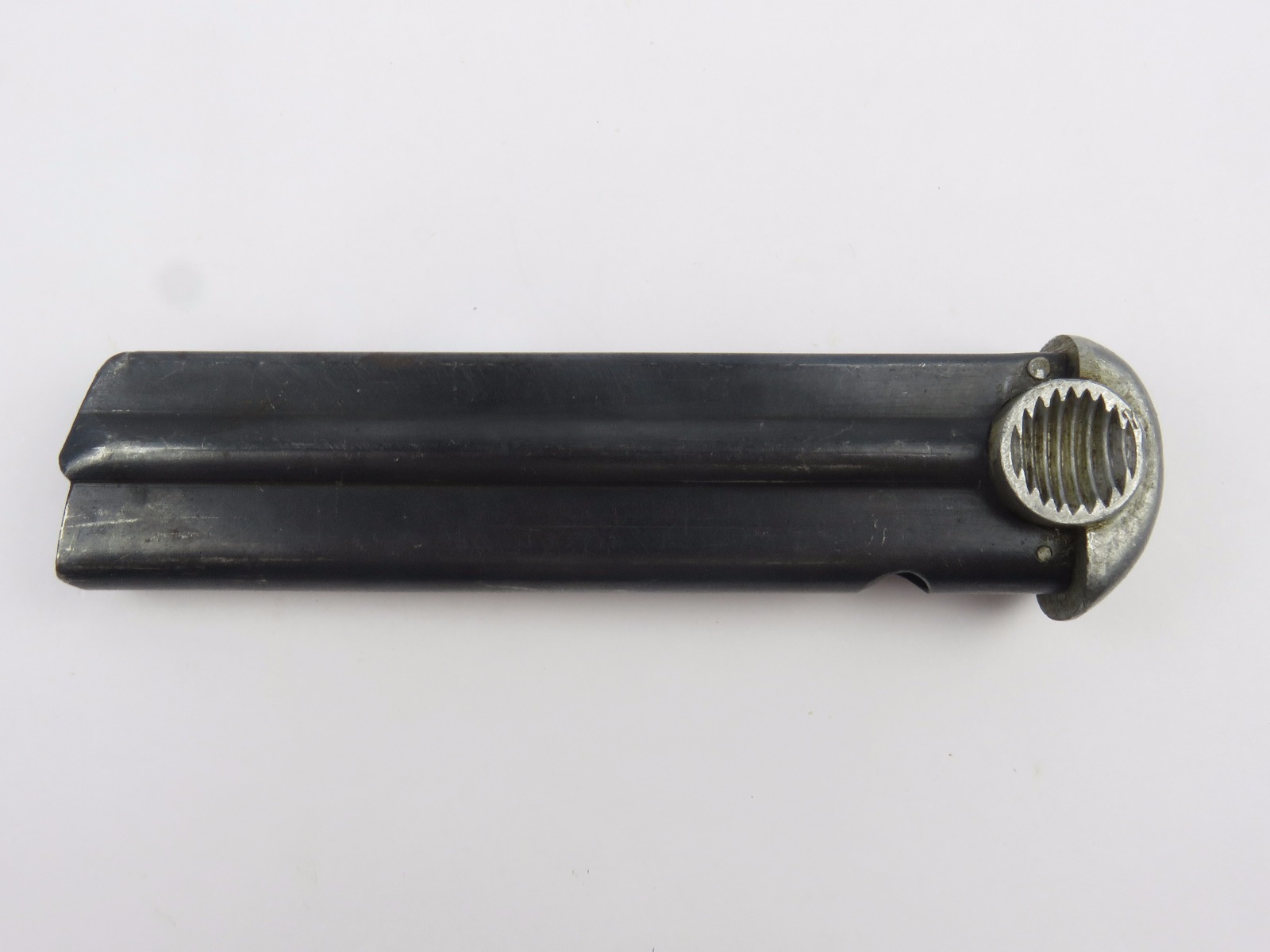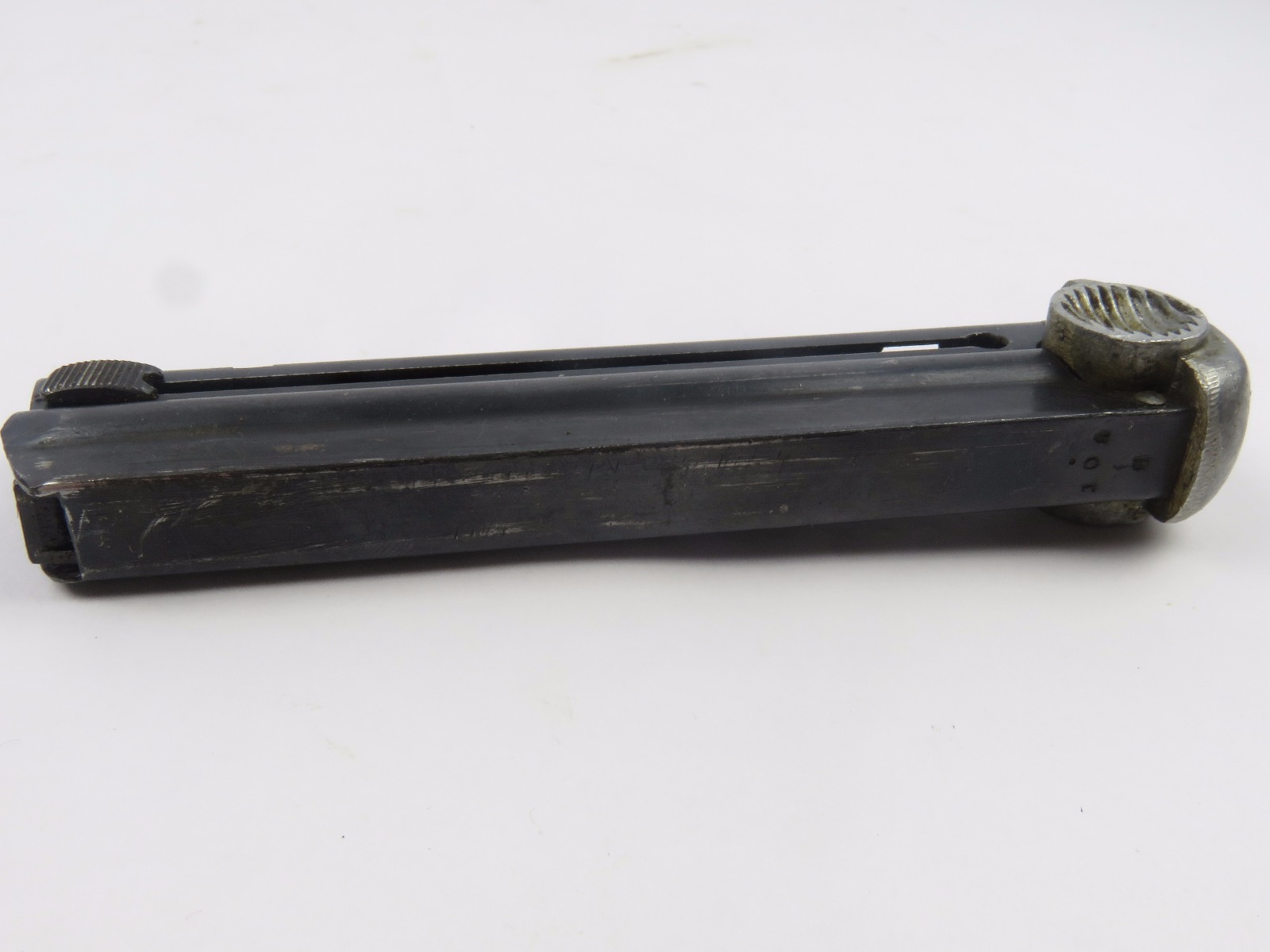 10/25/17 – This is an original WW2 production Type 14 nambu magazine. The magazine is blued with a 3 digit serial number stamped into the spine. There is some light surface wear, but overall the magazine is in excellent condition with a strong fully functional spring.