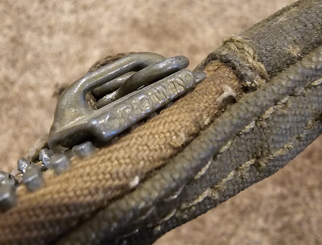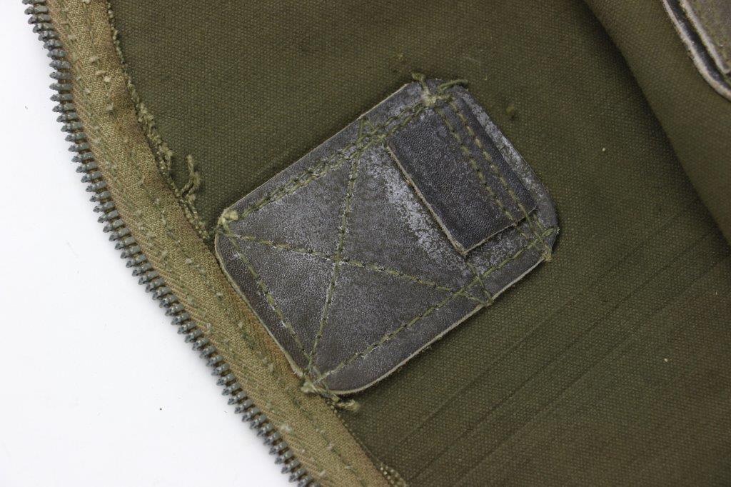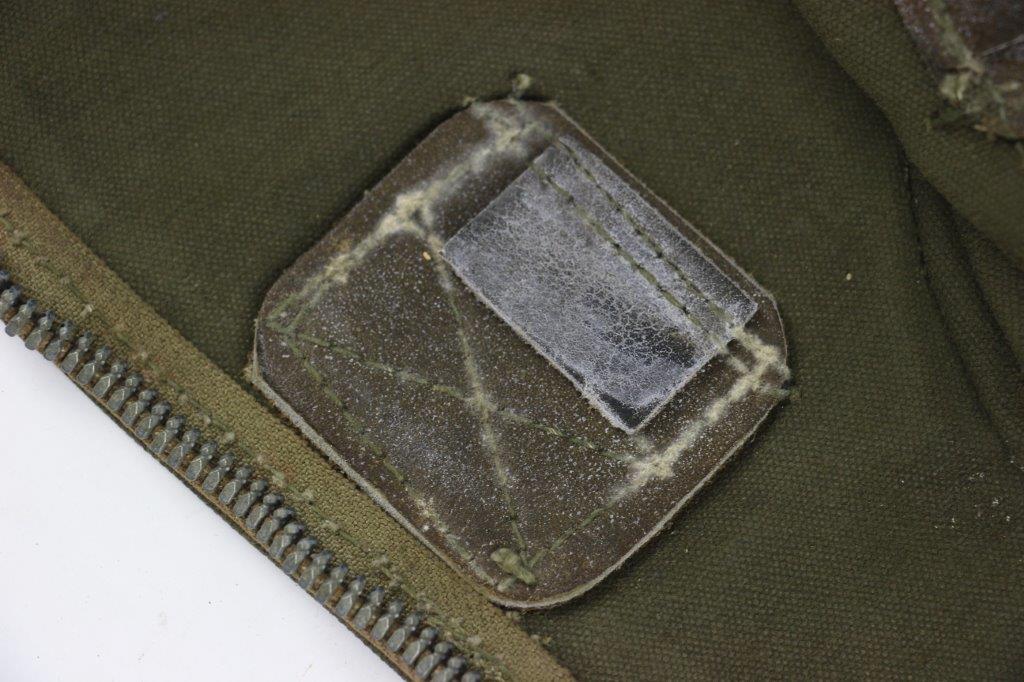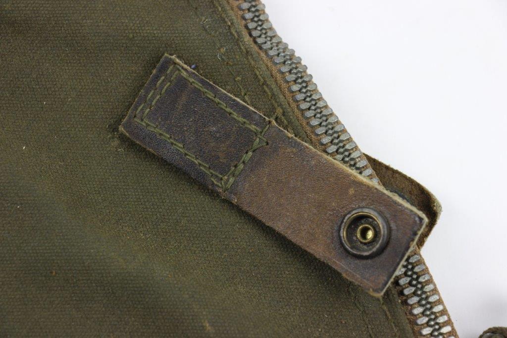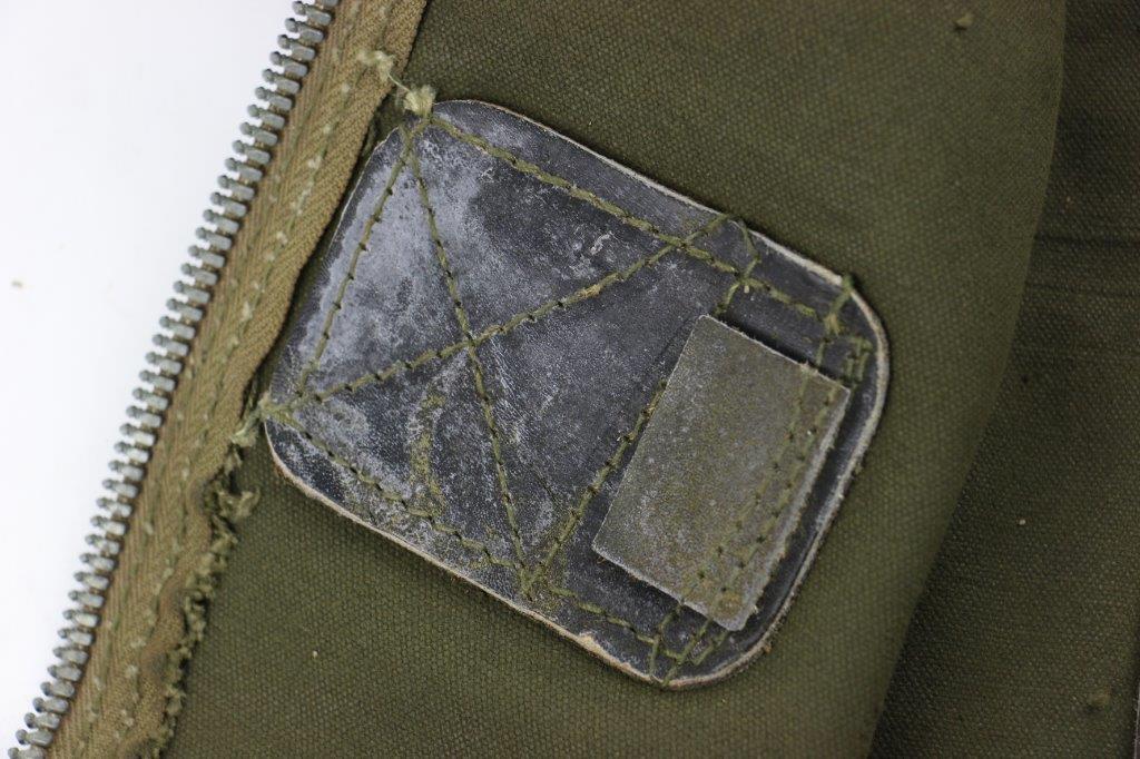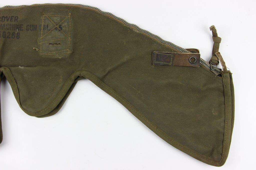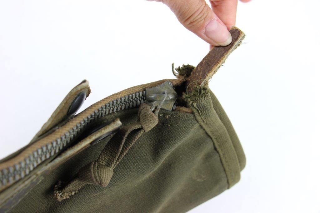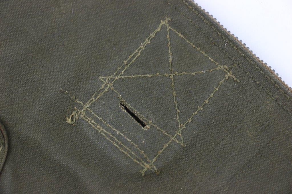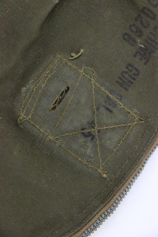 8/8/24 – This is a WW2 US Canvas Carry / Transport Case for the Thompson M1928 and M1A1 Submachine Gun. Sized for the standard 10.5 inch barrel and standard foregrip. Constructed from thick olive green canvas that’s in great overall condition with some mild wear from age and handling. The zipper is nonmagnetic and marked “CROWN / USA” on either side. Fully functional with a canvas weave pull tab on top. One side of the canvas is ink stamped, “COVER THOMPSON SUB-MACHINE GUN CAL .45 050268”. Each side has two leather tabs with a snap buckle for quick attach / detachment. Some surface wear on the leather tabs, and light surface aging on the interior leather reinforced areas.