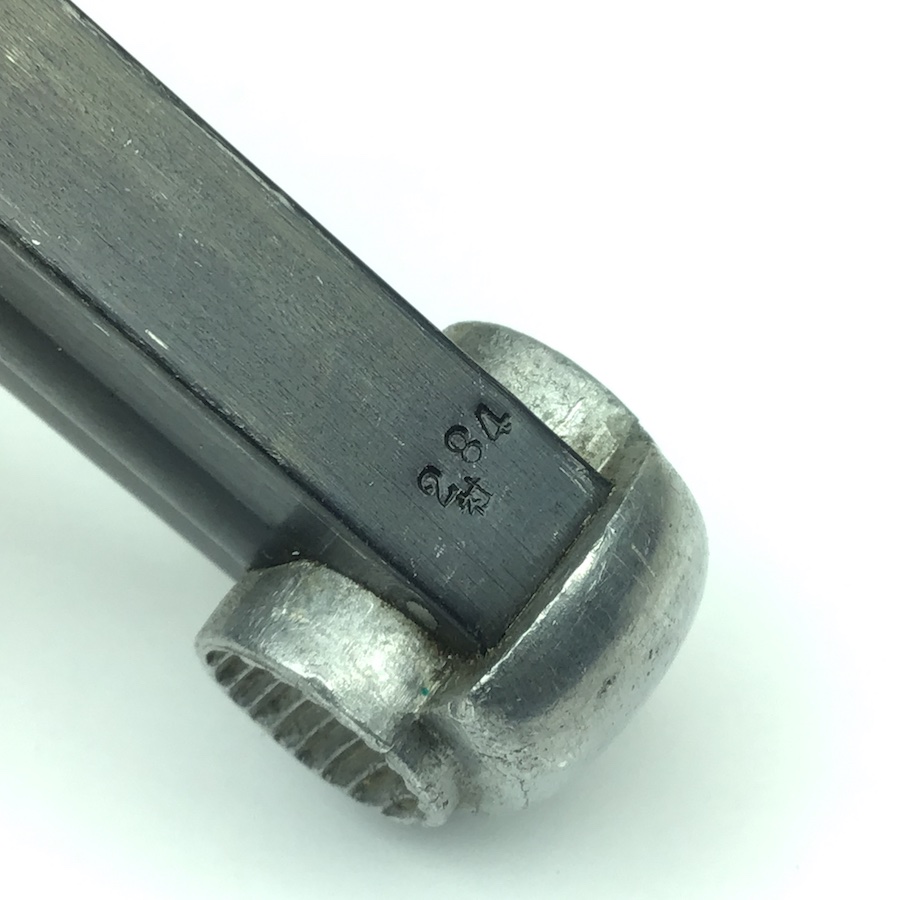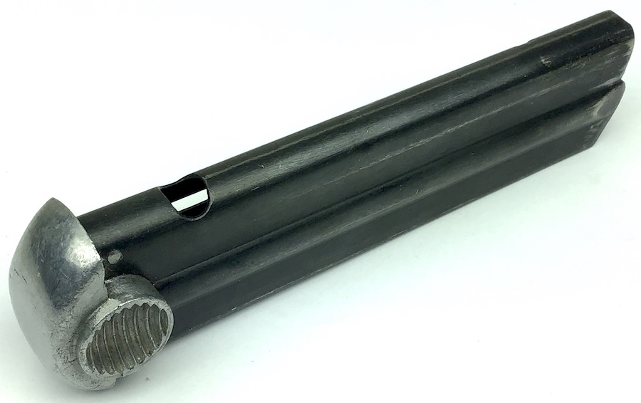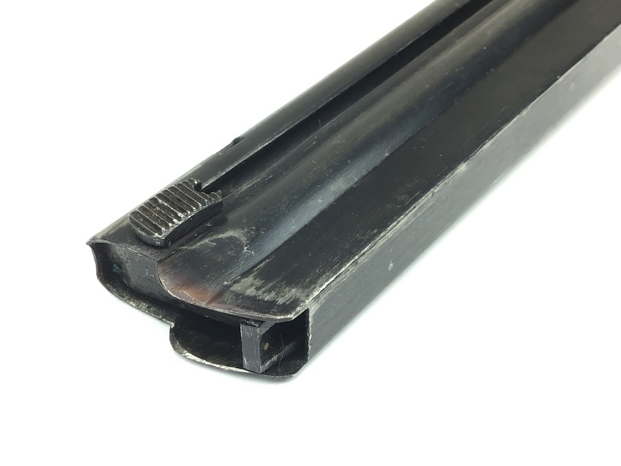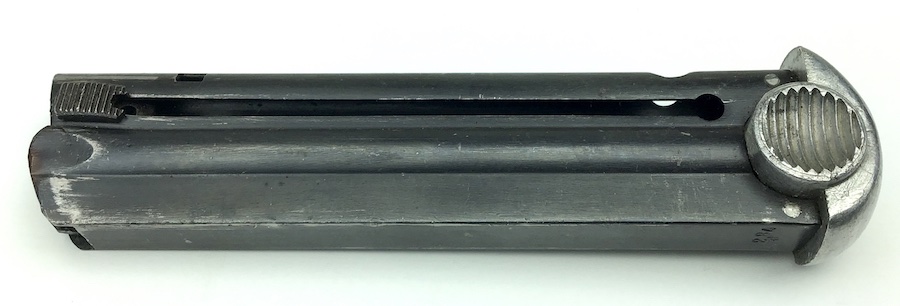 3/19/20 – This is an original WW2 era blued T14 Nambu magazine in excellent condition. The spine of the magazine is serial numbered 284. The bluing on the frame is excellent with no rust or pitting and very minimal wear. The spine has some minor wear. Bottom of the magazine is excellent and unmarked. Spring is excellent as well. Guaranteed original from WW2.