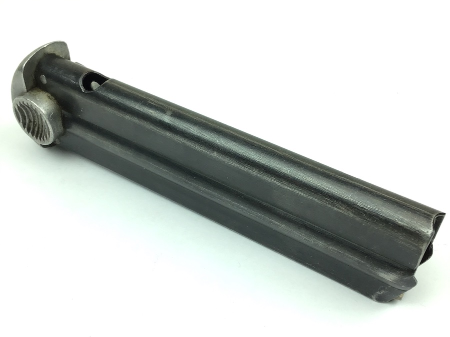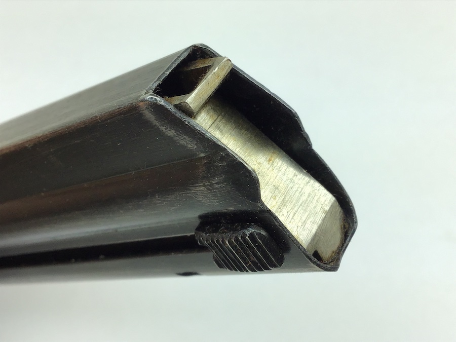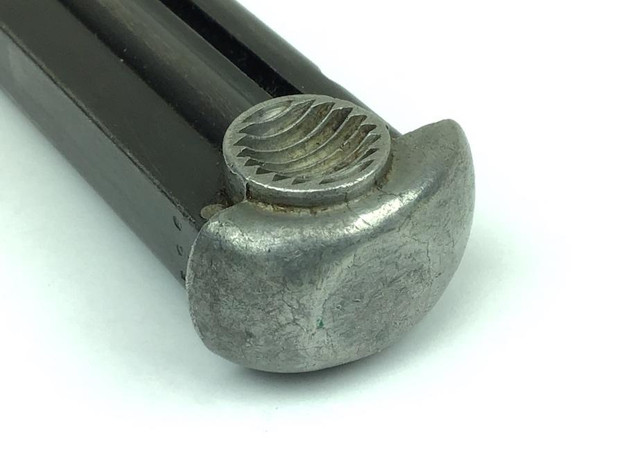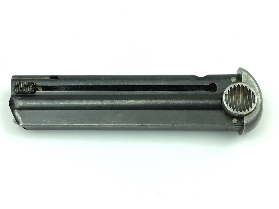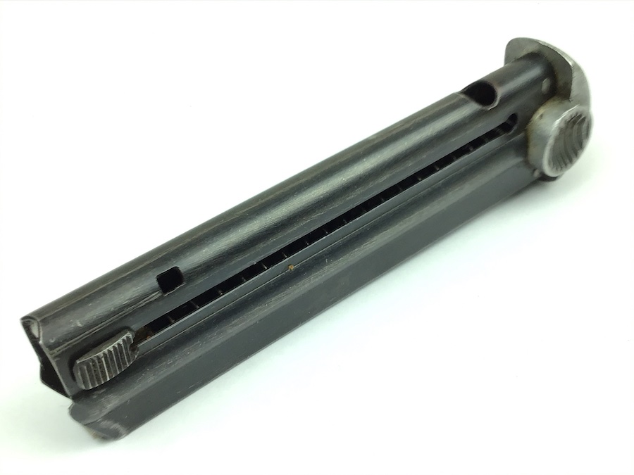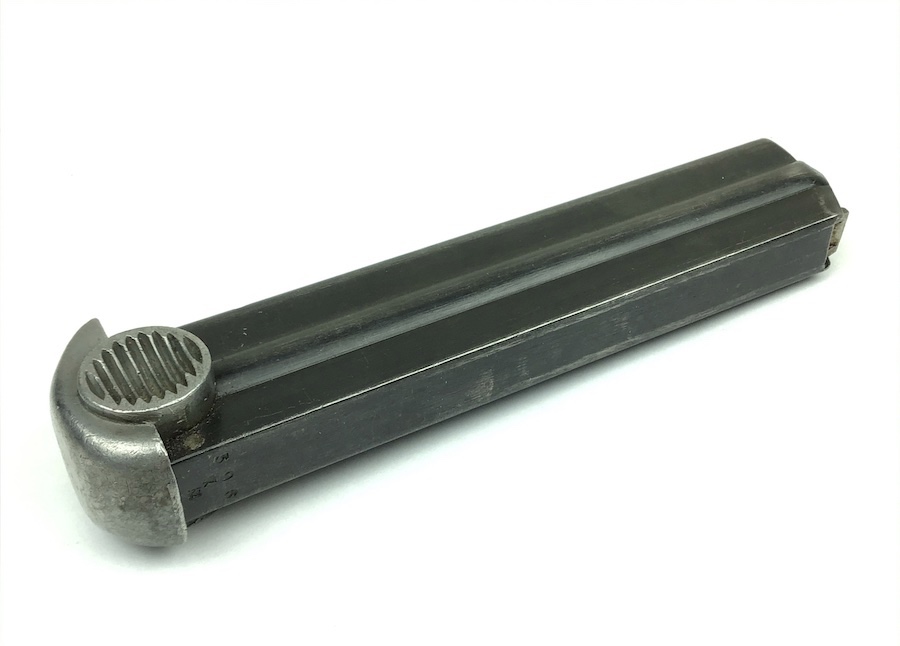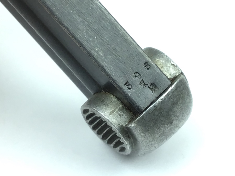 6/10/20 – This is an original WW2 era blued T14 Nambu magazine in excellent condition. The spine of the magazine is serial numbered 596. The bluing on the frame is excellent with no rust or pitting and very minimal wear. The spine has some minor wear. Bottom of the magazine is excellent and unmarked. Spring is excellent as well.
