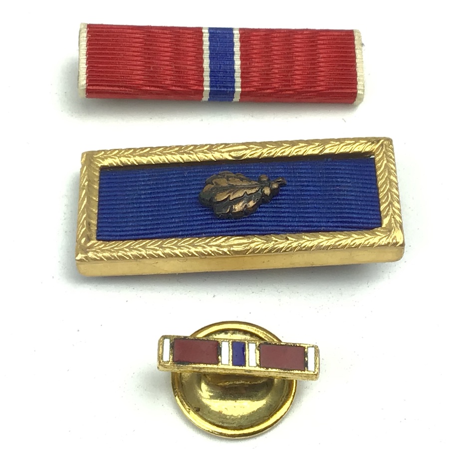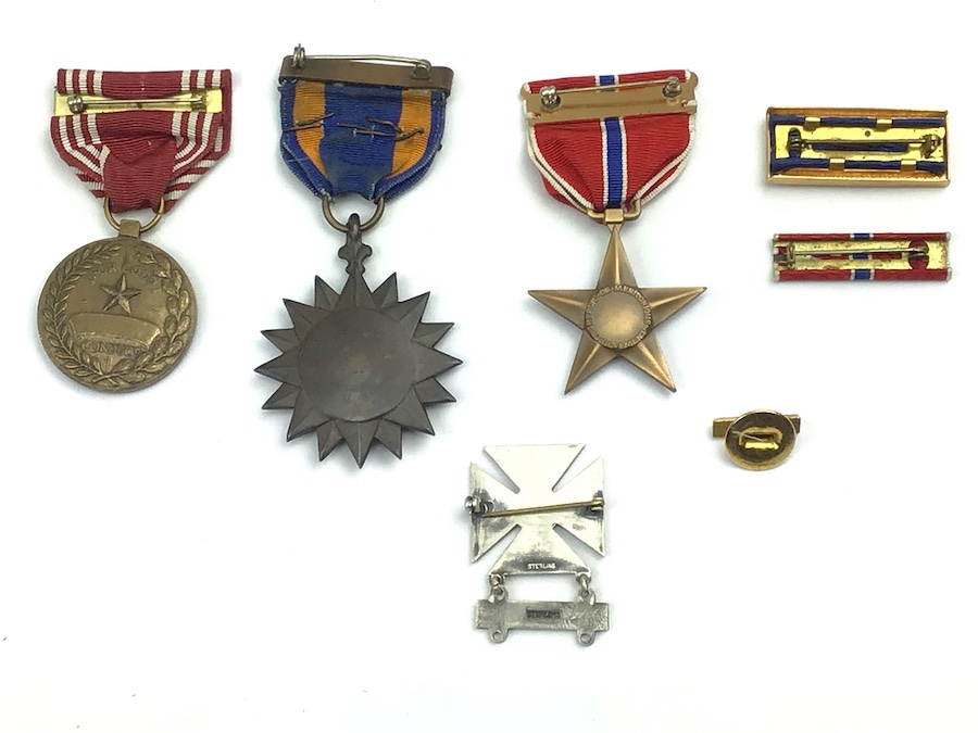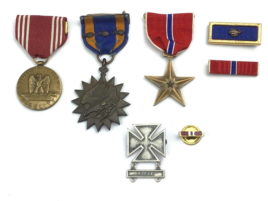 11/16/20 – This collection of medals are in excellent condition. Mostly US Army related. US Army Rifle Marksman – US Army Bronze Star – US Army Good Conduct Medal – Air Medal for meritorious service. All WW2 era originals.