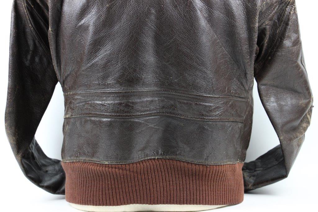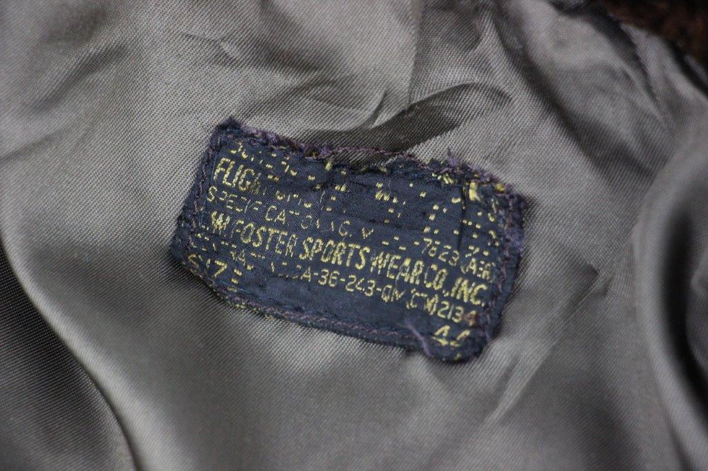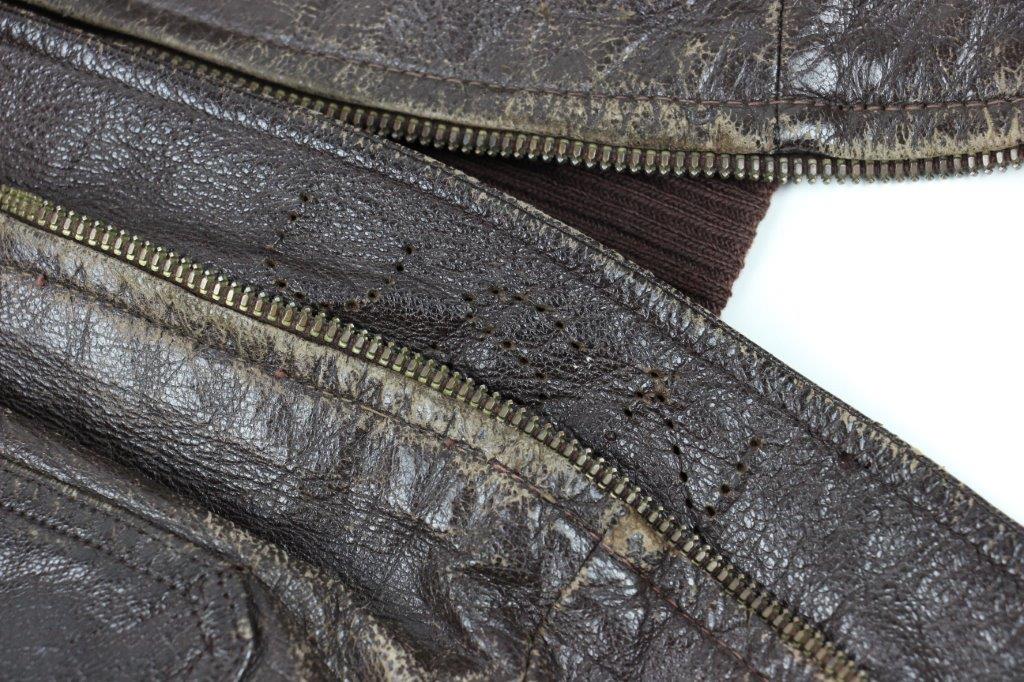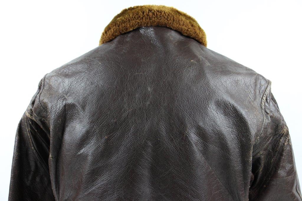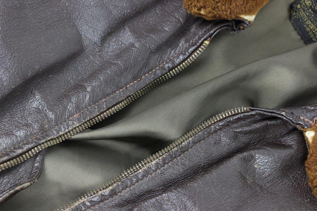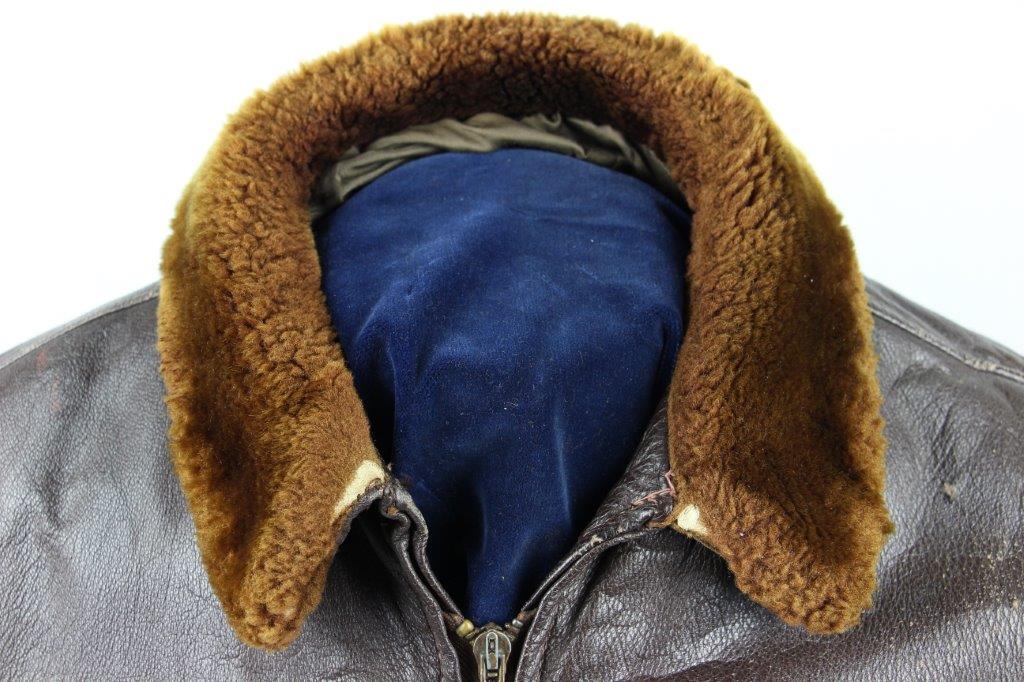 3/21/24 – This is an original example of a US Aviator Jacket from WW2. These jackets were popular throughout WW2, Korea, and Vietnam wars, and are highly sought after by collectors in today’s market. This example is unembellished with no exterior patches or insignia. Great overall condition with some natural use and aging wear on the exterior leather. This mostly consists of wrinkling and scuffing on the corners and crevasses / high rub areas of the leather exterior. No holes or major issues however, and normal pliability throughout. The cloth hem and sleeve-ends of the jacket are excellent and strong with good elasticity. The wool collar has some minor edge wear but is in great overall condition and intact. The interior zipper-siding is embroidered with small holes that spell “USN”. All buttons and zippers are fully intact and functional. Clean interior brown silk lining and original tag is still intact and attached. The tag is slightly frayed and worn, but the size is still legible, “44” (Large). See photos.