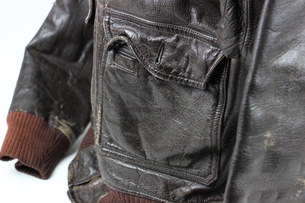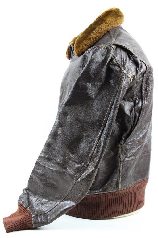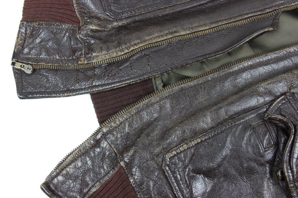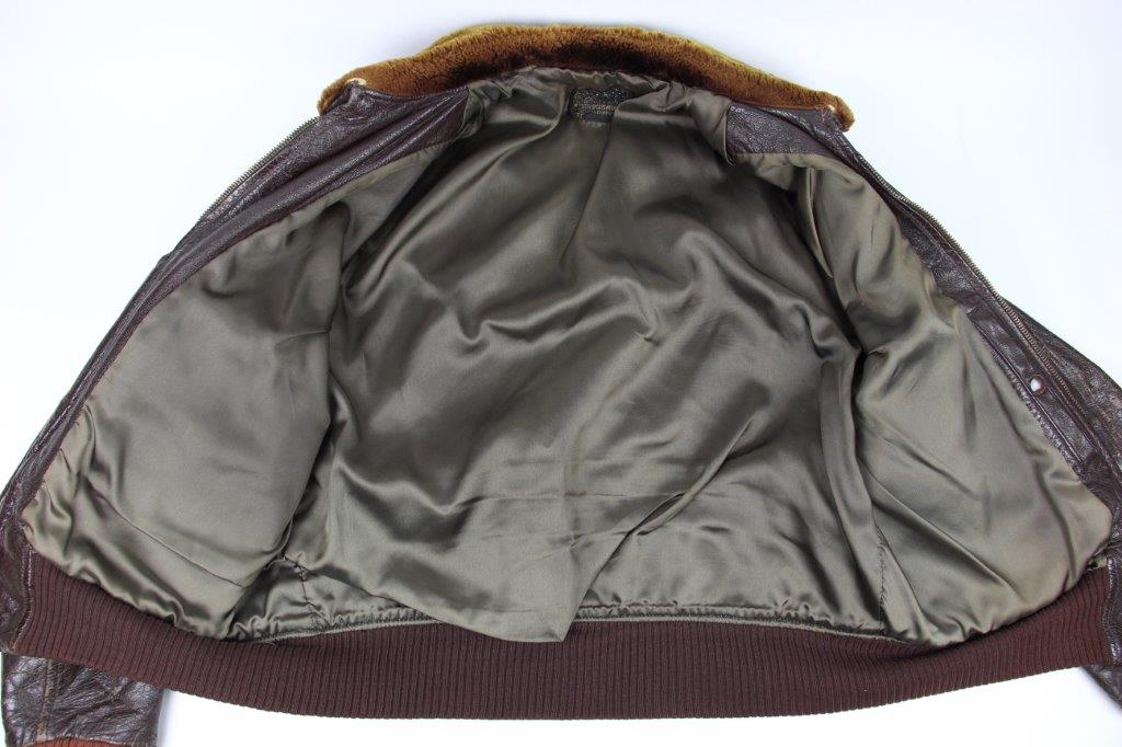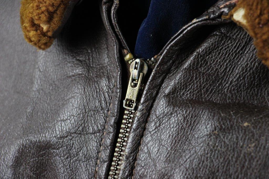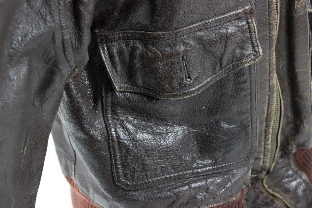 3/21/24 – This is an original example of a US Aviator Jacket from WW2. These jackets were popular throughout WW2, Korea, and Vietnam wars, and are highly sought after by collectors in today’s market. This example is unembellished with no exterior patches or insignia. Great overall condition with some natural use and aging wear on the exterior leather. This mostly consists of wrinkling and scuffing on the corners and crevasses / high rub areas of the leather exterior. No holes or major issues however, and normal pliability throughout. The cloth hem and sleeve-ends of the jacket are excellent and strong with good elasticity. The wool collar has some minor edge wear but is in great overall condition and intact. The interior zipper-siding is embroidered with small holes that spell “USN”. All buttons and zippers are fully intact and functional. Clean interior brown silk lining and original tag is still intact and attached. The tag is slightly frayed and worn, but the size is still legible, “44” (Large). See photos.