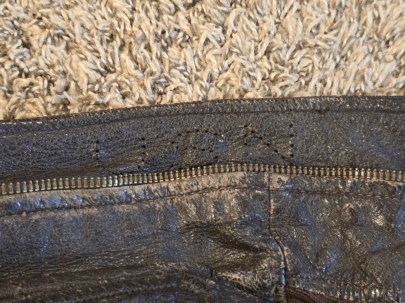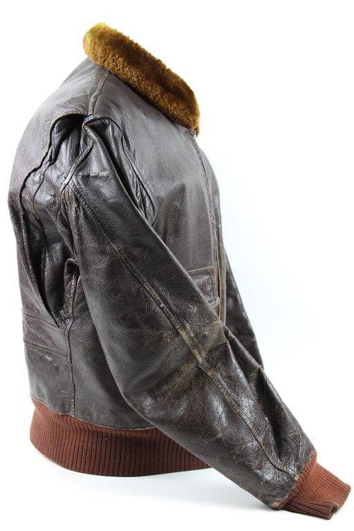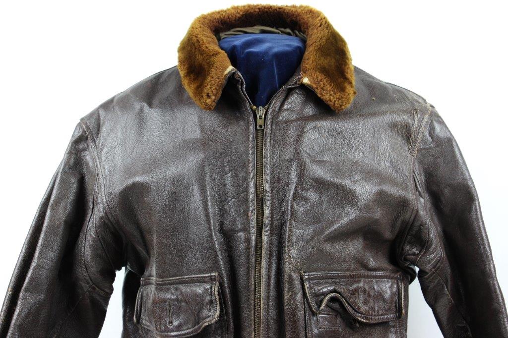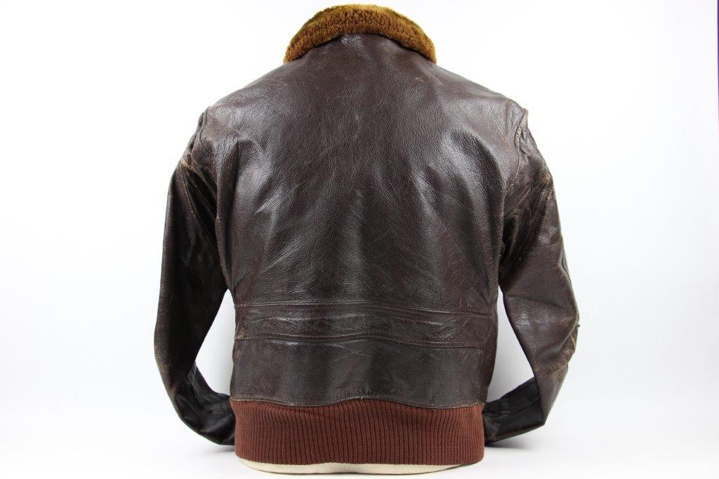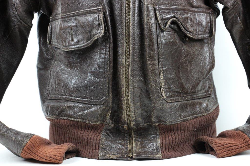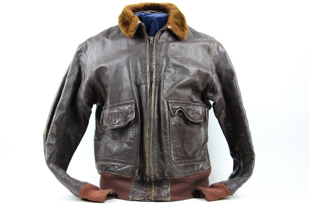 3/21/24 – This is an original example of a US Aviator Jacket from WW2. These jackets were popular throughout WW2, Korea, and Vietnam wars, and are highly sought after by collectors in today’s market. This example is unembellished with no exterior patches or insignia. Great overall condition with some natural use and aging wear on the exterior leather. This mostly consists of wrinkling and scuffing on the corners and crevasses / high rub areas of the leather exterior. No holes or major issues however, and normal pliability throughout. The cloth hem and sleeve-ends of the jacket are excellent and strong with good elasticity. The wool collar has some minor edge wear but is in great overall condition and intact. The interior zipper-siding is embroidered with small holes that spell “USN”. All buttons and zippers are fully intact and functional. Clean interior brown silk lining and original tag is still intact and attached. The tag is slightly frayed and worn, but the size is still legible, “44” (Large). See photos.