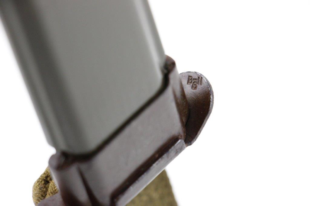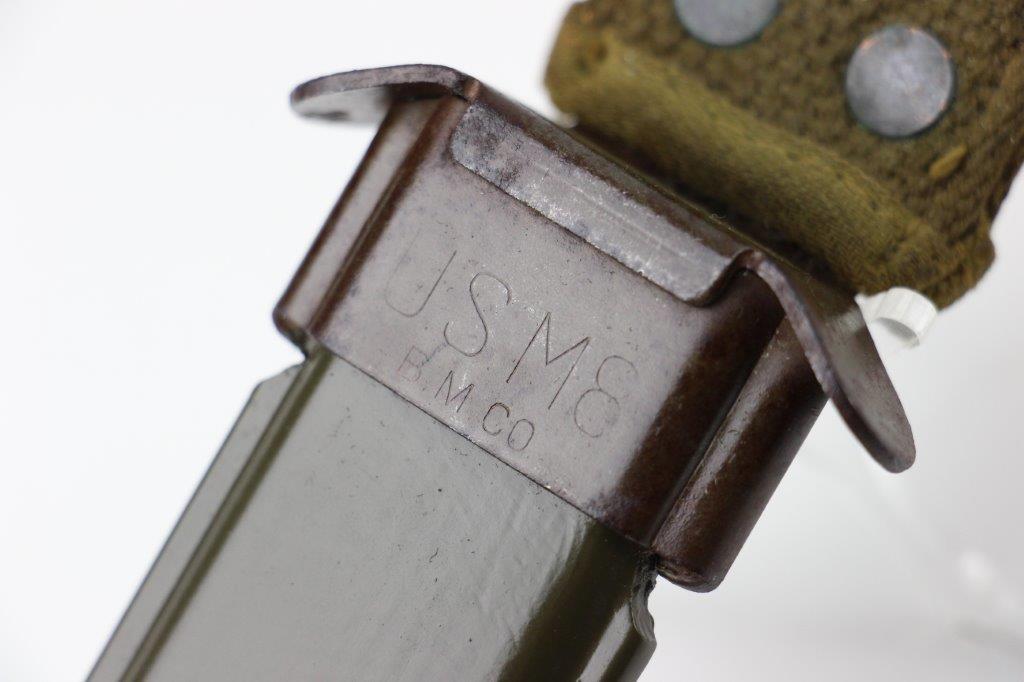 6/24/24 – This is an original WW2 US M3 Fighting Knife by Camillus. The knife is all original and comes with an early style US M8 scabbard with a short canvas frog. The knife has original blued finish throughout with some high edge wear and light finish loss but no major issues. The edge shows uniform sharpening throughout, and is clean with mild signs of honest use wear. The blade is maker stamped as shown. The hand guard and pommel are in great condition with original finish still intact. There’s a crisp ordnance stamp on the pommel, which is properly pinned twice to the handle. The handle is tight and excellent. Light patina on the scabbard but no major issues. Overall a great example of an iconic USM3 Fighting Knife.